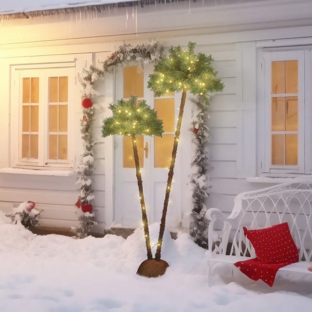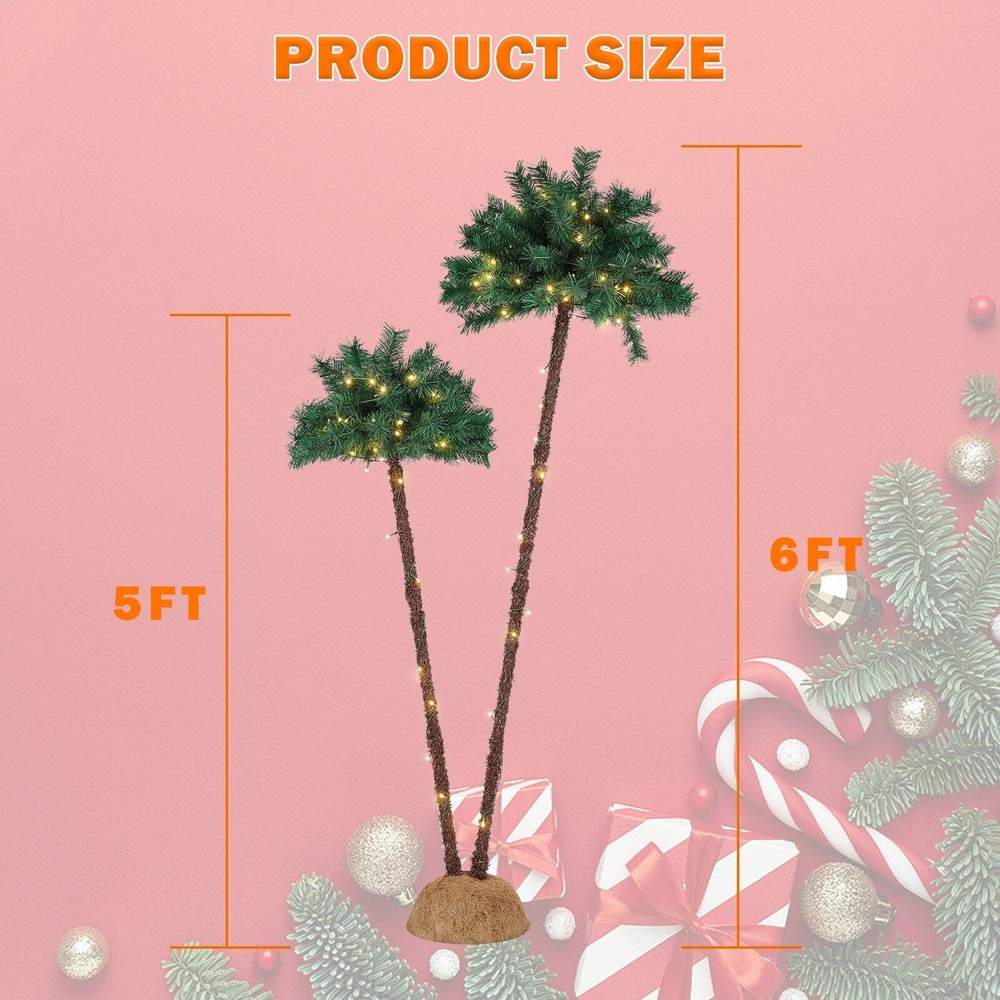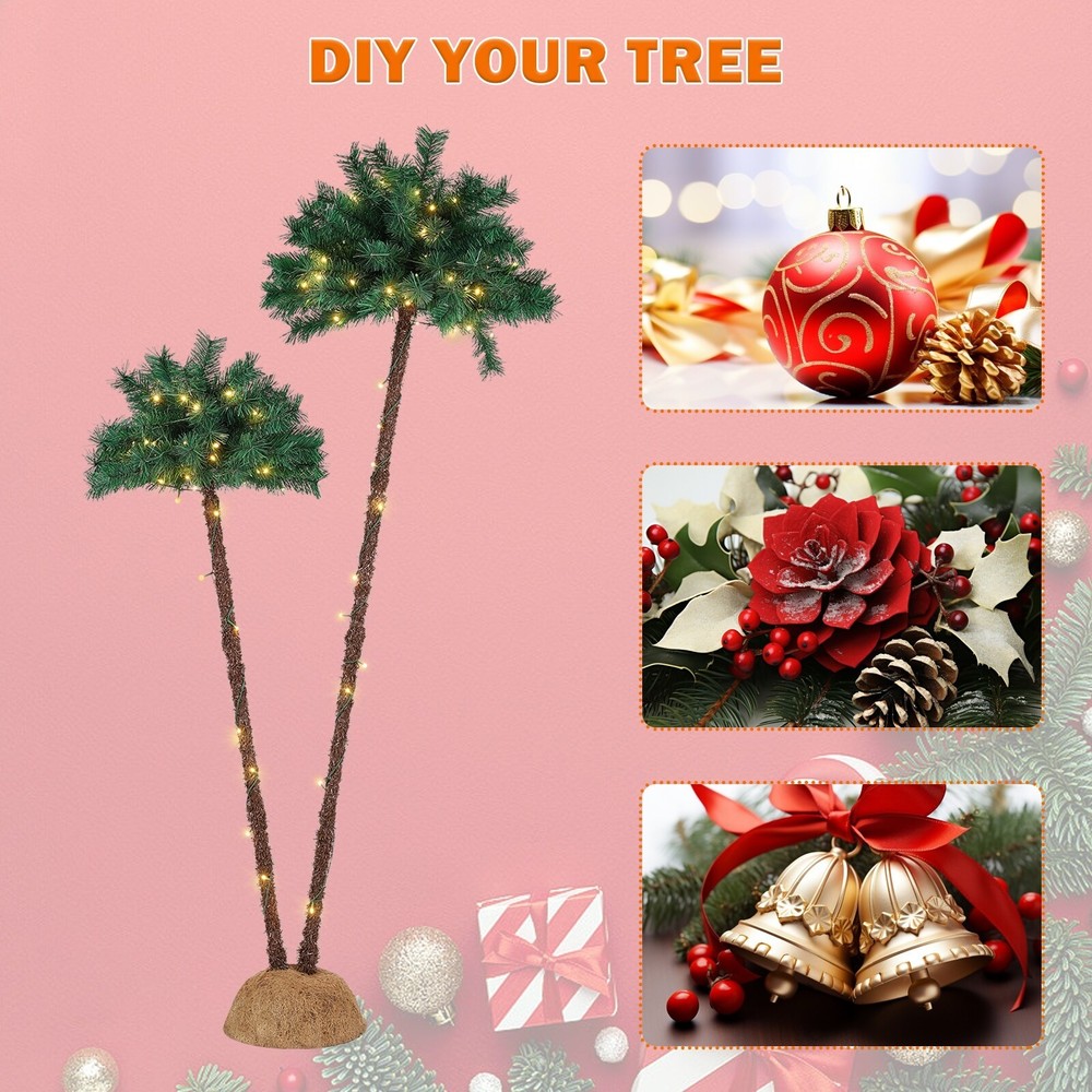The Christmas palm tree concept is a creative twist, bringing a tropical vibe to the holiday season. This can be a refreshing departure from traditional Christmas tree designs and can be particularly appealing for those in warmer climates.The realistic appearance of the 100% PVC Pine needles adds authenticity, giving the tree a natural look. This feature makes it suitable for various settings, including homes, offices, supermarkets, malls, porches, and both indoor and outdoor spaces.The sturdy structure with a stable base and detachable branches ensures easy installation and storage, providing convenience for users. This feature is especially useful for those who may want to use the decoration in different locations or store it compactly during the off-season.The safety measures, such as Free Shipping Over $49.99* Details LED Palm Tree Christmas Tree Product Description: The Christmas palm tree concept is a creative twist, bringing a tropical vibe to the holiday season. This can be a refreshing departure from traditional Christmas tree designs and can be particularly appealing for those in warmer climates. The realistic appearance of the 100% PVC Pine needles adds authenticity, giving the tree a natural look. This feature makes it suitable for various settings, including homes, offices, supermarkets, malls, porches, and both indoor and outdoor spaces. The sturdy structure with a stable base and detachable branches ensures easy installation and storage, providing convenience for users. This feature is especially useful for those who may want to use the decoration in different locations or store it compactly during the off-season. The safety measures, such as the 6.5ft waterproof power cord and approval for indoor/outdoor use, make it a reliable choice. This is crucial for ensuring a safe and enjoyable experience for users, particularly when the decoration is placed outdoors.
