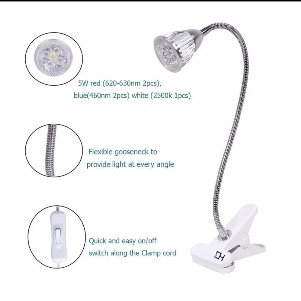 LED Plant Grow Lights 5W Clip Desk Lamp with 360 Degree Flexible Gooseneck Condition: Excellent Pre-Owned Condition. No Flaws ACCELERATE PLEANT GLOWTH: The light helps accelerate the growth of indoor plants. Emits the wavelength of light which can be fully absorbed by the plants photosynthesis, best for blooming and fruit & for promoting the leaf, can rapidly improve the health of plant and growing. IMPROVED LIGHT HEAD: Improved head of the lamp, it is thicker and smoother than used to be. You won’t cut your fingers any more. Thicker cover provides better heat dissipation too. S1