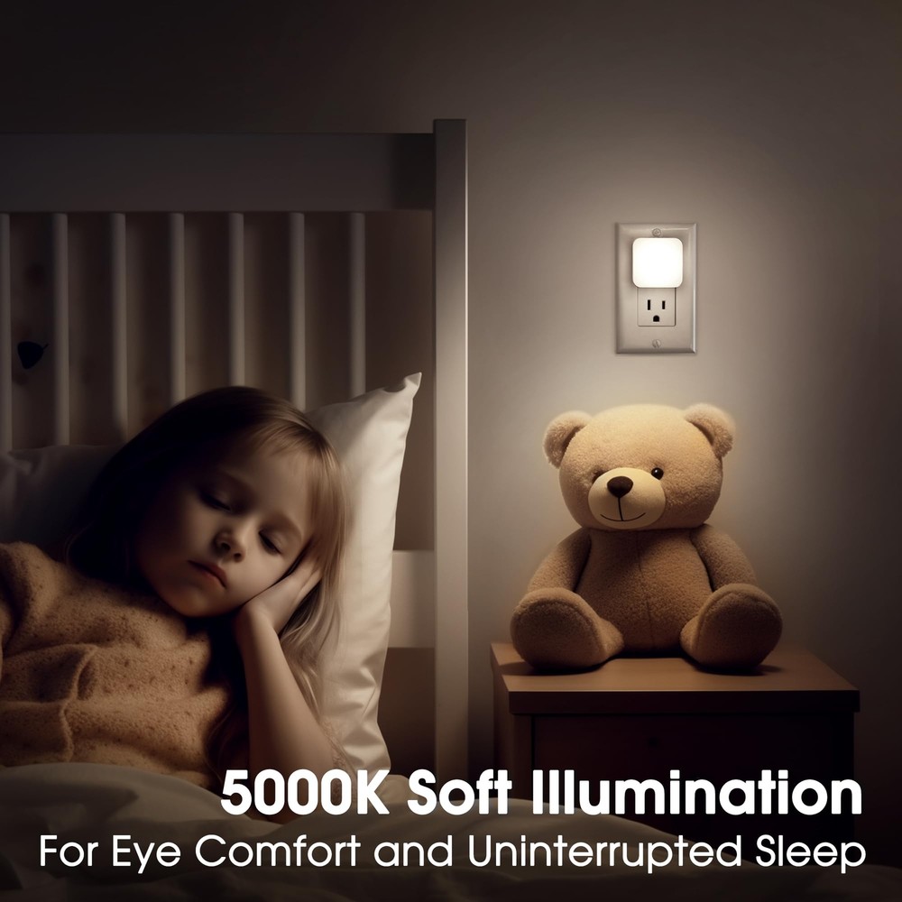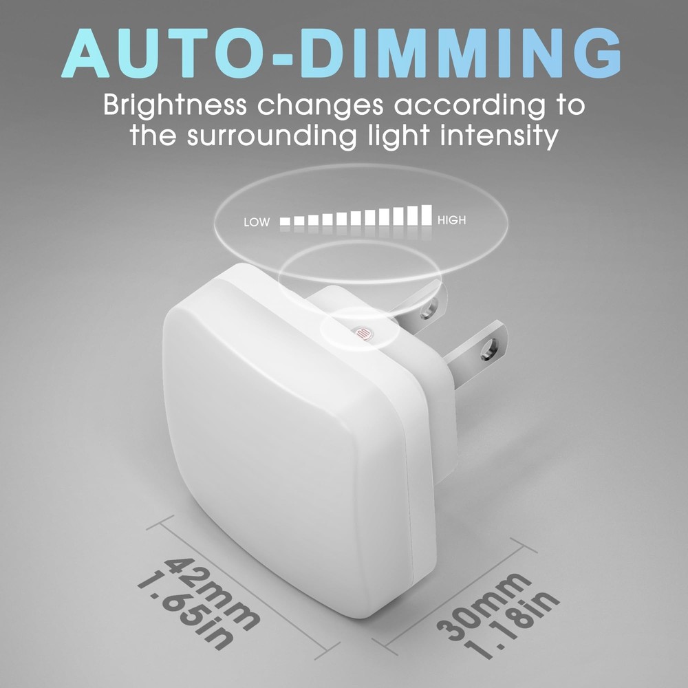 LED Night LIght Automatic Illumination: Our plug in night light features a built-in smart light sensor, ensuring it automatically turns on at night and off at dawn. Perfect for nighttime baby feedings, guiding your way in the dark, and aiding pets in finding food or water. Soft and Gentle Glow: Equipped with high-quality LED chips, our plug-in night light emits a soft 5000K daylight white glow. Designed to be easy on the eyes, it eliminates dazzling and flicker, offering the perfect brightness for navigating in the dark without disrupting your or your baby's peaceful sleep. Sleek and Space-Saving Design: Designed in a square shape with careful consideration to size, our nightlights with light sensors maximize socket utilization, leaving your second outlet free for other devices. Versatile Use: The compact size and soft glow make our night light suitable for various applications. Whether in kids' rooms, bedrooms, bathrooms, living rooms, kitchens, stairways, or hallways, it's the ideal choice. Cost-Efficient Lighting: With a lifespan exceeding 30,000 hours and minimal 0.3W power consumption, LED Night Light combines durability with energy efficiency. For any concerns, us for quick and effective solutions.
