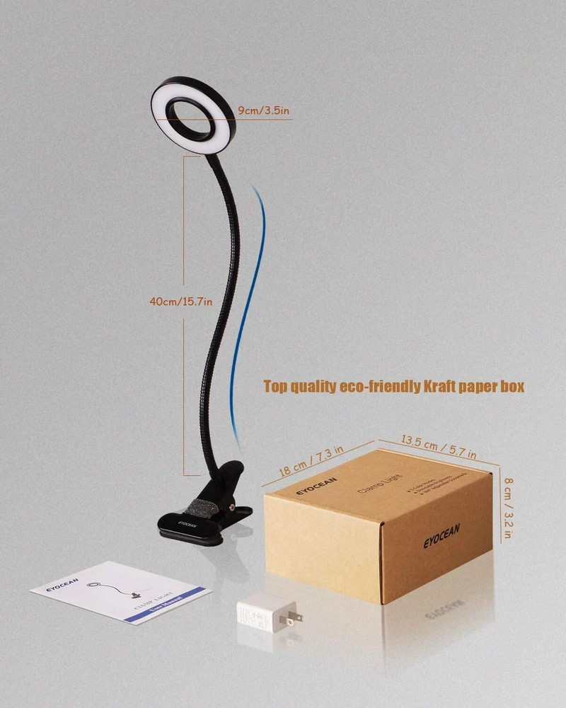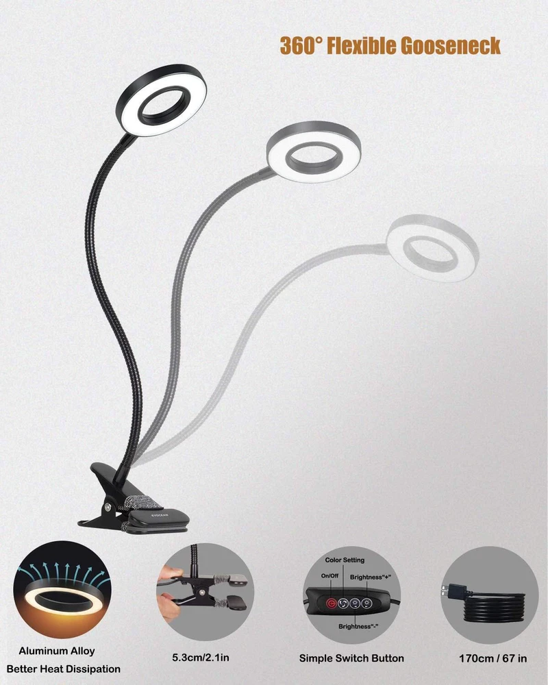 Eye Protection Soft, comfortable and non-flickering design, the lighting is friendly to your eyes and reduces eye fatigue, so you can enjoy what you're doing for longer. Choose Your Mode 3 lighting modes for you to choose: warm light, white light, and cool light. And 9 brightness levels you can adjust: dim and bright. 360° Flexible Gooseneck The 360° flexible gooseneck allows you to easily adjust the light to perfect angles as needed. Multiple Uses With sturdy clamp, so it can be used anywhere, such as computer desk, bed headboard, shelf. Specifications Wattage: 7W Body Material: ABS plastic & Aluminum Alloy LED Color: Warm white, Natural white, Cool white USB Charging Port: 5V/2A Color Temperature: 3000K ~ 6500K Neck Length: 15.6inch/40cm LED Panel:6.3*2.7inch/16*7cm USB chrage cable: 5.25ft/160cm Clamp Width :2.4inch Operating Temperature: -10℃ ~ 50℃ Net Weight: 15.2 ounces Certification: CE RoHS Package Content: 1 x Clamp Light 1 x Power Adapter 1 x User Manual Seller Warranty Lifetime Support Guarantee, 100% LIFETIME MONEY BACK GUARANTEE 【3 Lighting Modes & 10 Brightness Levels】- Clip On Light built-in 24 LEDs (12 Cool LEDs, 12 Warm LEDs). 3 Lighting Modes, warm white, natural white, and cold white. Each mode has 10 adjustable brightness, variety of choices lets you create the most comfortable and perfect lighting mood 【High-grade Materials & USB Powered】- The desk lamp is made of high-grade materials to ensure better dissipation of heat and it won't get hot when working. The light came with a 1.6 m USB-powered cable and can be powered by any USB device 【Ring Design & Eye Protection 】-reading lights, have a larger light-emitting area, and better heat dissipation The reading light provides a soft Eye-Care lightning source, flicker-free, anti-glare light without ghosting to relieve eye fatigue 【Flexible Gooseneck & Strong Clamp】- The clamp lamp of a flexible gooseneck allows you to adjust the light to where you need it. The Strong metal clamp opens up to 2.4 inches and with Non-slip pads can be used perfectly with music stands, pianos, office tables, computer desks, and headboards 【Energy-saving】- The desk light only costs 20% more energy as an incandescent lamp does in the same brightness. No lead or mercury, No UV or IR Radiation. 5V, 2A ADAPTER INCLUDED