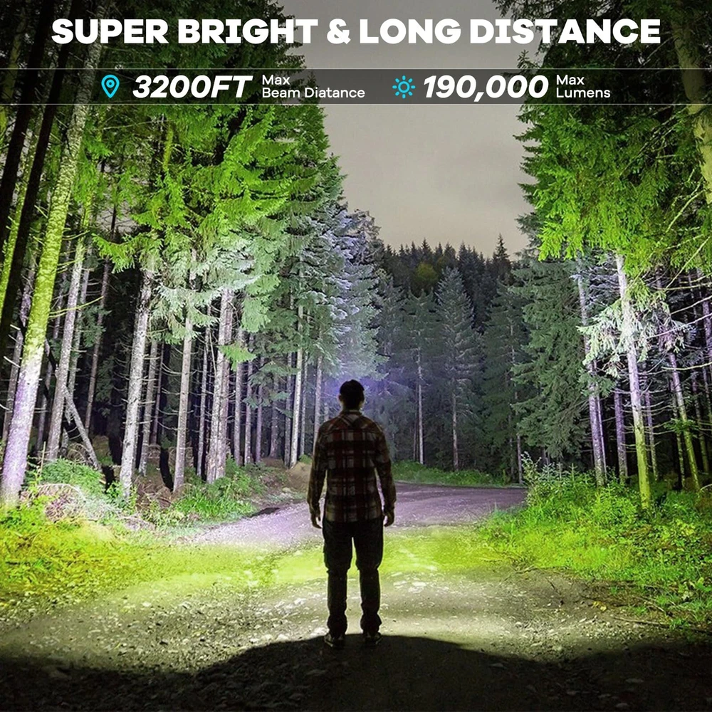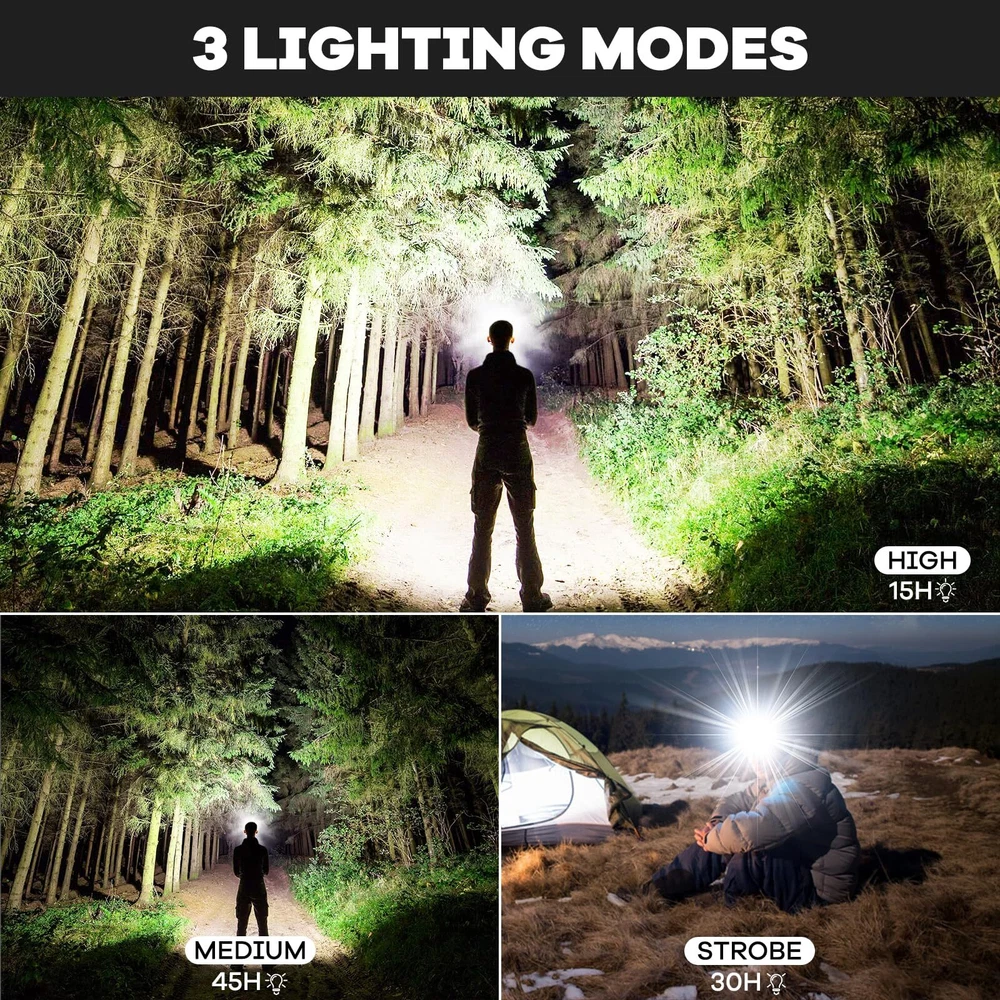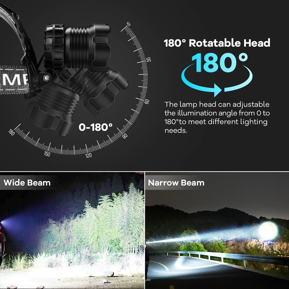 190,000 High Lumen Headlamp: rechargeable high lumen Headlamp updated by XHP90.6 lamp beads. SKNSL high powerful Head lamp up to 30 times brighter than ordinary LED Headlamp.This Super Bright Headlamp can clearly illuminate things within 3280 feet (1000m) on a dark night, easily lighting up an entire room or backyard. 3 modes: Our Super Bright Headlamp has 3 different models:High,medium.Strobe.You can use the Head lamp high lumens rechargeable flexibly in different scenarios. You can switch freely between 3 modes. Long press for 2-3 seconds to close, no need to cycle mode to close. Rechargeable Headlamp: The brightest LED Headlamp are rechargeable with USB ports. It can be charged from power banks, outlets and laptops for easy indoor and outdoor charging. 180° Adjustable headlamp For camping:LED headlamp specially designed 180 ° adjustable angle, each degree is very solid, so you can see the full range of vision from front to back. Pull the headlamp head to spotlight mode and pull back the head to floodlight mode. Waterproof & Durable:Made of durable military aluminum housing, the headlamp is waterproof to IPX7. And with a tight waterproof design, it can be used normally in any bad weather, such as rain or snow.