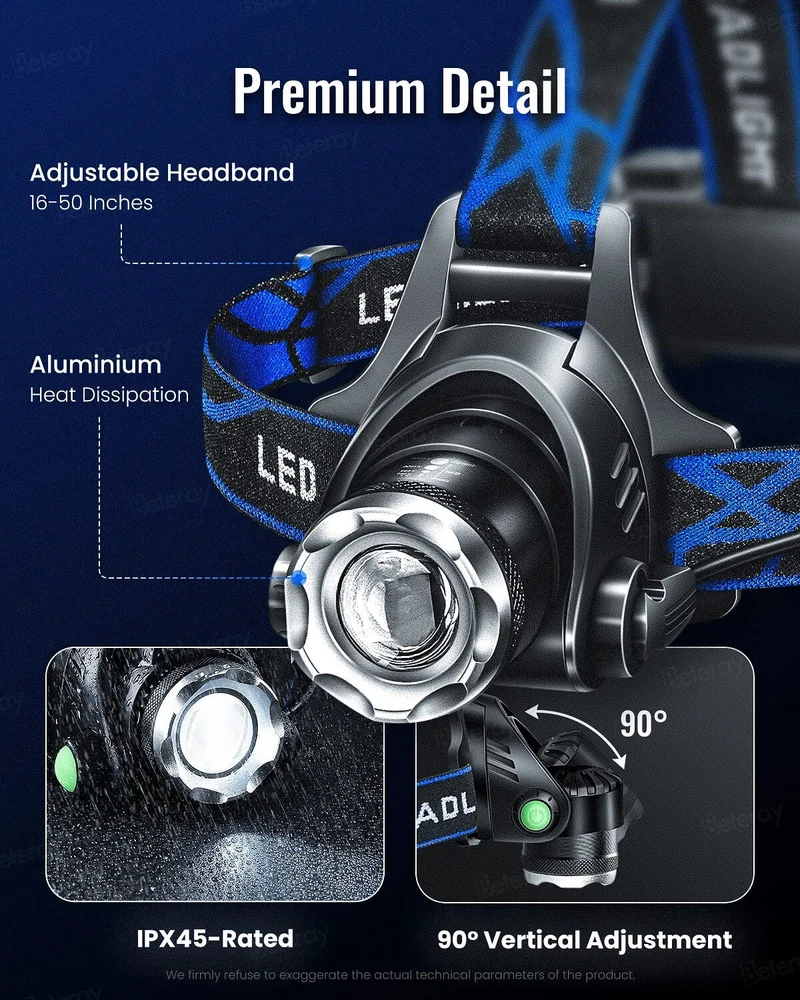 headlamp Powerful T6 LED Bulbs - This headlamp features 10W high-power T6 LED bulbs that provide a stunning 800 lumens of brightness. That's more than 300 lumens brighter than regular T6 bulbs! The rotating zoom function allows you to switch between flood and spotlight modes, with an impressive irradiation distance of up to 300-500 meters. So, whether you're camping, hiking, or exploring caves, this headlamp will illuminate your path and keep you safe. Long-Lasting Rechargeable Battery - The headlamp comes with high-capacity 1200mAh batteries that offer up to 4 hours of continuous use on high brightness mode and 8 hours on medium brightness mode. The batteries are rechargeable and recyclable, so you can avoid the environmental pollution caused by disposable batteries. Plus, the headlamp features a traditional USB interface for enhanced compatibility with different devices. 3 Lighting Modes & Light Sync - To meet your various needs, we've designed this headlamp with three modes: high brightness (800 lumens), medium brightness (500 lumens), and burst flash mode. The lamp in the rear battery compartment is synchronized with the main lamp mode and emits a red light for warning others or calling for help in case of an . This light sync design is a great feature for outdoor enthusiasts and adventurers. Excellent Heat Dissipation Design - With high-power T6 LED bulbs, this headlamp requires efficient heat dissipation, which is why we've chosen aluminum alloy for the lamp cap to assist with heat dissipation and reduce the overall weight of the headlamp. Additionally, we've sealed the key parts to make the headlamp waterproof to the IPX45 standard. The headband features an adjustable design to fit different head sizes, and the lamp cap can be adjusted up to 90 degrees for optimal illumination. Versatile Use - This headlamp is perfect for a variety of outdoor activities such as camping, fishing, hiking, hunting, cycling, and cave exploration. It's also great for indoor activities like reading and car repair. Customer satisfaction is our top priority, and we're here to help with any questions you may have before or after purchase. us through for a full response. Perfect Gift for Any Occasion - Whether it's Father's Day, Valentine's Day, Easter, Halloween, Thanksgiving, Christmas, or any special occasion, our headlamp is the perfect gift for anyone who loves outdoor activities. Give the gift of adventure to your father, mother, husband, son, or boyfriend with our powerful and reliable headlamp.