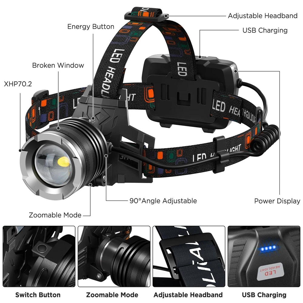 【Ultra Bright & Long Life Headlamp】Headlamp rechargeable provides an astonishing 900000 lumens of brightness. Equipped with an upgraded high capacity 6 * 2000 mAh Βattery, it can run for 10 hours at high brightness and 45 hours or more at low brightness.The average lifespan can reach up to 2500000 hours. 【Fast Charging & Power Display】A prominent feature of the LED headlamp is its rechargeable Βattery, which is very energy-saving and environmentally friendly. It only takes 4-6 hours for the headlight to fully charge. Each power state represents 25%. USB output, which can be used to charge your phone and other devices. 【5 Modes & 90 ° Adjustment & Zoomable】Rechargeable head lamp have 5 lighting modes: high/medium/low/flash/SOS. It also has an adjustable 90 ° and zoom function, It is easy to use. allowing you to shine in any direction you like. making it the perfect headlamp for adults rechargeable for camping, hiking, hunting, and exploration. 【IPX6 Waterproof & Comfortable】Aviation aluminum materials make the LED headlamp heat dissipation fast. It also has IPX6 waterproof performance, so you can use it on rainy or snowy days. The front head lamp features an easily adjustable high elastic headband, ensuring a comfortable fit for any size of head. 【 Easy To Use & Packaging】Our headlamps are very easy to use and easy to carry. The best headlamp flashlight, including 2 * headlights, 2 * USB-C cable, 6 * rechargeable Βattery, and 1 * user manual.