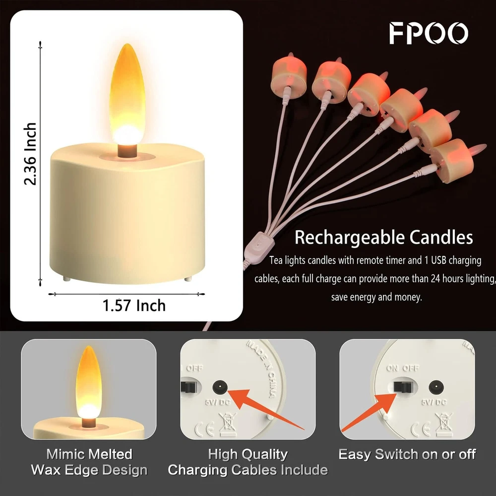 Flameless & Safe: Say goodbye to open flame risks and the excess waste of traditional candles. No more worrying about the breeze blowing the candles out or lovely children and pets knocking them over. Easy to charge: Our innovative LED tea lights come equipped with an improved 6-way charging cord. And the red indicator light shows when it's charging. Taking only 3 hours to fully charge and lasting up to 25 hours. Excellent Timers: With the 4H/6H timer functions, it can extend the battery life to approximately 5-7 days. These LED votive candles consistently come on at the same time and shut off after working 4 or 6 hours. Bright & warm light: Fake Tea light candles provide the perfect ambient light with 4 flicker features, including fast/slow flicker, breathing, and solid mode. Adjust the brightness and flicker rates with a 10-key remote control. Each pack contains 6 tea lights (2.36''H x 1.57''D) that are compact and fit most holders and bases. They also can be used as night lights to cast light in the hallway or at fireplace. Perfect for festivals, home decoration, or as a gift for any occasion. Whether it's Halloween, Thanksgiving or Christmas, our rechargeable candles will come in handy year-round.