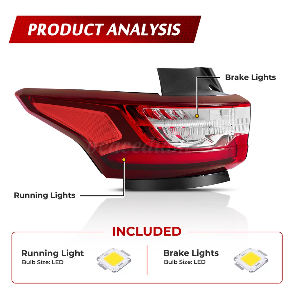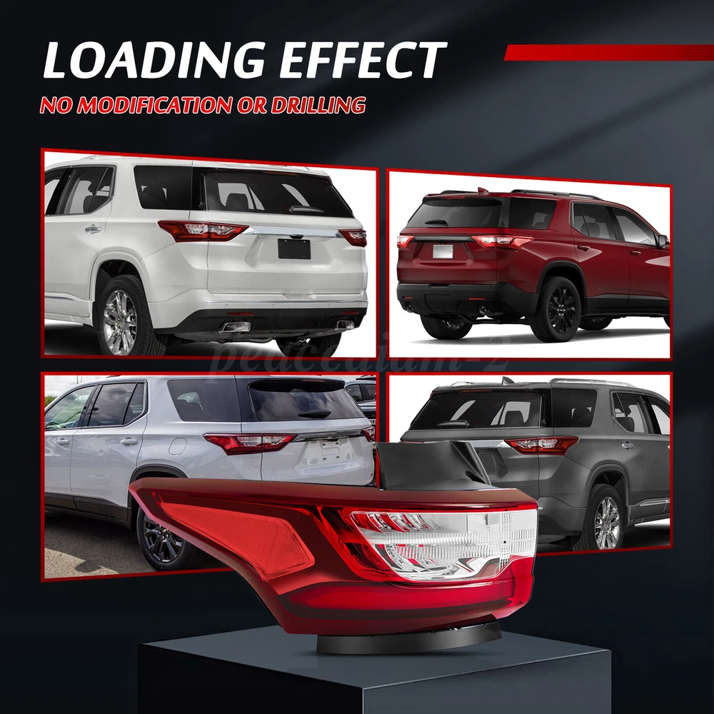 LED Red Tail Light For 2018-2021 Chevy Traverse Rear Lamp Left Driver Side Outer PRODUCT DETAILS Description: This car tail light assembly is 100% brand new in original factory packaging, ensuring excellent quality. It is perfectly compatible with your vehicle for a plug-and-play installation without any adjustments, allowing your car to quickly regain its optimal state. The lightweight design significantly reduces weight and improves energy efficiency. The high-efficiency LED light source provides greater brightness, longer lifespan, and energy savings. At night, this tail light enhances vehicle visibility, emitting a clear warning signal to build a safety barrier for you and other road users. Choose this tail light for a safer, more efficient, and eco-friendly driving experience. Specification: Type: Tail Light Assembly Light Type: LED Bulb: Included with and wiring harness OE Number: GM2804130, 84990362 Housing Color: Chrome Lens Color: Red Clear Material: Heavy-duty polycarbonate Placement on Vehicle: Rear, Outer, Left, Driver Side Fitment: Fit for 2018 2019 2020 2021 Chevrolet Traverse Not Fit for Redline Package Models Package Contents: 1×Tail Light (Outer Left, Driver Side) With LED bulbs and wiring harness Features: 【Brand New Factory Packaging】This tail light comes in 100% new factory packaging, unopened and untouched, preserving its original condition. It reflects confidence in product quality and is a testament to our commitment to your choice. 【Seamless Replacement, Plug-and-Play】Designed for convenience and peace of mind, this tail light is perfectly suited to your vehicle without requiring modifications or adjustments. The installation and performance match the original parts seamlessly for a true "plug-and-play" experience, restoring your car to its best condition quickly. 【Lightweight and Energy Efficient】With an advanced lightweight design, this tail light maintains strength while significantly reducing weight, contributing to overall vehicle efficiency. Combined with the high-efficiency LED light source, it delivers higher brightness and longer life while reducing energy consumption, supporting eco-friendly driving. 【Enhanced Safety for Night Driving】Nighttime journeys are safer with this tail light, which improves vehicle visibility and emits clear, attention-grabbing warning signals at crucial moments, providing a protective safety barrier for you and others on the road. Note: 1.Please confirm compatibility with your vehicle before purchasing. 2.Ensure the installation is secure before driving for safety. 3.Due to differences in display and lighting, the actual product may vary slightly from the images. 4.Installation instructions are not included; professional installation is highly recommended. PAYMENT We only support transactions on the ebay, do not support offline or private transactions. Please make sure the address is accurate before you pay. SHIPPING We do not ship to PO Box, Alaska/Hawaii, APO/FPO, and US Protectorates. Item(s) would be shipped out within 1~2 working days after received your confirmed payment. Weekends and holidays are not working days. We will choose different warehouses according to the customer's address and item stock, shipped from CA and PA in the United States. RETURN Buyers may return or exchange an item which damaged within 30 days. eBay & PayPal money back guaranteed. CUSTOMER SERVICE We are committed to provide the best purchase experience for our customers. If you have any questions, just feel free to contact us, we respond queries within 24 hours in business days.