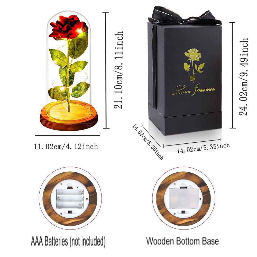 Valentines Day Gifts for Her: This exquisite rose is not just a gifts; it's a timeless symbol of love expressing your affection on mother's day, birthdays, or any special occasion. Showing your appreciation with expression of your love. It suitable for use as birthday gifts for women,Christmas Rose gifts for mom grandma, anniversary gifts for her, wedding gifts, Christmas gifts, sister gifts, graduation gifts, women gifts. Valentines Day Gifts: Make your mom's day special with this rose gifts that will express your love every time she sees it. Whether it's Christmas gifts from daughter , it's an of love, beauty, and enduring sentiment. Whether you're celebrating love, expressing appreciation, or simply looking for a unique and meaningful gifts. It's a symbol of timeless love. Valentine's day Gifts for Mom Grandma: The rose is beautiful. The added the soft lighting makes it a unique and mesmerizing decoration. Its captivating beauty and radiant glow make it a gift for birthdays, anniversaries, or saying "I love you". It Surprise her with a gift as beautiful as she is. Light Up the Rose Gifts for Women :Mothers day gifts for mom from daughter,mom gifts for sister,women gifts for her. Artificial rose in a glass dome is wrapped around an strip light,powered by 3 AAA batteries(battery not include).The strip light bright lighting,the beautiful rose flower gifts can use in daytime and nighttime for home room or create romantic atmosphere, rose is symbol of appreciation,love Valentine ideas gifts Packing:Christmas flower gifts birthday gifts for women mom or her come with packaging gifts box so that you could give directly without spending time on the package. Rose flower gifts for her,women gifts for Christmas, gifts for friends,anniversary gift for her wife,mom birthday gifts, mothers day presents.