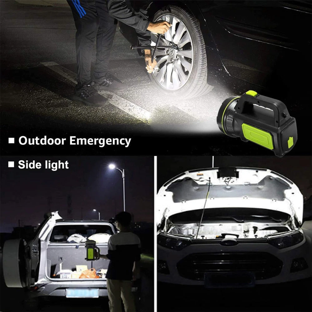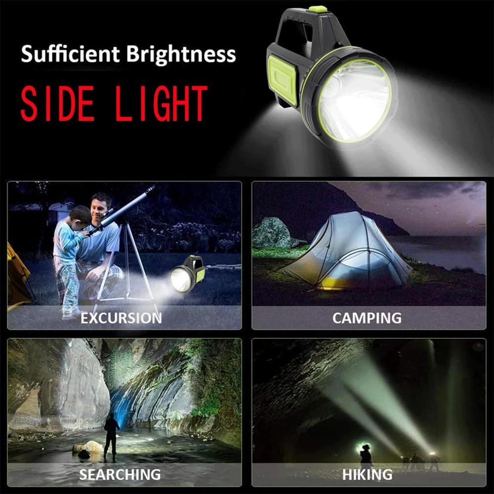 RECHARGEABLE SUPER BRIGHT SEARCHLIGHT: CREE high power lamp beads, professional level spotlights and high brightness led searchlights, its irradiation distance is about 2560 feets (800m). You can make it as a long-spot light, easy to search for targets as a hunting lights HIGH CAPACITY POWERFUL LED LIGHT LANTERN: Built-in rechargeable high-capacity lithium battery ( 7000MA ), if fully charged, can be lighting in high light for 9 hours, weak light can be lighting for 17 hours. With over-current protection circuit to ensure the service life of the battery USB CHARGING AND AS MOBILE POWER BANK: The USB charging cable can charge by 5 V USB ports. The USB output port at the bottom of the flashlight, it can serve as a power bank for your smartphone or mobile devices in emergency HIGH QUALITY STEADY LED SPOTLIGHT: High strength ABS engineering plastics, fully sealed structure, explosion proof, waterproof, dust proof, moisture proof, anti impact. perfect for camping, hiking, fishing, sailing, emergency lighting, outdoor, walking dog, rescue COMPACT LIGHTWEIGHT TRAVAL-SIZED LED CAMPING LANTERN: A Length-Adjustable Shoulder Strap Is Provided Together With A Large Comfortable Handle, Easier To Carry When Doing Outdoor Nighttime Work. Relatively Lightweight Than The Same Type Of Lanterns PRODUCT FEATURES: 1. Super bright LED spotlight Flashlight Lantern, You can make it as a long-spot light, easy to search for targets or what your hunting. 2. With USB port, it can recharge for your phone ipod B like a power bank. 3. Built-in rechargeable lithium batteries, Extend battery life. 4. Waterproof IPX4, you can use this LED Searchling in both outdoor or indoor SPECIFICATIONS: 1. Emitting Light: Daylight White 2. Power: built-in lithium battery 3. Waterproof: Yes, IPX4 (Can't dive) 4. Irradiation distance: Max 2560 feet(800M) 5. Wick: high power LED lamp 6. Color: black 7. Rated Voltage: 4.2V 8. Product Size: 157x 86x125MM(6.3*4.92*3.54 in 9. Weight: 255g 10. Material: High Quality ABS PACKAGE INCLUDED: 1 x LED Searchlight 1 x USB charging Cable 1* User Manual