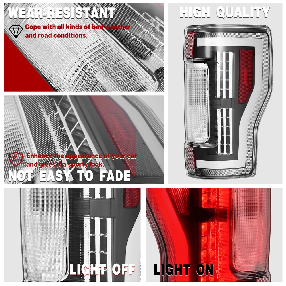 Store Categories Store Categories For Ford For Chevrolet For Dodge For Toyota For Honda Other Details LED Sequential Tail Lights For Ford F-250 F350 F450 Super Duty 2017 2018 2019 FIT FOR: For Ford F-250 Super Duty 2017-2019 For Ford F-350 Super Duty 2017-2019 For Ford F-450 Super Duty 2017-2019 NOT Compatible with Factory LED & Blind Spot Information System (BLIS) Tail Light Models PRODUCT SPECIFICS: Type: Tail Light Lighting Technology:LED Lens Color:Clear Housing Color:Black Light Color:Red Placement on Vehicle:Rear, Left, Right Installation Method:Screw-On Driving Light Wattage: 5W Turn Signal Light Wattage: 22W Brake Light Wattage: 22W Voltage: 12V Replace Part Number: Left Side: Replace For FO2800262, HC3Z13405C Right Side: Replace For FO2801262, HC3Z13404B Features: 1.Improved Visibility: Delivers bright, clear light for enhanced safety when driving at night or in poor weather conditions. 2.Sleek Appearance: Features a contemporary, stylish design to elevate your vehicle's look. 3.Long-lasting Durability: Constructed from premium materials that resist wear, fading, and environmental damage. 4.Simple Installation: Designed for easy plug-and-play setup or direct replacement with minimal effort. 5.Energy-Saving: Utilizes LED technology, offering reduced power use and an extended lifespan. Package Includes : 2 X Tail Lights With Structural and Functional Guidelines & Installation Instruction Shipping: All items will be shipped out in 1 business day, no expedited service available. We ship our items to USA only(Does NOT include Hawaii, Alaska or Puerto Rico, PO Boxes/APO's). Shipping Notes: We use multiple warehouses and will select the nearest warehouse for delivery according to your order address and our inventory, Thank you for your cooperation. Contact us: Any Questions, Just feel free to contact us on eBay. We will reply you in 24 hours. Store Categories Store Categories For Ford For Chevrolet For Dodge For Toyota For Honda Other Details LED Sequential Tail Lights For Ford F-250 F350 F450 Super Duty 2017 2018 2019 FIT FOR: For Ford F-250 Super Duty 2017-2019 For Ford F-350 Super Duty 2017-2019 For Ford F-450 Super Duty 2017-2019 NOT Compatible with Factory LED & Blind Spot Information System (BLIS) Tail Light Models PRODUCT SPECIFICS: Type: Tail Light Lighting Technology:LED Lens Color:Clear Housing Color:Black Light Color:Red Placement on Vehicle:Rear, Left, Right Installation Method:Screw-On Features:DOT Driving Light Wattage: 5W Turn Signal Light Wattage: 22W Brake Light Wattage: 22W Voltage: 12V Replace Part Number: Left Side: Replace For FO2800262, HC3Z13405C Right Side: Replace For FO2801262, HC3Z13404B Features: 1.Improved Visibility: Delivers bright, clear light for enhanced safety when driving at night or in poor weather conditions. 2.Sleek Appearance: Features a contemporary, stylish design to elevate your vehicle's look. 3.Long-lasting Durability: Constructed from premium materials that resist wear, fading, and environmental damage. 4.Simple Installation: Designed for easy plug-and-play setup or direct replacement with minimal effort. 5.Energy-Saving: Utilizes LED technology, offering reduced power use and an extended lifespan. Package Includes : 2 X Tail Lights With Structural and Functional Guidelines & Installation Instruction Shipping: All items will be shipped out in 1 business day, no expedited service available. We ship our items to USA only(Does NOT include Hawaii, Alaska or Puerto Rico, PO Boxes/APO's). Shipping Notes: We use multiple warehouses and will select the nearest warehouse for delivery according to your order address and our inventory, Thank you for your cooperation. Contact us: Any Questions, Just feel free to contact us on eBay. We will reply you in 24 hours. On Dec 29, 2024 at 17:00:54 PST, seller added the following information: On Dec 31, 2024 at 01:14:08 PST, seller added the following information: On Mar 10, 2025 at 23:12:16 PDT, seller added the following information: