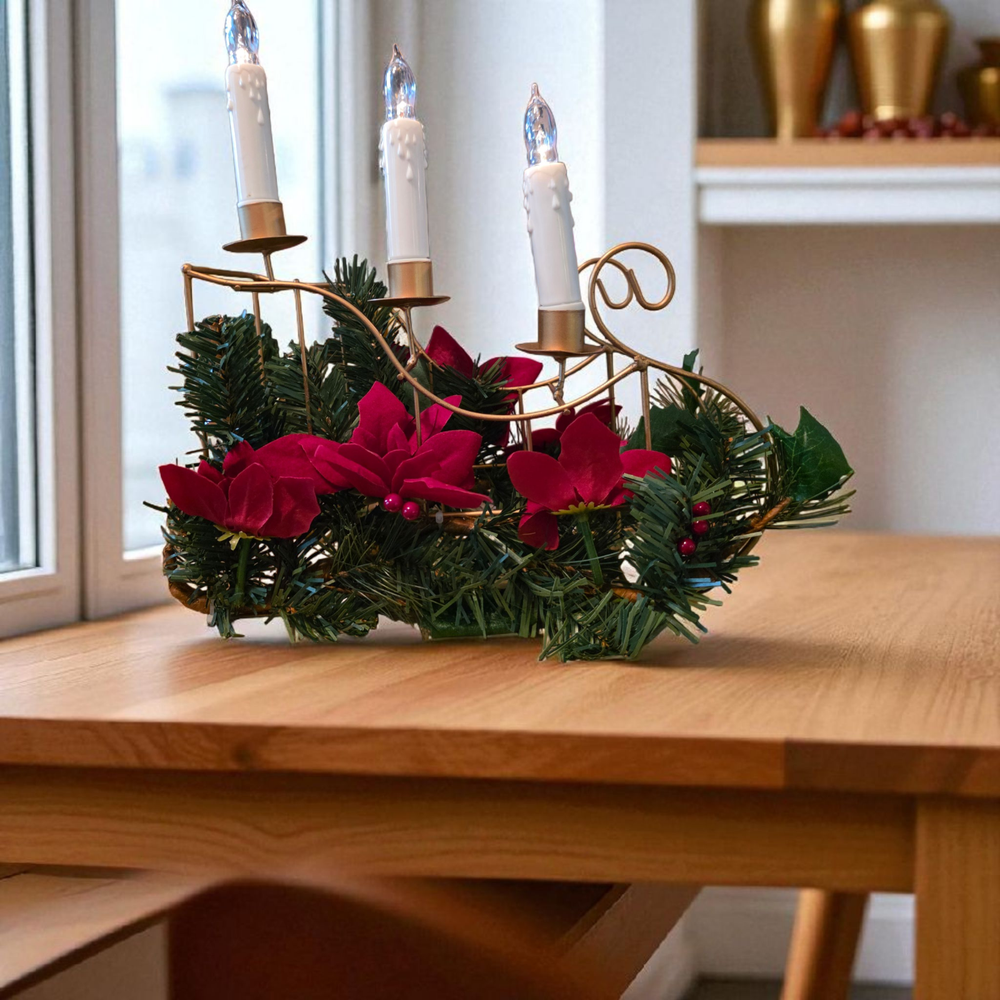 This sleigh centerpiece is gold with white candles. NIB! We opened the box and tested the candles. Each candle takes a AA battery. Works perfectly and is beautiful.
