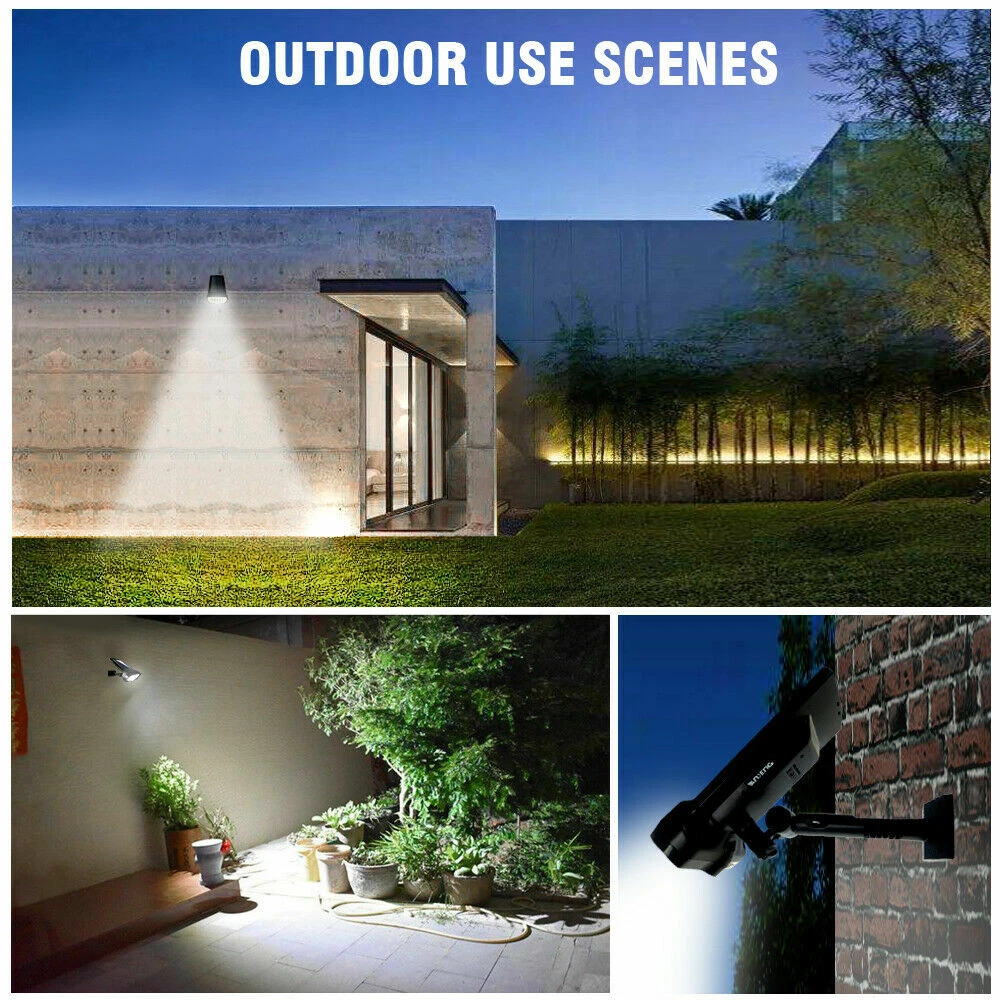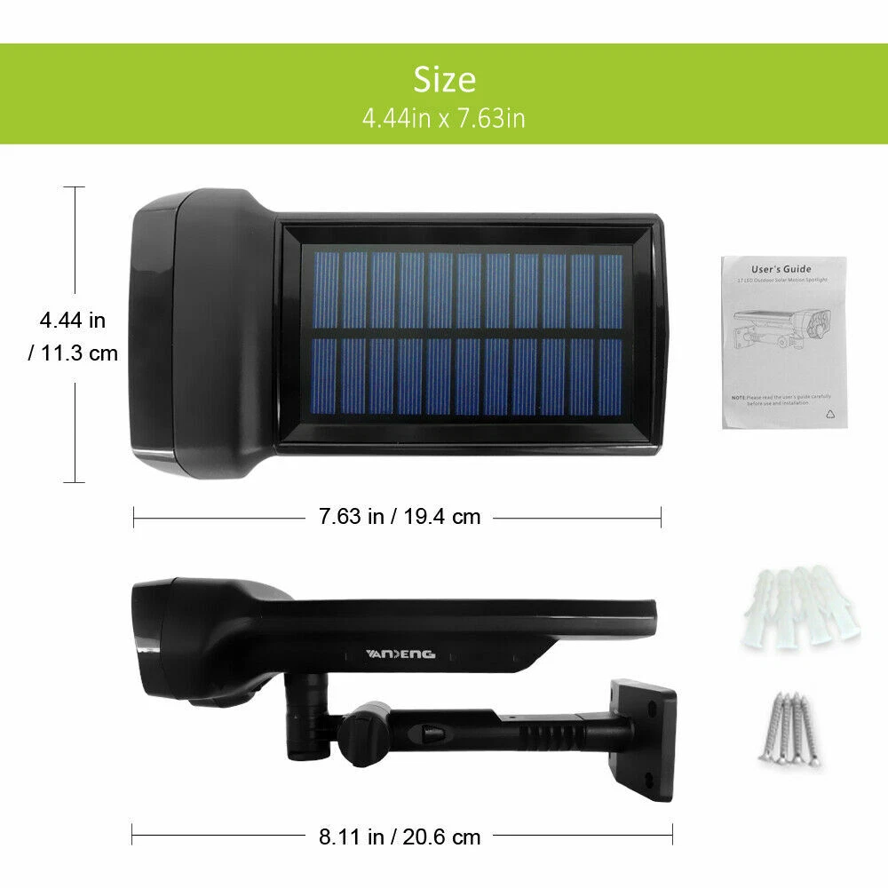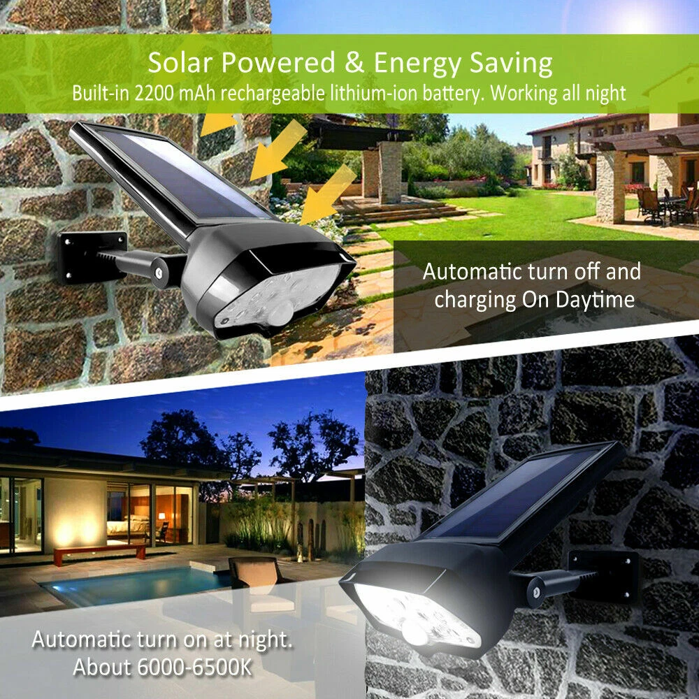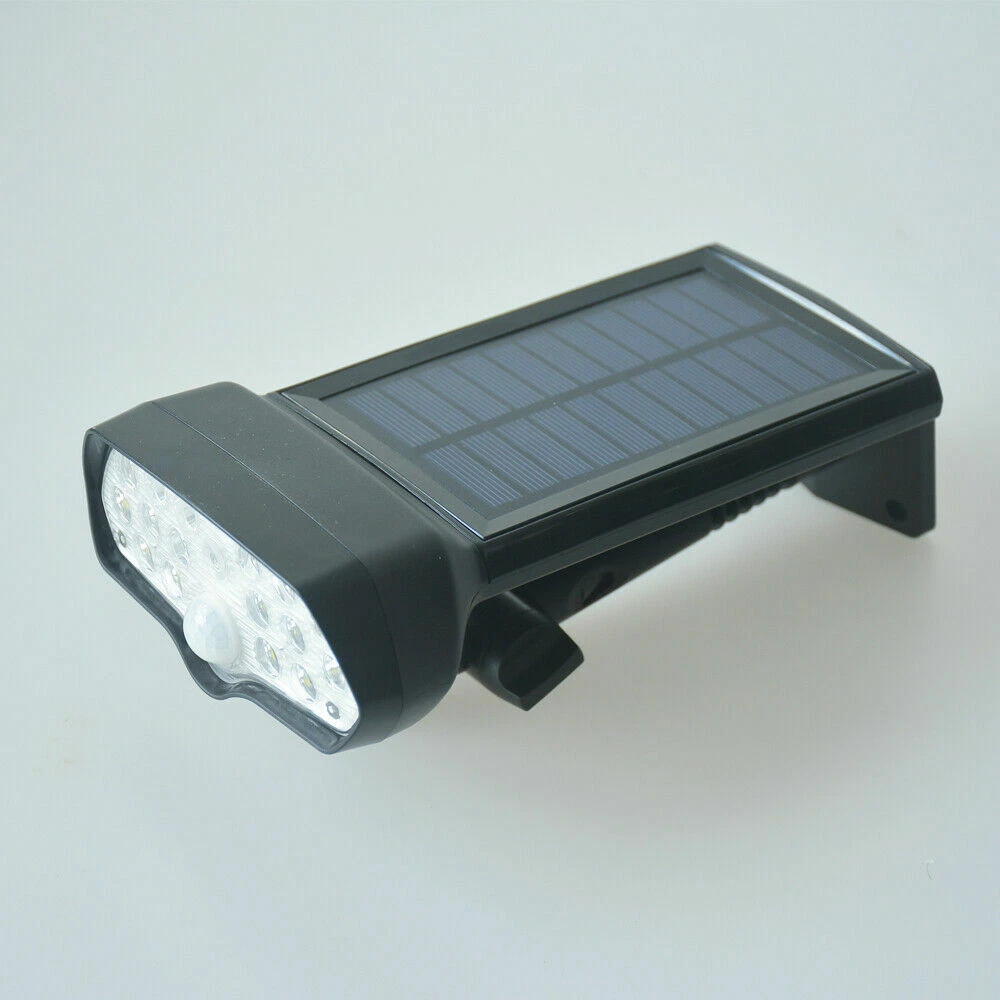 LED Solar Flood Light Motion Sensor Security Spot Wall Street Yard Outdoor Lamp DESCRIPTION: • Not Only A Wall Light: With unique adjustable angle design, you can place this light wherever you want to by twisting the knob screw , on the wall or ground or anywhere else, and you may place the solar panel vertically against the sunlight to maximize the absorption of solar energy. • Super Bright Solar Light: 2200 mAh rechargeable lithium-ion battery combining high power 16 LED beads with the innovative wide angle design, this solar wall light can reach 320 square feet. • Sense A Cat Highly Sensitivity PIR Motion Sensor System: With the adjustable angle design, the PIR sensor range comes to 23ft and there is no blind area like other brands always have. Our solar lights detect sensitively even a small pet like cats. • Innovative Ip65 Waterproof: The outside ABS shell is solid and durable with IP65Waterproof against any terrible weather. Adopted standard battery and high-quality LED, works longer than other brand lights with low price & bad quality. • Easy To Install: 1. Punch 4 holes on the wall with a drill bit and insert the attached wall plugs. 2. Twist the screws through the mounting hole of the light into the wall plug. 3. Adjust the angle then tighten holder and the light through knob screw. Turn on the light. SPECIFICATIONS: • Solar panel: 5.5V, 1.1W • Li-ion battery: 3.7V 2200mAh • LED: 16pcs, SMD2835,1.4W • Lumens: 150Lm • LED span life: 50,000 hours • Solar charging time: 8 hours • Lighting mode: Dark/DIM/bright; Bright: motion activate for lighting • Auto identify day or night • Li-ion battery span life: >500 circles PACKAGE INCLUDE: • 1 × Solar Motion Sensor Light; 4 × Wall Plugs; 4 × Screws; 1 × User Manual