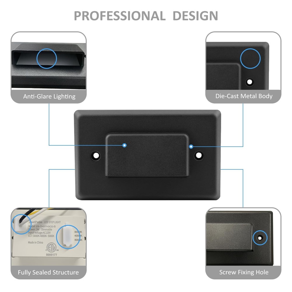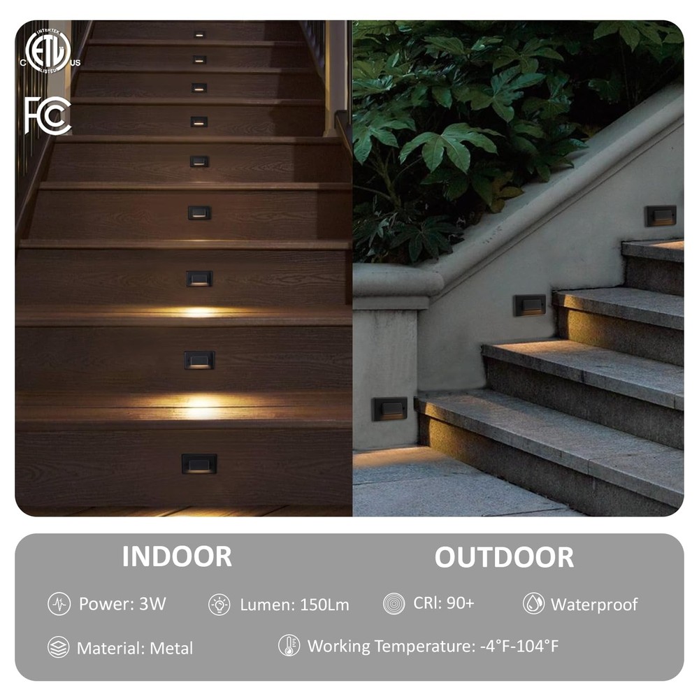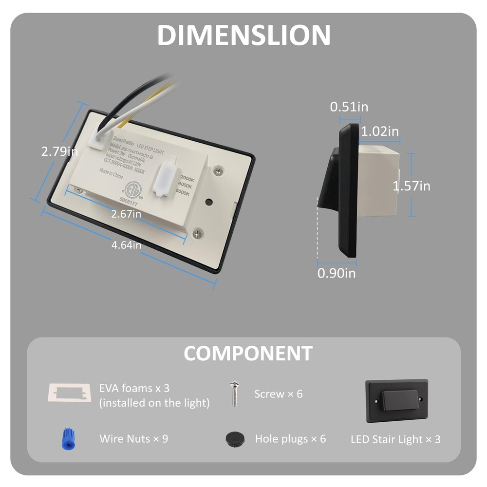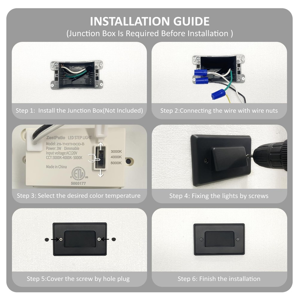 LED Step Lights Indoor Outdoor, 3W Outdoor Lights for Stairs Steps Decks, 120... 【3 Color Temperature】 : ZestPatio LED step lights indoor have 3 color options with the simple slide of a button on each light without disassembling the light (Set the color before installation), these stairway lights indoor project the light down and are just the right amount of lighting without glare, providing enough light for safety when using the stairs, these step lights have a memory function that retains the last set color 【Smooth Dimming】: ZestPatio LED lights for stairs are compatible with most dimmers, featuring a dimmable range of 5% to 100%. They provide smooth triac dimming without flickering and have a CRI of 90, ensuring truer colors 【Indoor and Outdoor Use】: ZestPatio outdoor lighting is designed for both indoor and outdoor use. These outdoor lights for stairs have sturdy aluminum construction, a silicon gasket, and an IP65 waterproof rating ensuring durability and reliability. These step lights outdoor are ideal for illuminating various areas, including stairways, pathways, driveways, decks and patios 【Simple to Install】: Our LED stair lights indoor have an AC 120V input voltage, installs easily in a standard gang box, cutting holes in the stucco wall or wooden wall to install this landscape lighting is easy. We suggest using the deepest possible electrical boxes so that you are cramming all your wires, wire nuts, and the unit itself, into the box (Note: Junction box is not included in the package) 【Outstanding Service】: ZestPatio is dedicated to delivering an exceptional customer service experience through the design and development of stairwell lighting. Our products are ETL-listed and FCC-listed, and we provide a 3-year warranty. If you are not completely satisfied with your purchase for any reason, please contact us for a quick and easy replacement The ZestPatio is a new brand, we are committed to continually offering you the most comprehensive professional LED lighting, all are designed and manufactured for optimum quality and performance. We will do that by relentlessly pursuing quality, ensuring continued innovation, always going one step further in our commitment to exceptional customer service. You, your family, and your guests will be delighted with the results. Product Description ZestPatio LED Step Lights Indoor Outdoor, 3W Outdoor Lights for Stairs Steps Decks, 120V Triac Dimmable, 3000K/4000K/5000K, IP65 Waterproof, ETL, Aluminum Brand: ZestPatio Working Voltage: AC 120V Power: 3W Effictive Flux: 150LM Dimmable: Triac Dimmer (5% - 100%) Color Temperature: 3CCT (3000K/4000K/5000K) Light Type: LED Waterproof: IP65 Lifespan: 30,000hrs Shipping We offer FREE shipping on all orders! We ship within Three business days of payment, usually sooner. We use a selection of shipping services such as UPS, FedEx, USPS etc. We only ship to the lower 48 states, no APO/FPO addresses or PO Boxes allowed. Local pickups and combined shipping options are not provided at this time. Return You can return a product for up to 30 days from the date you purchased it. Any product you return must be in the same condition you received it and in the original packaging. Please keep the receipt. Payment We accept payment by any of the following methods: PayPal Please pay as soon as possible after winning an auction, as that will allow us to post your item to you sooner! Feedback Customer satisfaction is very important to us. If you have any problem with your order, please contact us and we will do our best to make you satisfied. Contact Us If you have any queries, please contact us via ebay. We usually respond within 24 hours on weekdays. Please visit our eBay store to check out other items for sale! Thank you for shopping at our store.