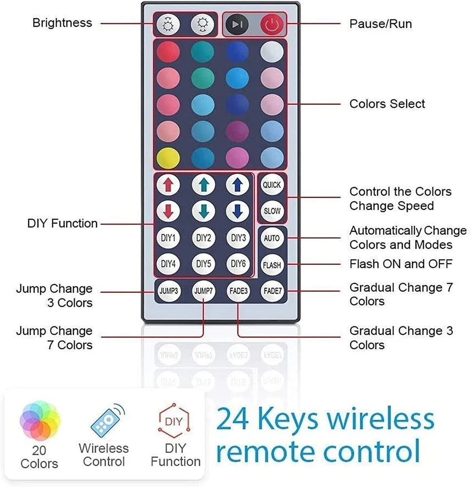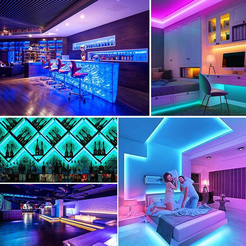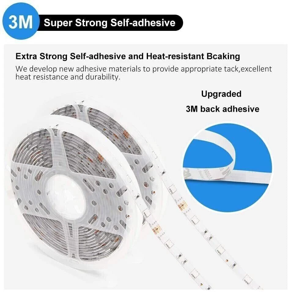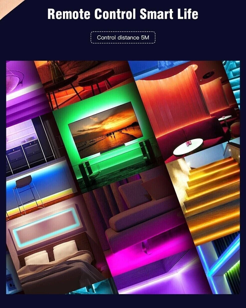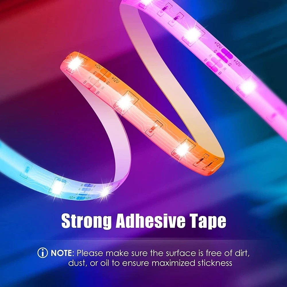 Flexible Strip Light 32ft LED Strip Lights Product Features: 【Multiple Choices LED Strip Light】: This RGB Led strip lights kit can change colors and speed automatically and periodically. It has not only RGB(Red, Green, Blue), 20 multicolored options, but also has DIY selection to create your great led mood lighting. 【Easy Installation and Use】: Led tape lights is cuttable between every 3 leds. You can cut off extra strips to adjust to a proper length. 3M self-adhesive tape can be fit on any dry and flat surface. Flexible to install anywhere you want. 【Connectable And Cuttable】: Strong sponge double-sided tape installation, super viscosity, just plug in all the parts and peel off the protective layer, then stick to the clean and flat surface. These light strips can be cut on all 3 LEDs along the cutting marks without damaging the rest. 【Safety LED Strip Lights】: This led strip light provide 12V/5A power supply no worry about prevent electric shock, short circuit etc, we promise it will provide a safety environment for your. 【Widely Application】: Low Power Consumption. The working voltage is 12V. Extremely low heat. It is touchable and safe to children. The strip lights can be used indoors decoration. Ideal for TV, home, bar, shop, etc.