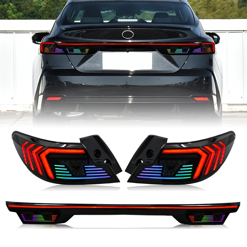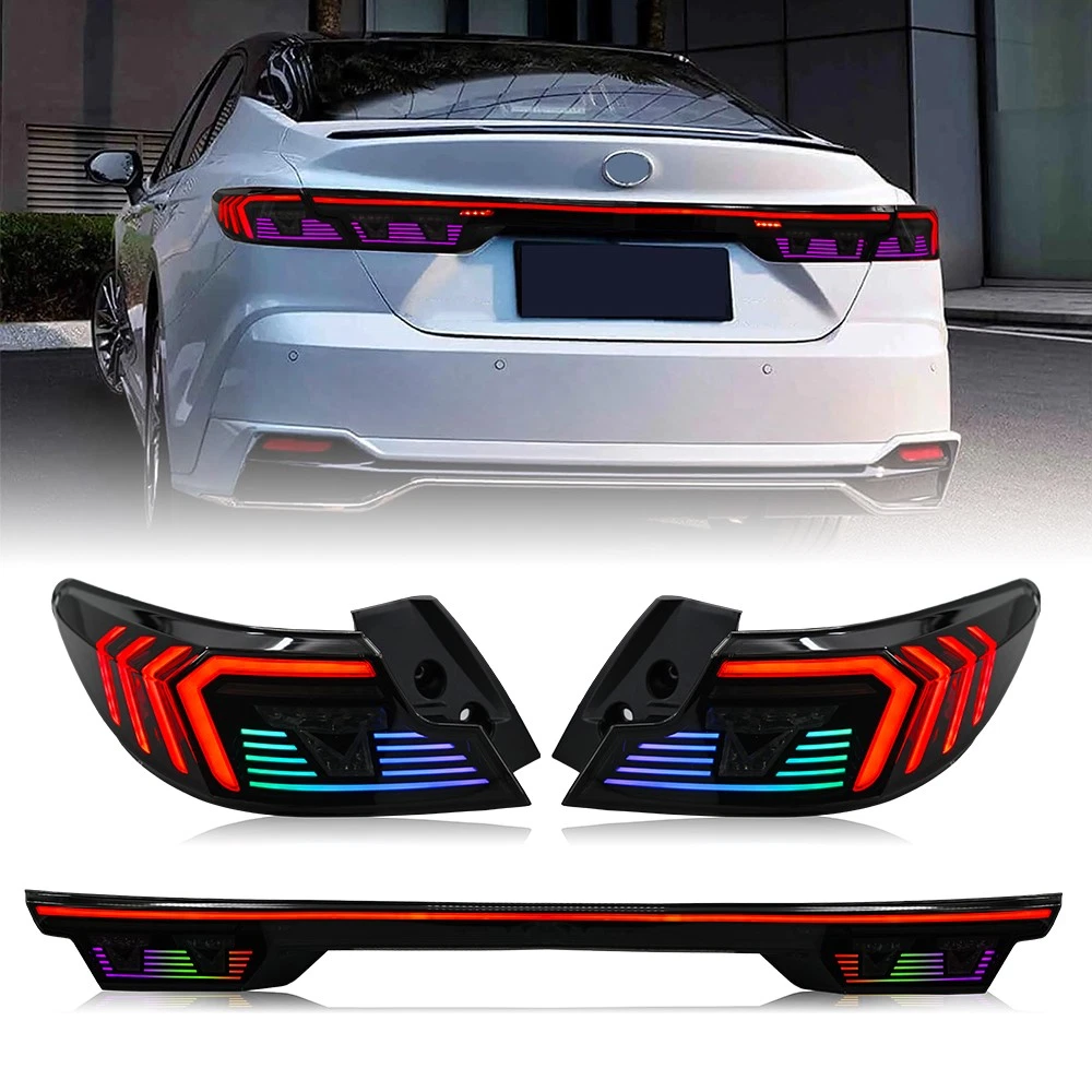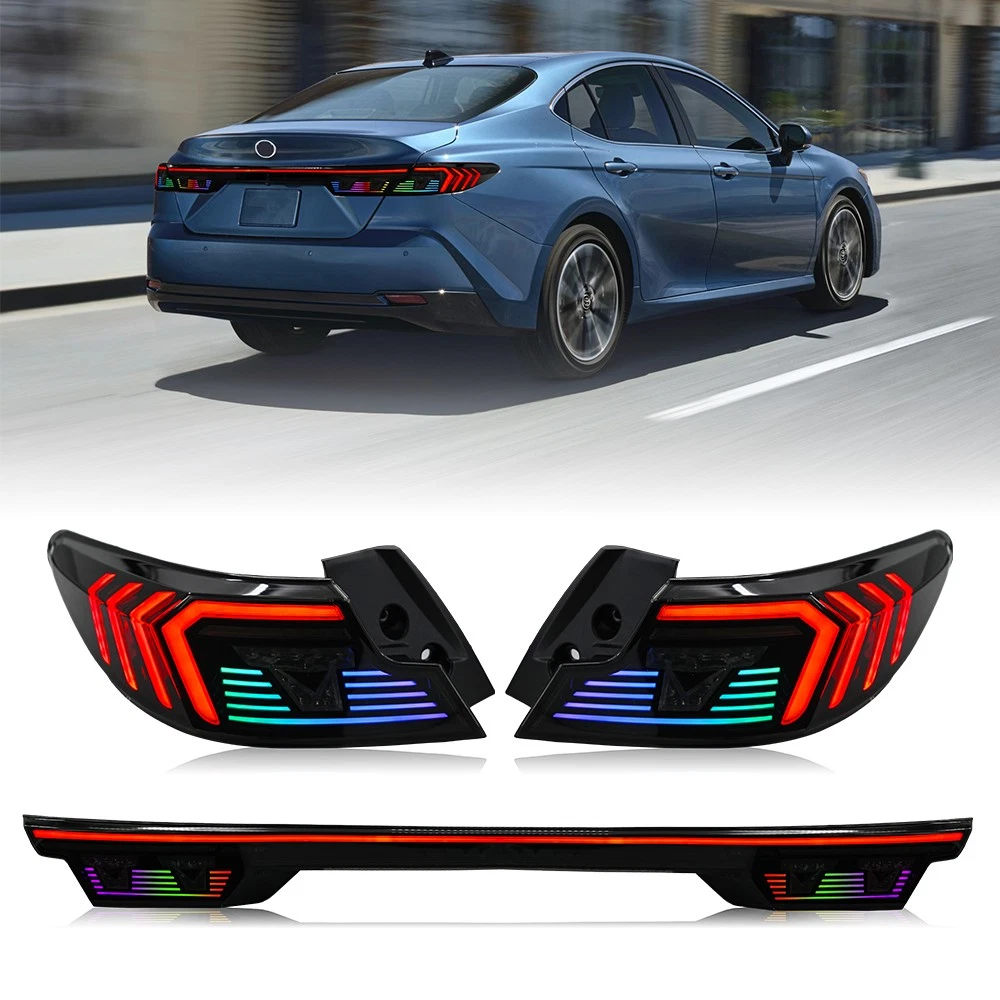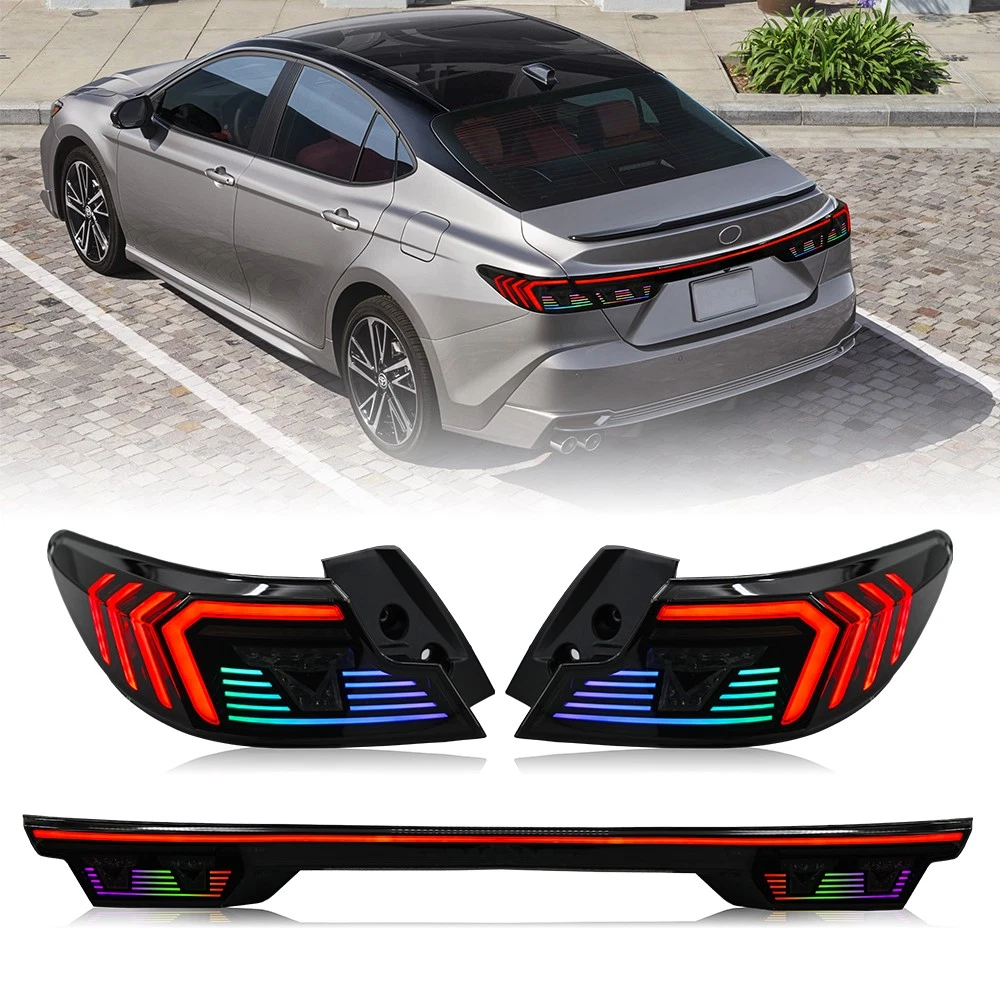RGB LED Tail Light Trunk Lamp Fit For Toyota Camry 2024-2026 Rear Lamps Assembly Features: 1. One pair: Left + Right + Center Trunk tail lights 2. Tail Light Lens: Smoked Lens, Chrome Housing 3. Bulbs: All bulbs are built-in LED, no extra bulbs needed 4. Function: Rear Running Light (Red/RGB)+Turn Signal(Amber )+Reverse(White)+Brake (Red) lights 5. Easy installation: plug and play,same as original one to install 6.Assembly: all parts are included in the package,no need to buy extra bulbs or harness Fitment Fits For Toyota Camry 2024 2025 2026 ( Professional Installation is Highly Recommended ) Package include 1 Pair of Taillights (driver's side + passenger's side) Note 1. Please confirm whether this car-lamps can fit your car before buying, if you are not sure, please contact us and send us pictures of your original car light or plug. 2. Using your factory supplied connector/harness will avoid cutting or modifying any wires. Specification ·100% Brand New ·Professional Installation is Highly Recommended ·Welcome to send us message for more information Warranty: One-Year warranty after receiving After Sales Service Please contact us before returning the products, we will do our best to help you solve all the problem well with good service!!! Questions Any question will be replied within 24 hours except the weekend and holiday. We will serve for you all sincerity!