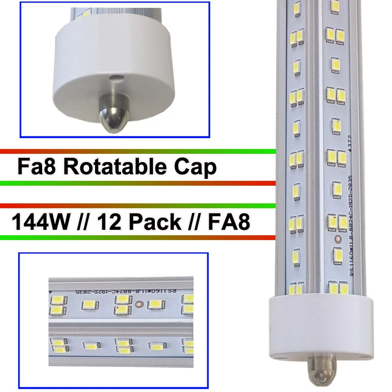 FAST DELIVERY - Ship from New Jersey or Los Angeles Warehouse via FedEx , 3-7 Days Delivered Your Door . SCIENTIFIC DESIGN - 8Ft LED Shop Lights Fixture is Made of 6500K Cold White SMD2835 LED Chip ,Plastic Clear Cover , Aluminum Bracket Housing ,and AC85-277V Constant Current Driver . It can work in -68F to 120F Temperature Conditions EASY INSTALLATION - The Integrated Tube Fixture Can be Install on Wall or Ceiling ,Easily Replace Traditional Fluorescent Tube Bulb . Plug and Play , Free Accessories (Power Cords, Connector , Extension Cords , Clip and Screw ) Come with Tube Lights Together WIDE APPLICATION - Linkable 8Ft Bulbs Widely Used in Garage Ceiling , Barbershop , Schools, Hospitals Basement , Factory Warehouses , Supermarkets Cooler Door , Offices, Shops,Hotels, etc LED Tube Light 8FT 144W T8 Single Pin FA8 Base Double Side V Shaped LED 12PCS 【No RF & FM Interference】LED Driver have passed Electromagnetic Magnetic Compatibility EMC tests,No cause EMI ,No longer subject to any RF & FM jamming. Never interfering with the signal of your garage roller shutter door,No make noise when you listen radio 【Easy to Install】Just simply bypass the ballast and connection AC85-277V AC power . Not compatible with single-ended powered sockets 【Wide Application】 - 8Ft 144W V Shaped FA8 HO LED Bulb fitted to replace traditional F96T12 T8 T10 T12 fluorescent bulbs. Widely used in Garage,supermarkets, offices , convenience stores , gas stations , warehouse,parking lot,shops, hotels,Refrigerator,coolers or freezers illumination,etc 【High Output】8Ft 144W 18000LM FA8 【Rotate Cap & Swivel End】 Easy Adjust rotated Lighting Direction within 180 degree after Installation