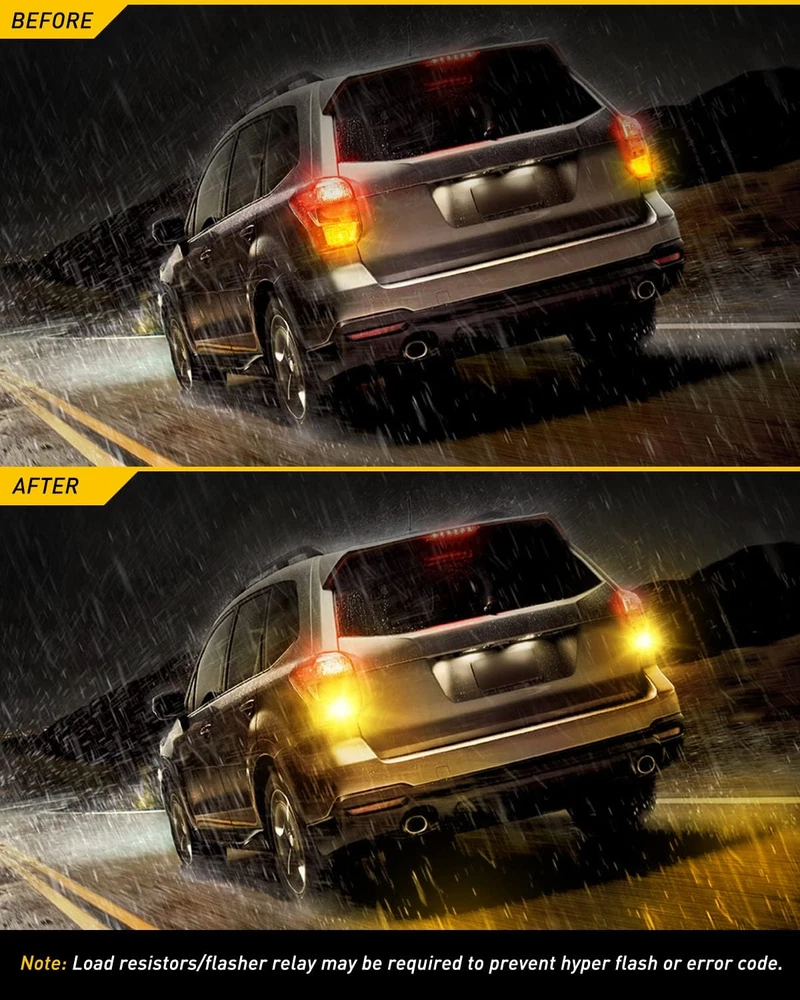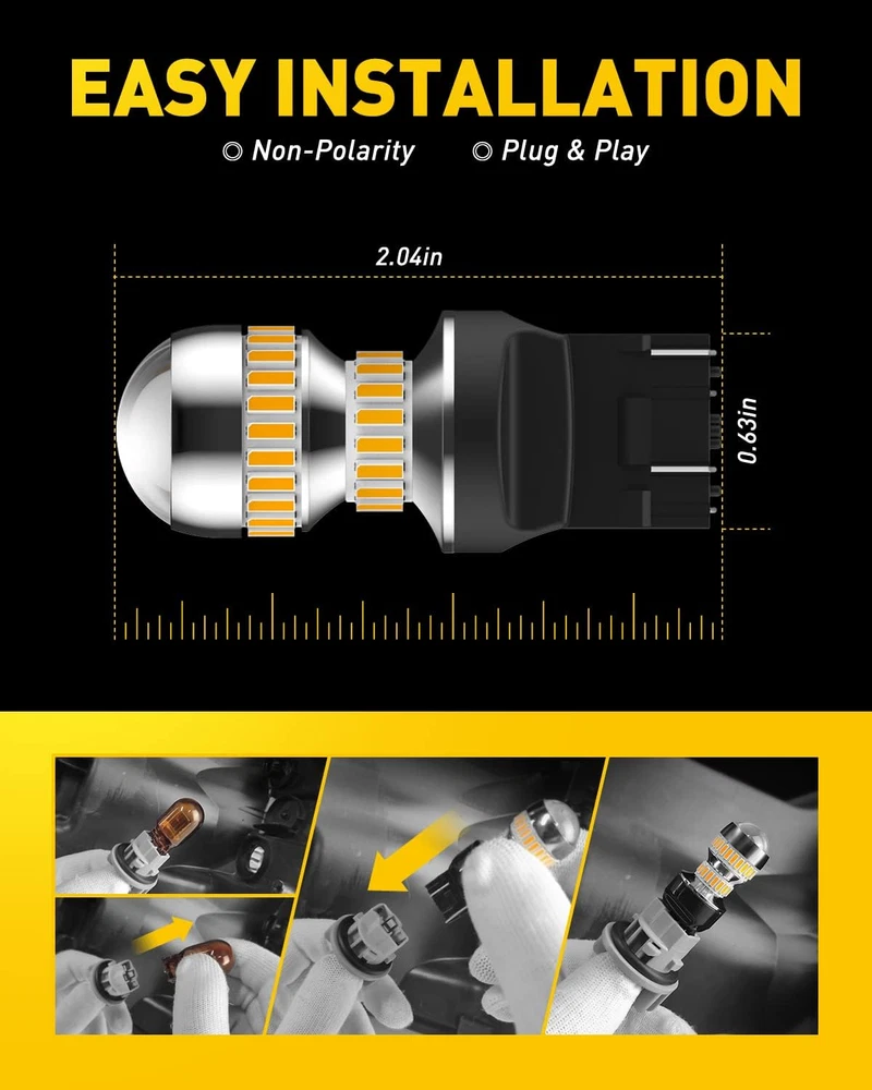 Non-polarity. Can be used for front rear turn signal light, side marker light, blinker light, parking light, daytime running light, brake light, tail light, etc. When these 3157 led amber bulbs are used for turn signal lights or blinker lights, some vehicles may meet canbus issues, such as flicker, hyper flash or error warning, etc, load resistors or flasher relay may be required to solve the issues, you can contact us through Amazon Buyer Message to get help and solutions Resembling halogen bulb shape design and sequencing 54 4014-SMD LED chips precisely around the 3157 led amber bulb. Delivering 360° high luminous efficiency with full amber light. Much easier noticed and much more safer driving 5.5W per 3157 amber led bulb. Only 1/4 energy consumption of original bulb but 4 times brighter. Built in smart IC driver ensure constant current, no radio interference. Plus instant-on capability with zero warm-up time Electroplating process housing. Improve oxidation resistance and produce less heat. High-grade shape, matching great in the assembly. Ideal replacement for your halogen bulbs Small size comparable to OEM bulbs. Non-polarity, applied to US standard and CK sockets. Fits socket: 3056 3156 3157 3157K 3057A 4057 4157, etc. Amazon filter system may not be 100% accurate or up to date, if you are not sure which bulb model fit your vehicle, please check your vehicle owner manual to confirm or ask a question for help Product Description AUXITO 3156 3157 4157 3457A LED Bulbs Amber Yellow Super Bright: Adopts 54pcs led chips, only consume 1/4 of the power, but 400%+ brighter than dim halogen bulbs Plug and Play: Non-polarity design, directly fit for 3156, 3056, 3047, 3157, 3457, 4057, 4114, 4156, 4157, etc socket Longer Lifespan: Built in Intelligent IC driver for better stable current performance and heat dissipation for longer lifespan Kindly Note: 50W 6-ohm load resistors/flash relay may be required to avoid the error code or hyper flash issue If you have any questions of these or your order, please let us know or leave a question in 'Customer questions & answers' Product Specification Color: Amber Yellow Working Voltage: DC9V-16V (Fits 12V Vehicles) Current: 0.45A LED Chip Type: 54pcs 4014SMD Package Includes: 2 x 3157 Amber Bulbs Application: Turn Signal Lights, Blinker Bulbs, Parking Lights, Side Marker Lights, etc Why Do We Choose AUXITO 3156 3157 4157 LED Bulbs Amber Yellow? If You Don't Know the Correct Size You Need, Pls See Here! Note: If you have a stock halogen bulb, you can refer the method 1, method 2 and method 3 to find out the correct part number you need. If you have aftermarket light, bulb fitment guide may not accurate, you can refer the method 3 to find out the correct part number you need. The "Note/!" is very important, it will tell you the applicable position, pls refer to it when using the fitment. For example, "Note: Fit for Brake/Front Signal/Rean Turn Signal/Tail light.", it means the led bulbs only fit for these lights, if you want a reverse light, the led bulbs won't fit. If any questions, or meet any issues of the order, please let us know or ask it in 'Customer questions & answers'.