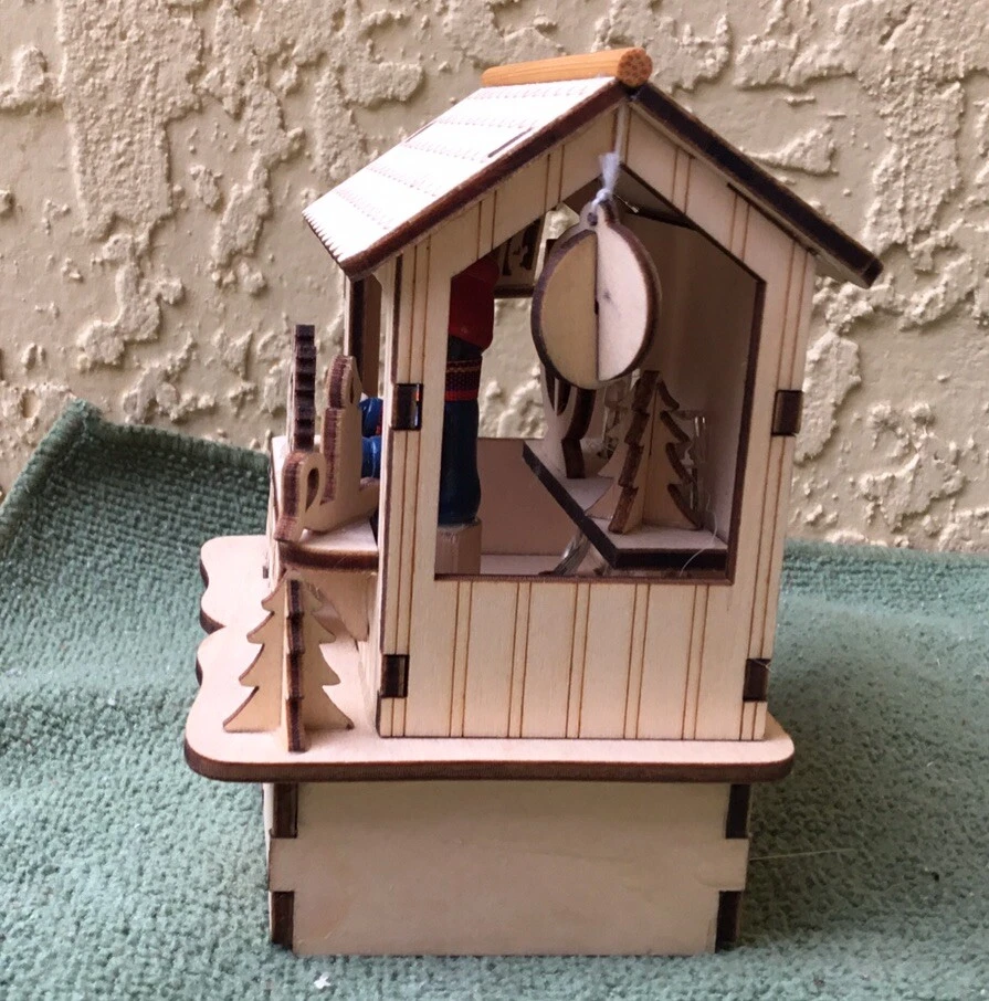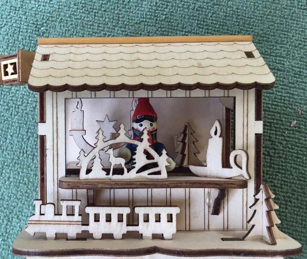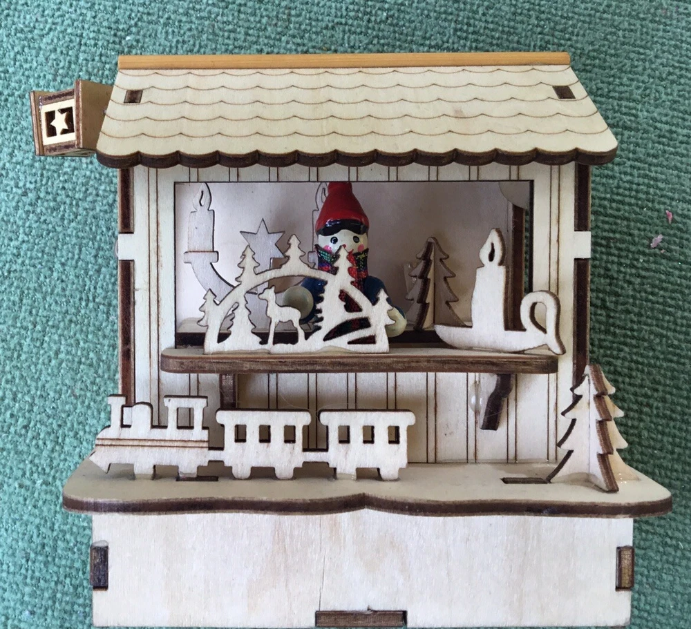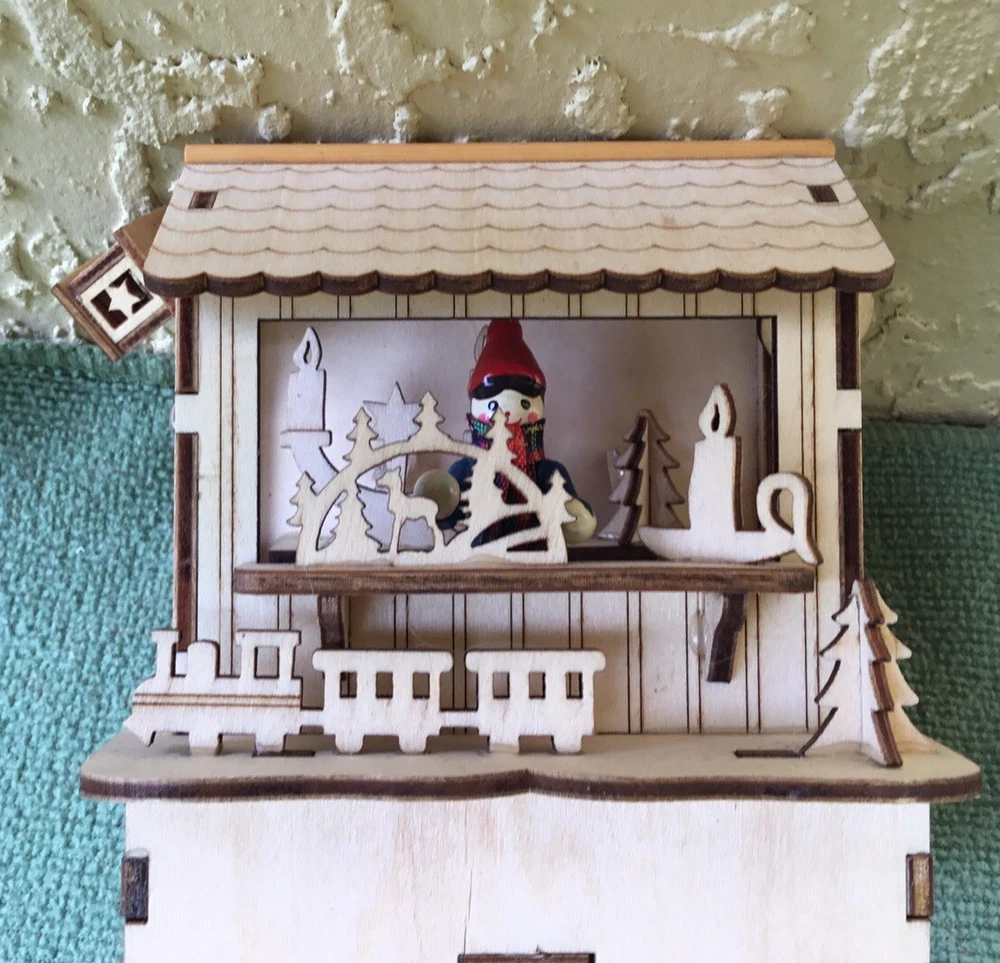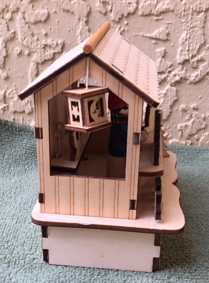 This New unused LED Wooden Cut Out Christmas Tabletop Decoration will have a Christmas Shop with a sales person attending the shop selling Christmas related items and toys. It will be battery operated and would made a nice desktop Holiday decoration. It will measure 5" tall x 4" wide x 3 3/4" deep. It will be made of high quality wood and has exquisite details.