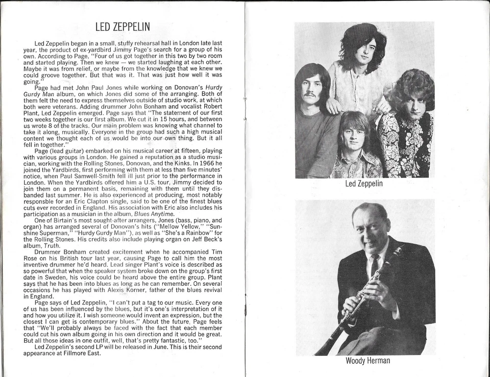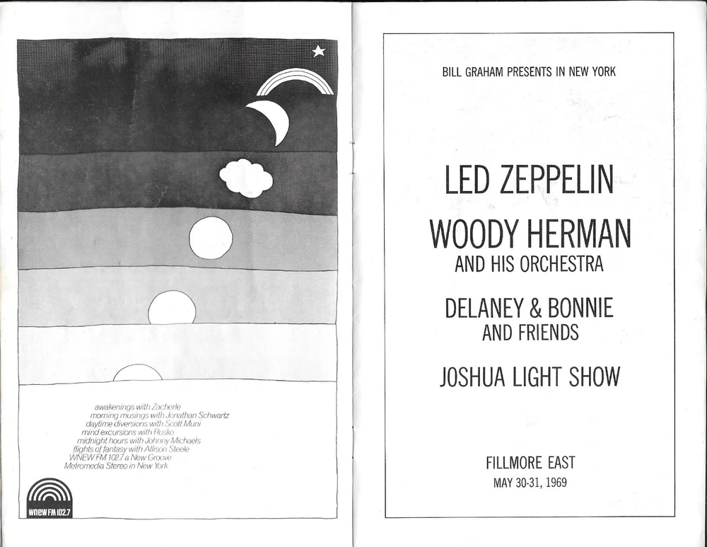 BEAUTIFUL ORIGINAL CONCERT PROGRAM FROM BILL GRAHAM'S FABLED FILLMORE EAST IN NEW YORK CITY FROM MAY 1969 THIS PROGRAM IS FOR LED ZEPPELIN, WOODY HERMAN ORCHESTRA AND DELANEY & BONNIE & FRIENDS (BEFORE ERIC CLAPTON TOURED WITH THEM) HAS GREAT UPCOMING SHOW ADS (THE WHO, GRATEFUL DEAD, JEFF BECK JEFFERSON AIRPLANE, CREEDENCE, CSN AND MORE) AND PERIOD ADS FOR STORES AND ALBUMS AS WELL - GREAT 1960'S COLLECTIBLE VERY GOOD CONDITION (HAS SOME HANDLING AND SOILING ON COVERS) GUARANTEED AUTHENTIC - ITEM GUARANTEED AS DESCRIBED - (PLEASE SEE MY FEEDBACK PROFILE - MUCHO POSITIVE SATISFACTION RATING !!!) - -BUYER PAYS SHIPPING CHARGES (I use USPS and Insurance COST $ 8.00 ----)- SHIPPING OCCURS WITHIN TWO DAYS OF YOUR PAYMENT - - PLEASE FEEL FREE TO E-MAIL ME WITH ANY QUESTIONS PRIOR TO BUYING - -- PLEASE CHECK MY "ME" PAGE PLEASE SEE MY OTHER AUCTIONS FOR MORE ORIGINAL 1960'S - 70'S ROCK AND ROLL MEMORABILIA............................ THANKS AND STAY IN TOUCH
