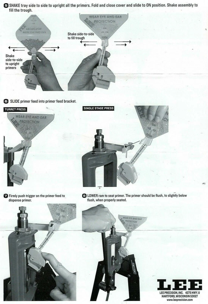 Lee Safety Prime is a new priming system for small and large primers, never touch the primers from box to shell. Used with 2006 and newer Breech Lock Challenger, Turret Presses, Classic Turret Press, Breech Lock Classic Cast, Classic Cast Press, and Auto Breech Lock Pro Press. FREE SAME DAY SHIPPING FOR ORDERS PLACED BY NOON EASTERN TIME. We are a Lee Master Distributor and ship within one day. Items ordered by noon, EST usually ship same day. All of our Lee products come Direct from Lee Precision Inc and are BRAND NEW. Every Lee reloading tool is unconditionally guaranteed by Lee for two full years and has a limited lifetime guarantee. Lee Precision has been making high quality reloading equipment for 60 years. Lee dies and products will last a lifetime and not wear out with normal care. Returns accepted if you are not completely satisfied. Some listings may have a sample photo.