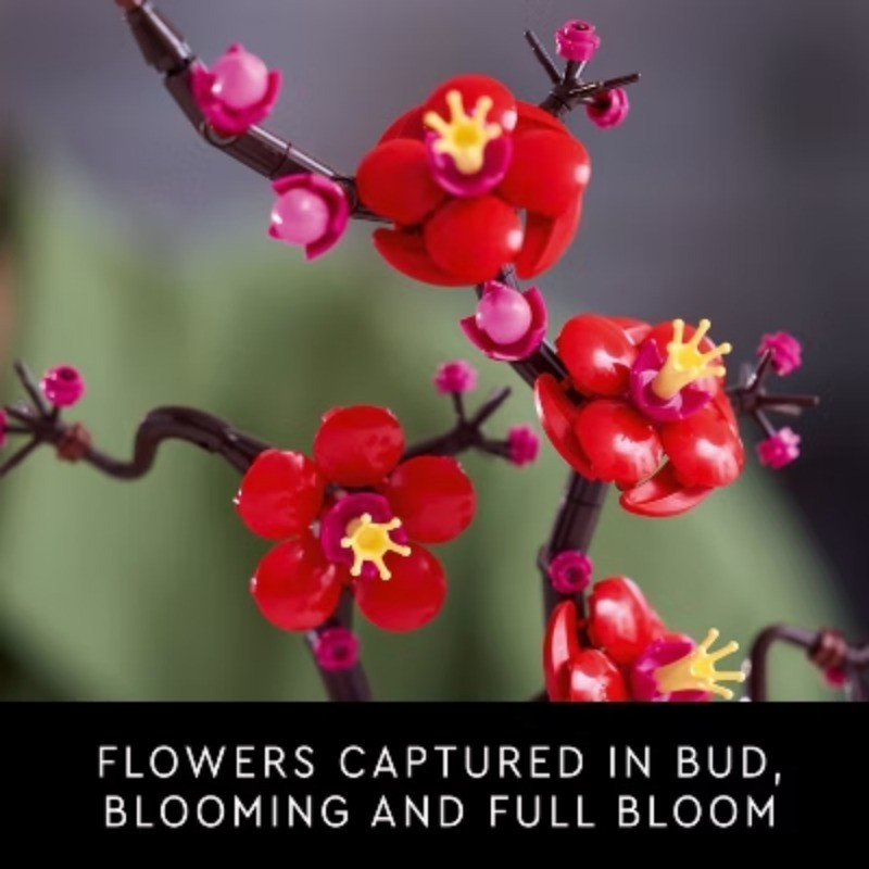 Embark on a tranquil journey with the LEGO Icons Plum Blossom building project for adults. This detailed interpretation depicts the iconic winter flora with its elegant stem and vivid red and magenta flowers nestled in a pastel-blue pot with a golden band and wood-effect plinth. Let your creativity blossom as you craft each intricate detail then proudly display your creation for all to enjoy.