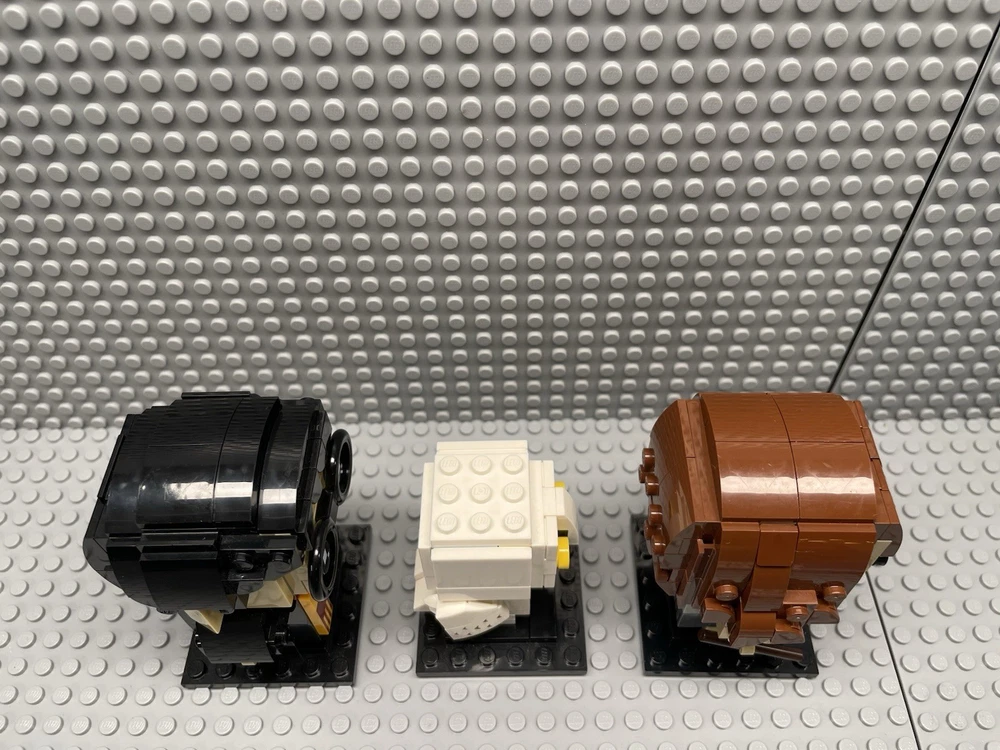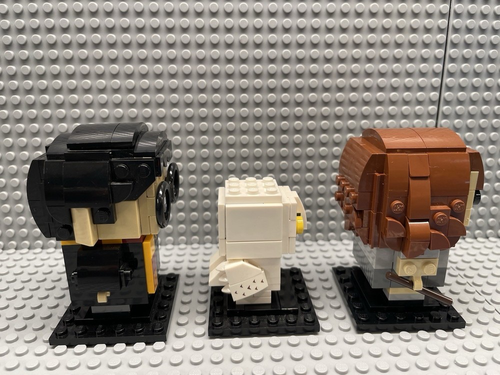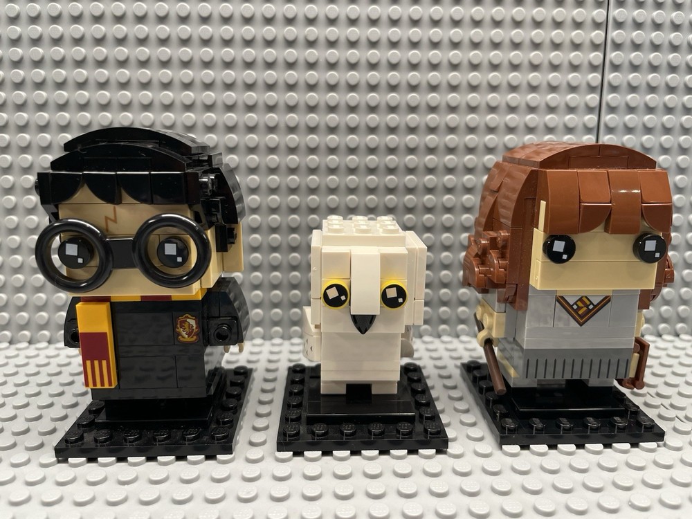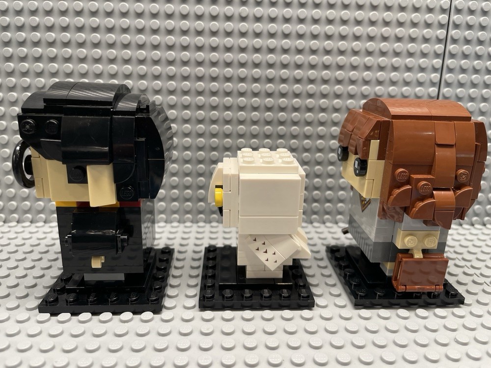 LEGO. BrickHeadz Lot. Harry Potter & Hedwig (41615) and Hermione Granger (41616). Notes: - The BrickHeadz came from a garage sale. I did not perform a full inventory of the build. - You will receive what's pictured (except for the light gray base plates) - Bricks have play wear such as scratches, scuffs, etc. - Instructions included - No boxes - No extra pieces - Light gray base plates not included
