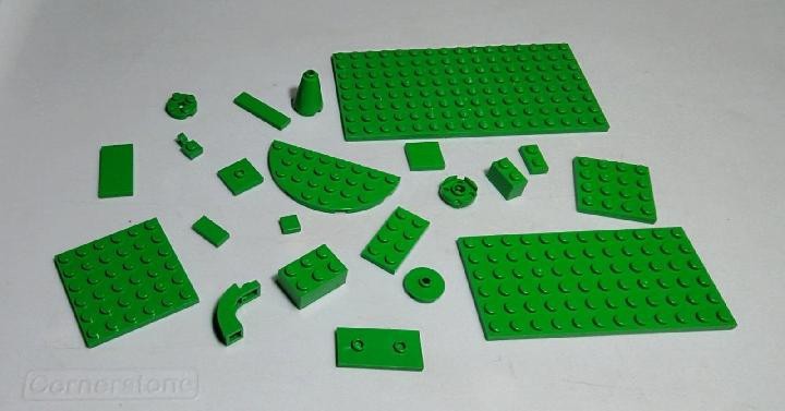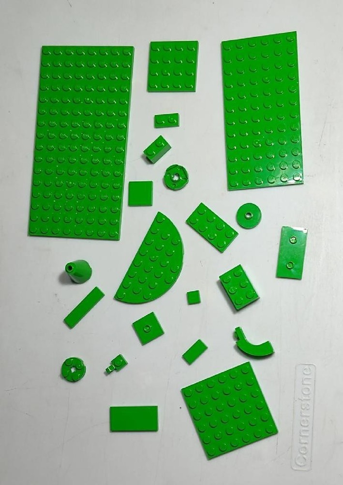 The product is a collection of LEGO bricks and pieces, including base plates of different sizes (6x12 and 8x16), cones, and various types of bricks. With a total of 101 pieces, this set allows for endless creative building opportunities for fans of LEGO building toys. The bright green color adds a fun and vibrant touch to the assortment of bricks, perfect for constructing intricate and imaginative structures. Ideal for both play and collectability, this LEGO set offers endless possibilities for creativity and construction.