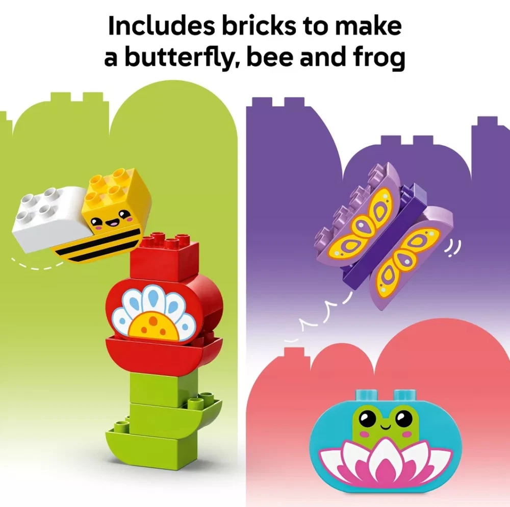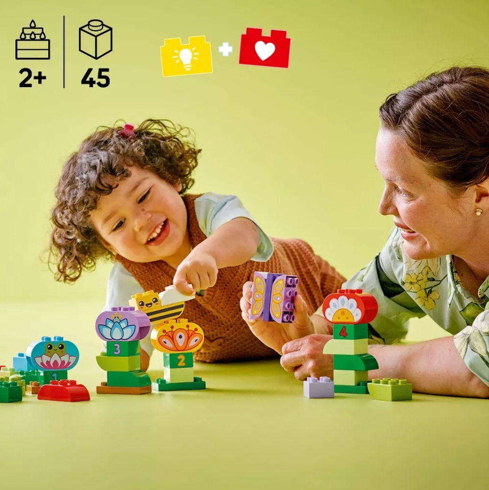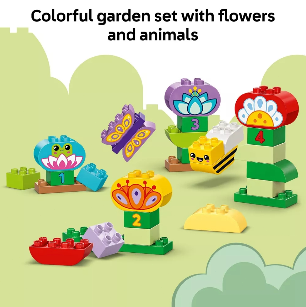 STACKING & BUILDING TOY – The LEGO DUPLO Town Creative Garden & Flowers stacking toy encourages free building and open-ended imaginative play for toddlers ages 2 and up SENSORY TOY – An assortment of toy bricks depicts numbers, flowers and animals so kids can recreate and engage with the world they see around them TOY FIGURE & PLAYSET – This preschool toy comes with 3 figures: a frog, a butterfly toy and a bee figure LEARNING & EDUCATIONAL TOY – Toddlers can improve their fine motor skills as they combine toy bricks to recreate scenes or build models in their own image PLAYSET GIFT FOR TODDLERS – This nature themed sensory toy makes a great holiday or birthday gift for boys and girls who love animal toys DIMENSION – This creative construction toy measures over 13.5 in. (35 cm) wide