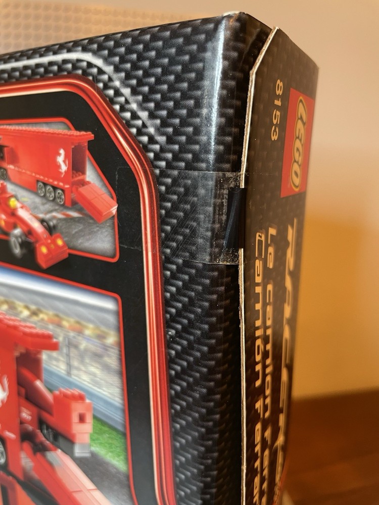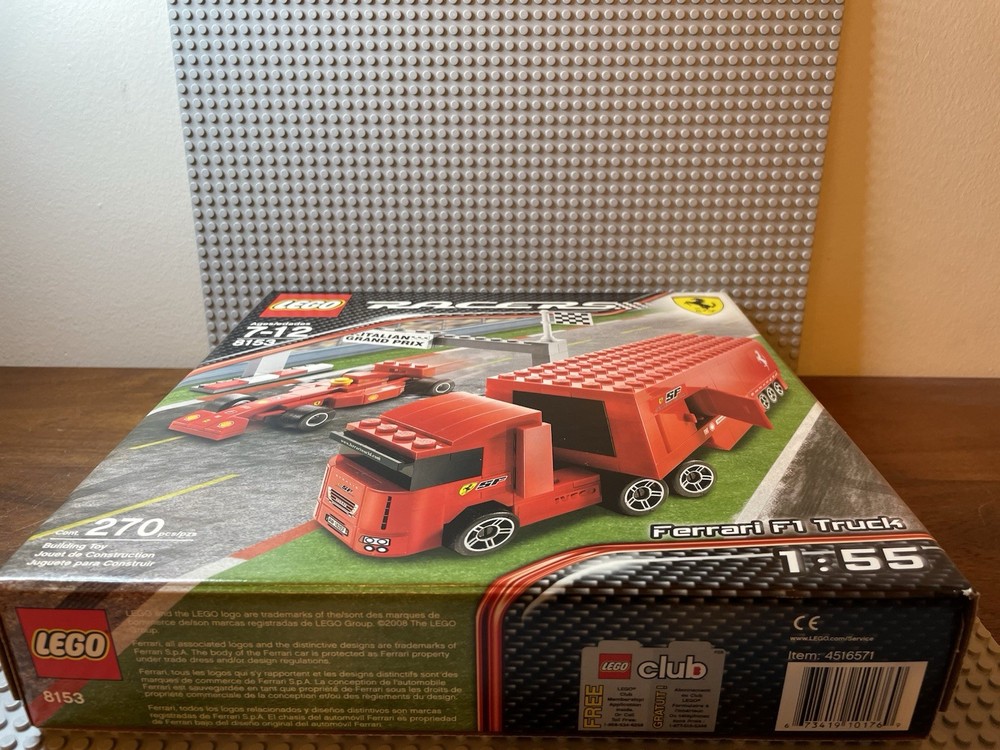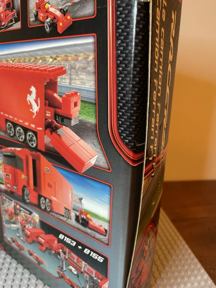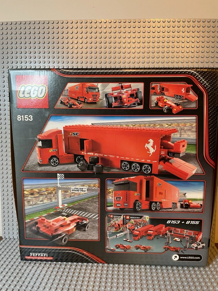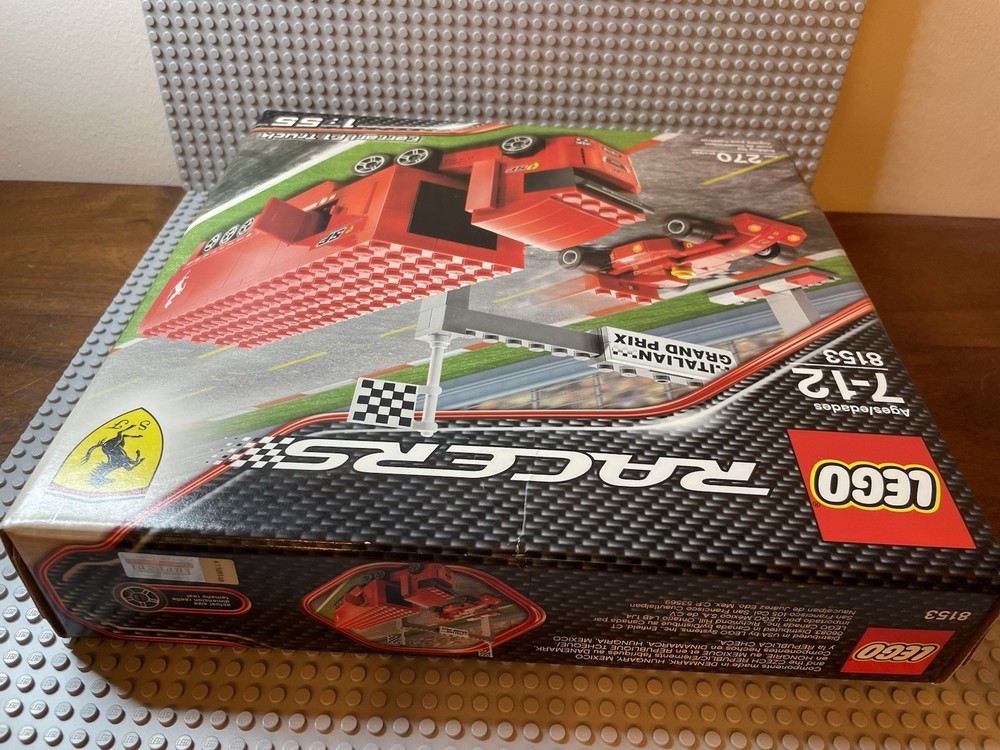 LEGO Racers: Ferrari F1 Truck (8153). New. Sealed Box. Box has shelf wear such as creases, scratches, dents. See pics for "bowing" on side flaps. Base plates not included.