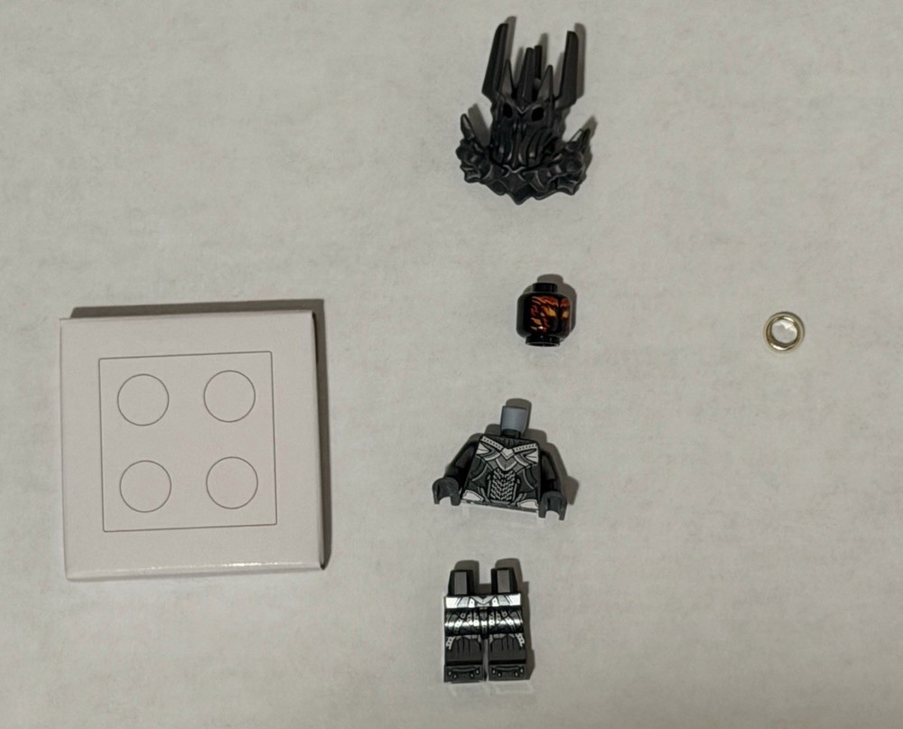 The LEGO Sauron Minifigure is a highly detailed and collectible toy featuring the iconic character from The Lord of the Rings. This minifigure set includes Sauron's Black Armor body, Cape, Ring, and the famous helmet, all made of durable plastic. Perfect for fans of fantasy and LEGO building toys, this set is designed for ages 7 and up and is part of the LEGO subtheme The Fellowship of the Ring. Add this unique piece to your LEGO collection to bring the world of Middle Earth to life.