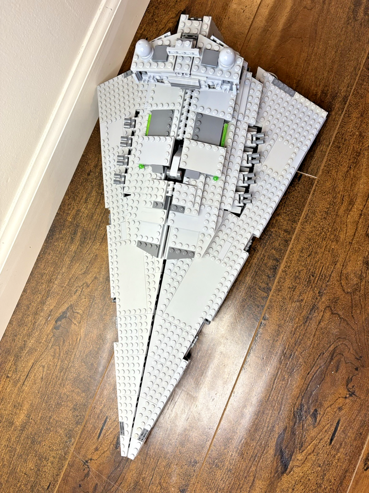 LEGO Star Wars: Imperial Star Destroyer (75055) - 99% Complete The ship build is complete but is missing most stickers. Some stickered pieces are included. Does not include minifigures or their accessories/weapons. Includes part of the mouse droid (the brick has studs on each side instead of only on 2 sides). Includes the trans-light blue Emperor Palpatine Hologram statue. Disassembled for shipping. No box, no manual. Sets that are pre-owned may contain light play wear. Minor imperfections include minor yellowing, light scratches, rubs, marks, or print issues.
