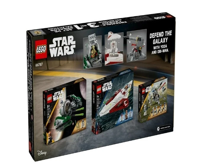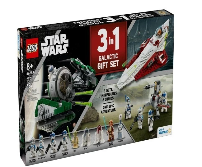 LEGO Star Wars Jedi Masters Gift Set, 3 Epic Builds in 1 Box, 66787,Freeship USA Product details Join forces with legendary Jedi Masters in an epic Starfighter battle. This exclusive Walmart gift pack for builders ages 8 and up features 3 exciting sets: LEGO Star Wars Yoda's Jedi Starfighter 75360, LEGO Star Wars Obi-Wan Kenobi’s Jedi Starfighter 75333, and LEGO Star Wars 501st Clone Troopers Battle Pack, 75345. Swoop and soar in the cockpit of the Delta-7, dodge canon fire and use the Force to defeat the dark side. This special edition Star Wars gift set includes 9 Minifigures including Yoda, Obi-Wan Kenobi, R2-D2, Taun We, and more. Explore a galaxy far, far away with your favorite Star Wars characters! This LEGO Star Wars Jedi Masters Gift Set, makes the perfect holiday gift for Star Wars collectors and little builders. Contains 654 pieces. 3 sets in 1 – Stage epic battles with LEGO Star Wars Obi-Wan Kenobi’s Jedi Starfighter 75333, LEGO Star Wars Yoda’s Jedi Starfighter 75360, and LEGO Star Wars 501st Clone Troopers Battle Pack 75345 building sets Build with the Force – This 3-pack Star Wars gift set includes 2 Starfighters, 2 Jedi Masters, 2 droids, 4 Clone Troopers, 1 Taun We, plus 6 weapons and an AV-7 Anti-Vehicle Cannon Walmart exclusive – This value gift set is only available at Walmart Star Wars toy for ages 8 and up – the LEGO Star Wars Jedi Masters Gift Set is the perfect gift for Star Wars fans ages 8 and up Add to their LEGO Star Wars collection – Includes 9 collectible Star Wars Minifigures to recreate iconic scenes and action-packed adventures Safety is a priority – LEGO components are dropped, heated, crushed, twisted and carefully analyzed to make sure that they comply with stringent global safety standards More details Features Collectible Brand LEGO Age Range 8 Years & Up Character Star Wars Product Line Star Wars Theme LEGO Star Wars Manufacturer LEGO Systems Inc Material Plastic Color Multicolor Assembled Product Weight 2.45 lb Assembled Product Dimensions (L x W x H) 20.91 x 10.47 x 2.72 Inches
