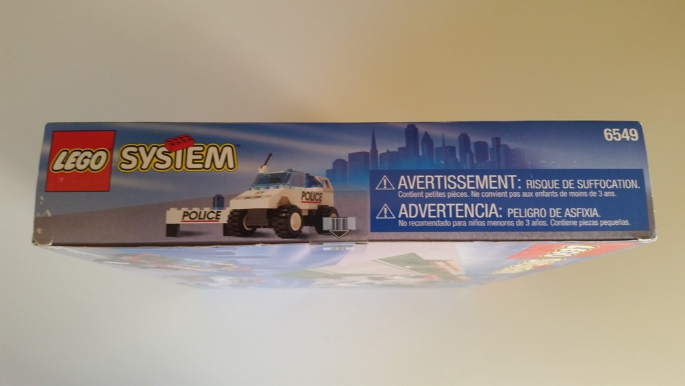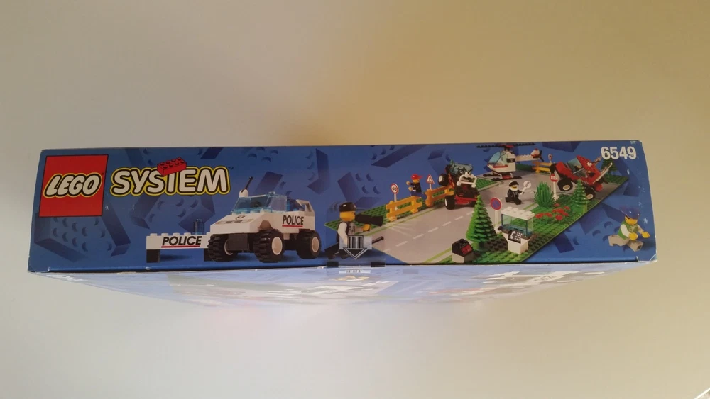 This vintage LEGO set from 1996 is a Town-themed "Roadblock Runners" set with 50 pieces. The set allows for two different build sides and is 2 feet x 3 feet. It comes in a box packaging and is recommended for ages 5-12. The LEGO set number is 6549, and it is part of the 2 in one Floor Puzzle product line by LEGO. Puzzle only, as originally sold. Some crush to box as stored but FULLY COMPLETE