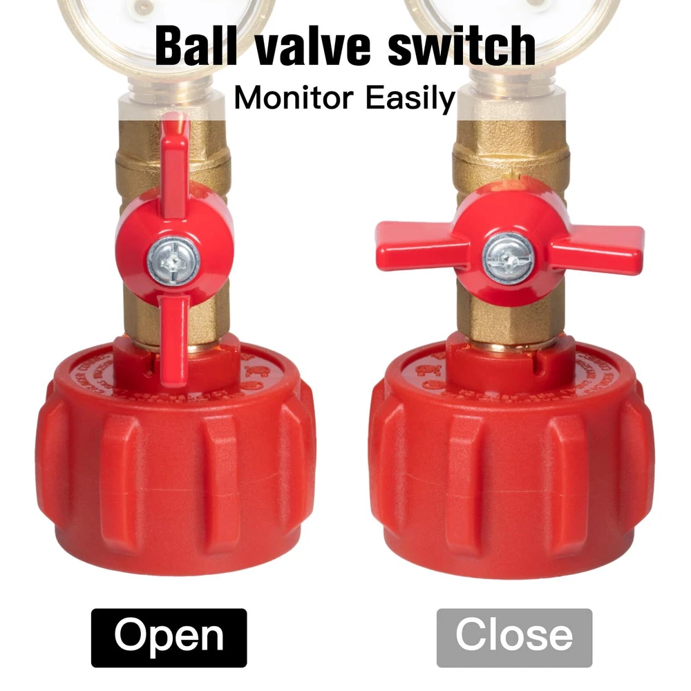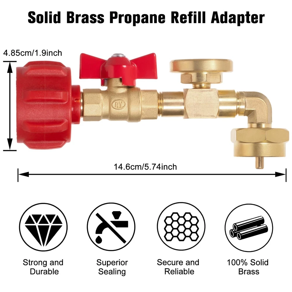 Upgraded 90-Degrees Elbow Design: This 90 degrees elbow propane refill adapter upgraded with new connectivity methods to make it easier and no tools required, and it with hand-wheel grip for tightening, you can easily connect your large cylinder to 1LB propane tank ON-Off Control Valve and Gauge: This propane refill adapter equipped with a propane ON-OFF control valve and gauge, which's can minimizes gas leaks during cylinder connections and precise control over the refilling process, allowing for safe and controlled refilling Secure and Reliable: The corrosion-resistant solid brass material provides better sealing and durability, while the valve, pressure gauges and built-in overflow protection device integrated safety features effectively mitigate the risk of overfilling gas cylinders Easy to Use: Easily refills your 1 pound bottles multiple times without tools, helping you save on the cost of buying new green propane gas cylinders, the pressure gauge can quickly check the remaining gas of large tank to avoid the inconvenience caused by insufficient gas during the filling process Additional 1 LB Propane Bottle Cap: The 1 LB propane bottle cap is useful for your camping stoves, home applications, barbecue, propane heater or others equipments that use 1 lb propane tank. You don't need to spend extra money to buy the cap. Use and Attention: Connect the QCC1/Type1 coupler to the large propane tank cylinders and place the other end of the rotary control nut is connected to the 1LB propane tank. Turn the large propane tank upside down in the safe corner so the liquid can flow out. Stay away flames and sparks for safety. Compatibility & Packaging: This adapter fits for 5-40LB propane tank refill 1LB bottle, suitable for heater, camping stove, portable and tabletop grill etc. The kit includes: 1* Elbow QCC1 Propane Refill Adapter with Valve and Gauge, 2* 1 LB Propane Bottle Cap, 1* Roll Sealing Tape.