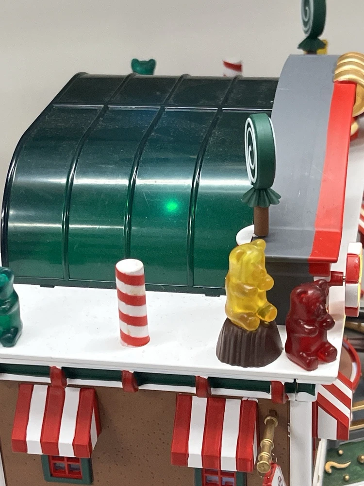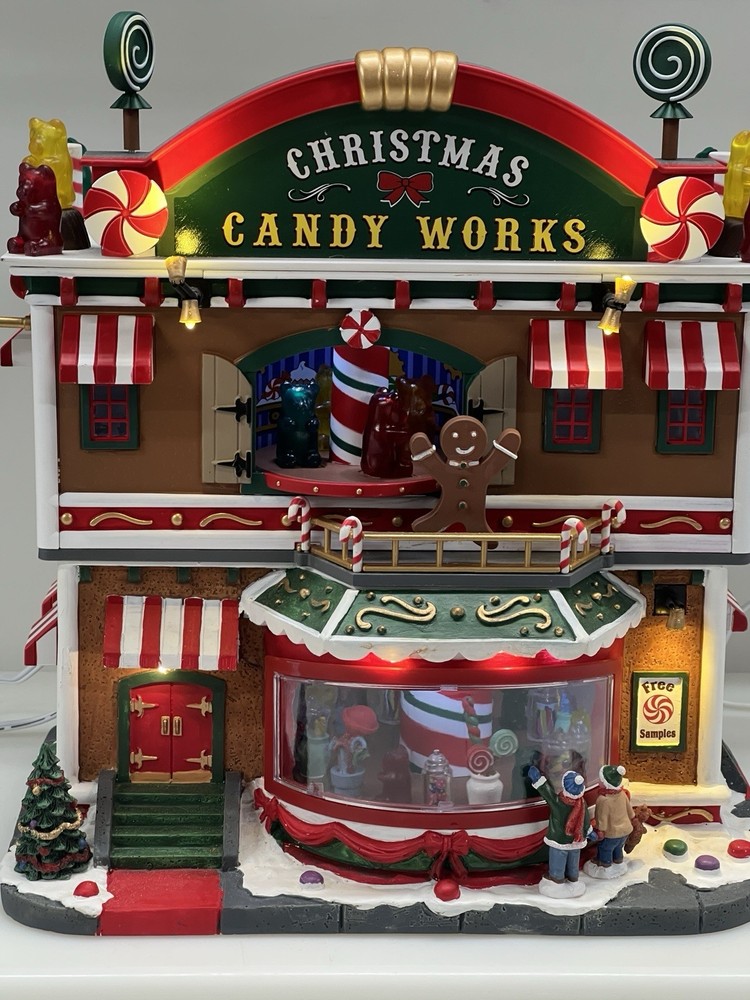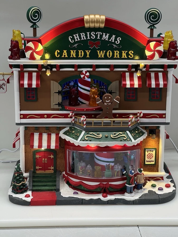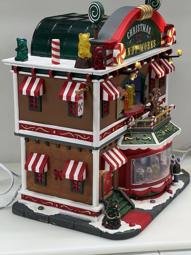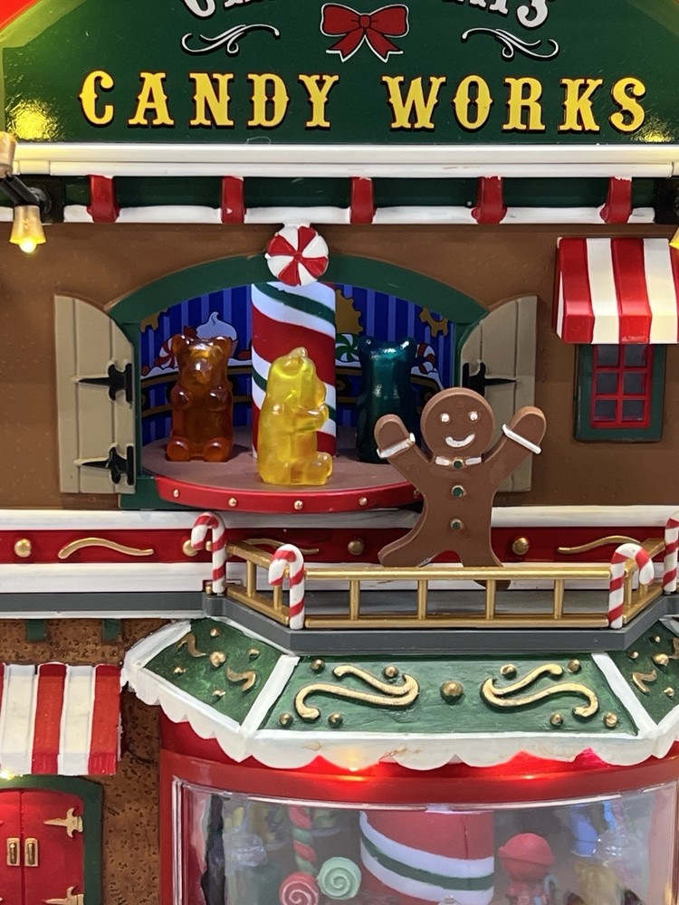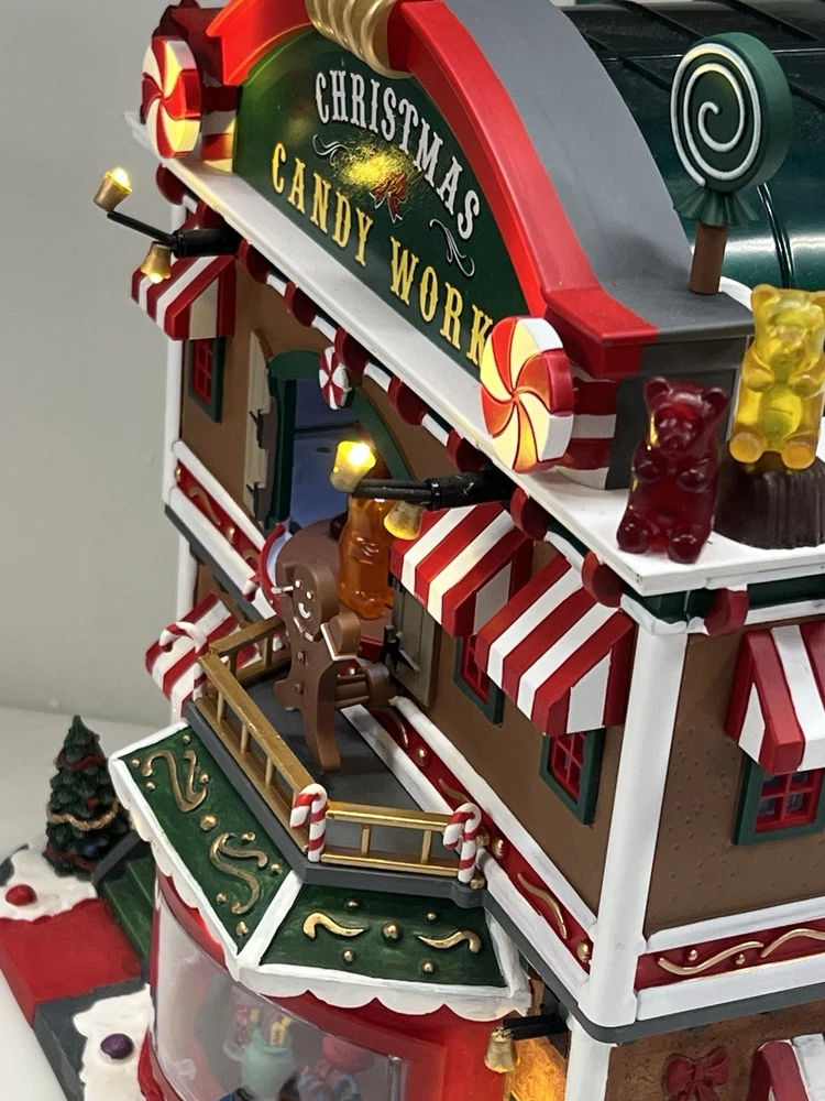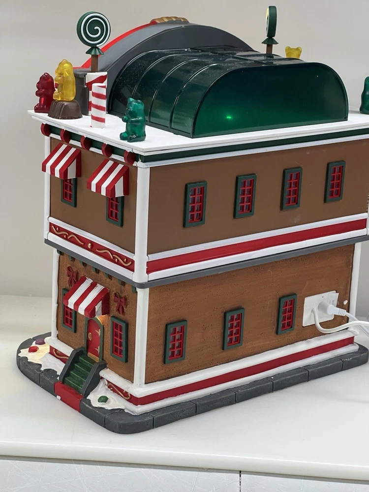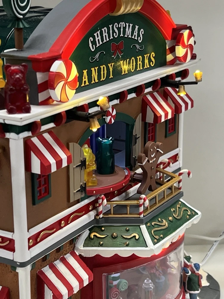 This is a large and asymmetrical Christmas Village Candy Factory made by Lemax in 2016. It features a whimsical candy factory with Santa, candy, and elf characters. The village comes with lights, music, and animation features, making it perfect for creating a festive atmosphere in any room. The village is made of mixed materials with a painted finish and comes in its original box. It is part of the Lemax Christmas Collection and would make a great addition to any holiday display. Absolutely incredible pristine condition. Lights, music , sound, motion ! Comes in original clean packaging including a/c cord . Just a beautiful whimsical piece to add to any village collection! Perfect condition! Comes in a very large box .