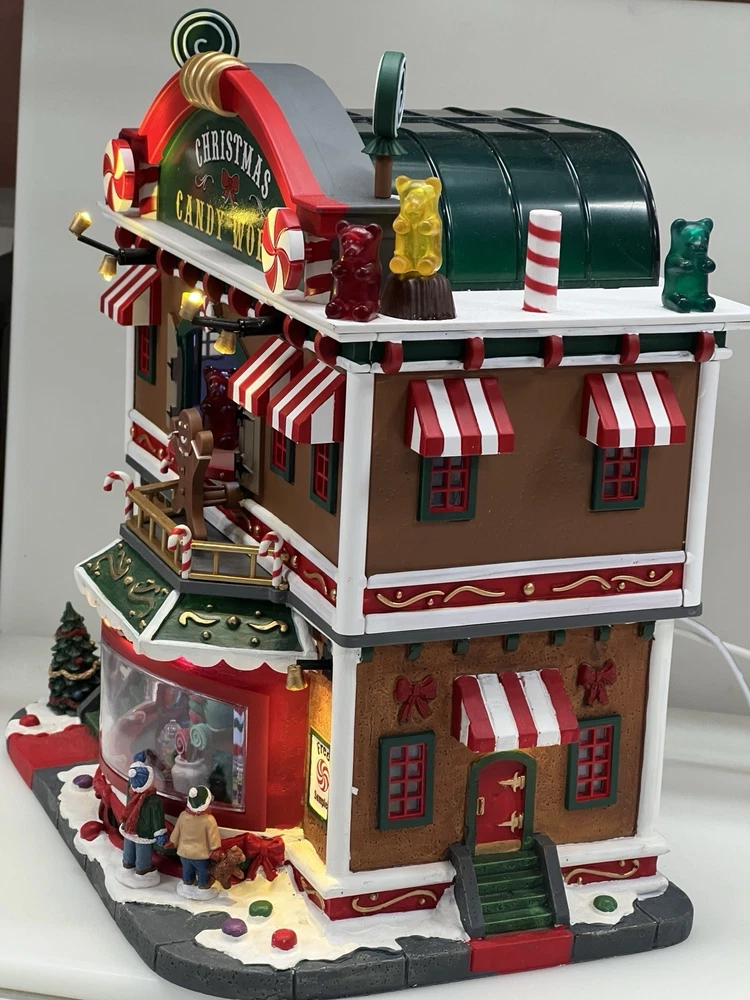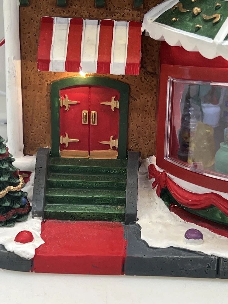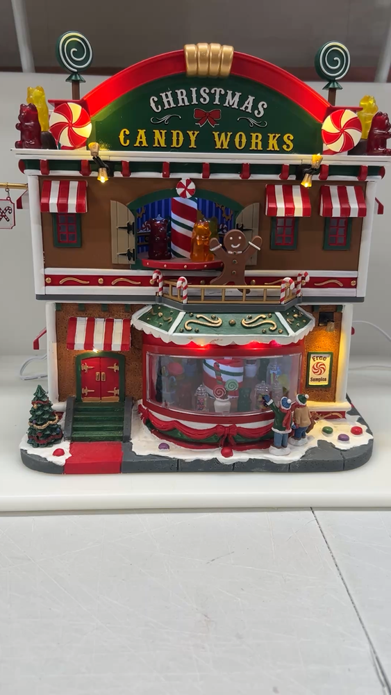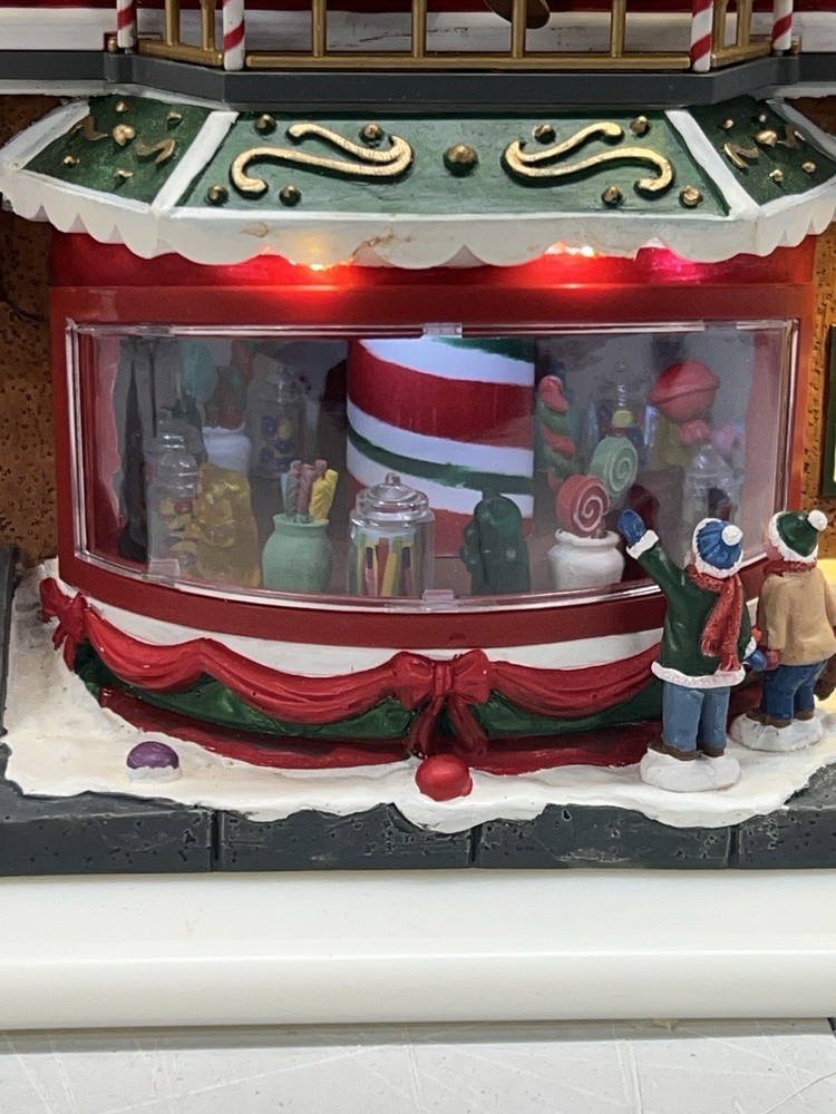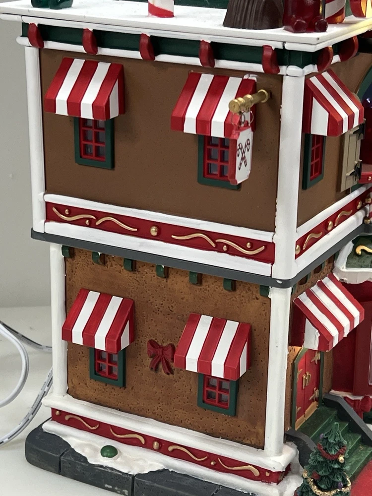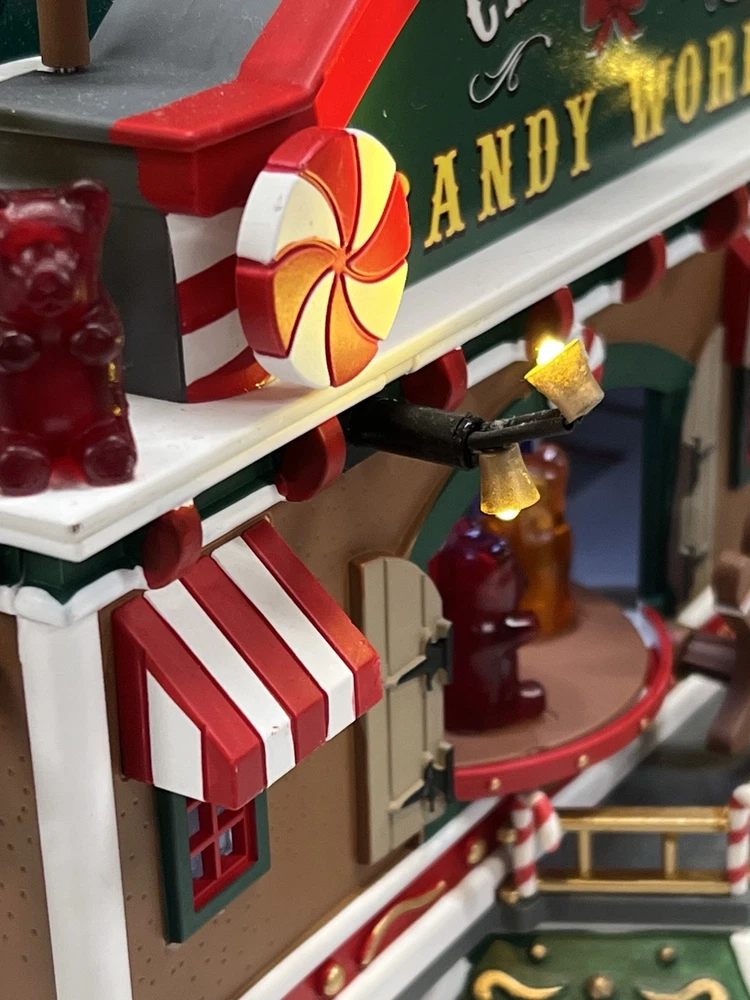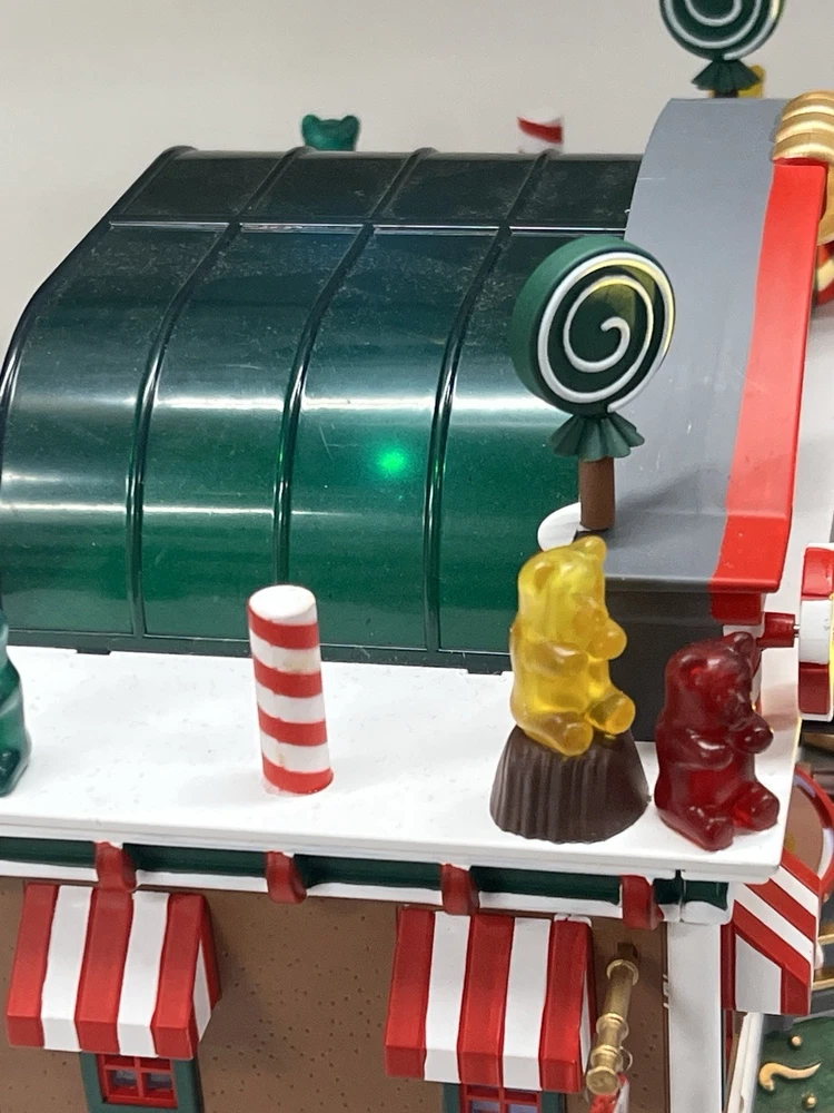 This is a large and asymmetrical Christmas Village Candy Factory made by Lemax in 2016. It features a whimsical candy factory with Santa, candy, and elf characters. The village comes with lights, music, and animation features, making it perfect for creating a festive atmosphere in any room. The village is made of mixed materials with a painted finish and comes in its original box. It is part of the Lemax Christmas Collection and would make a great addition to any holiday display. Absolutely incredible pristine condition. Lights, music , sound, motion ! Comes in original clean packaging including a/c cord . Just a beautiful whimsical piece to add to any village collection! Perfect condition! Comes in a very large box .