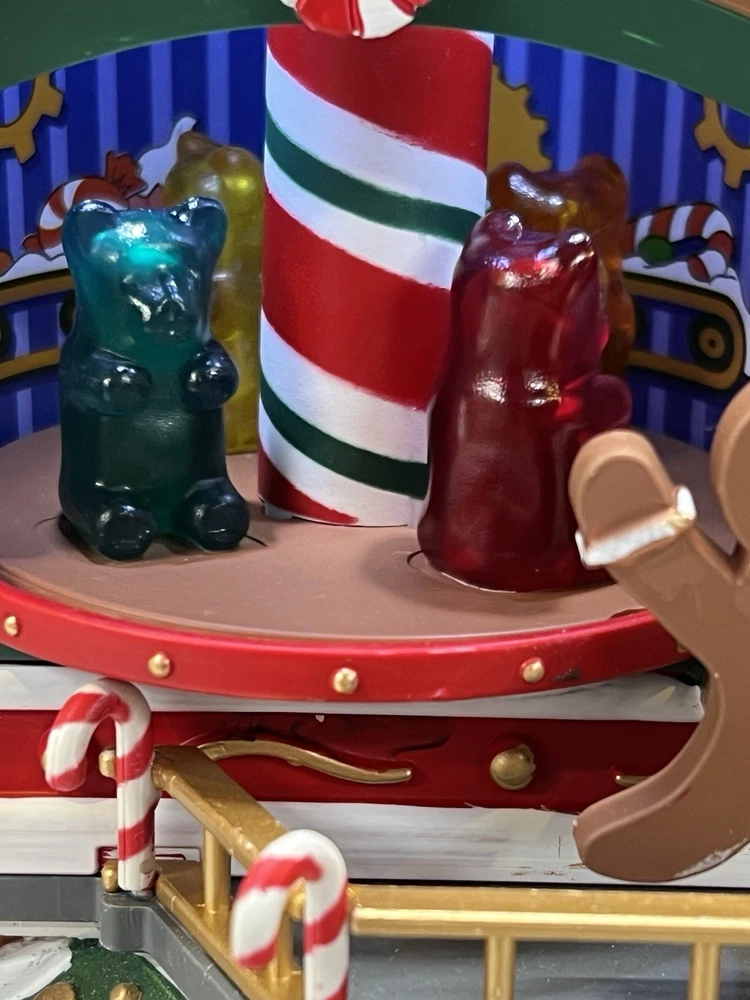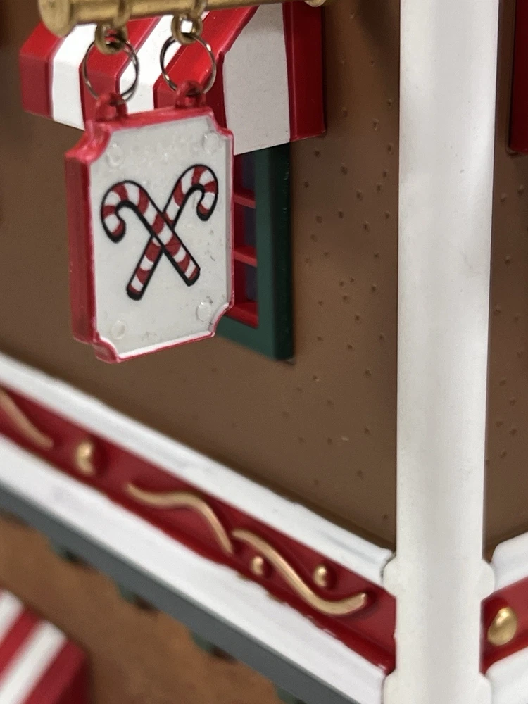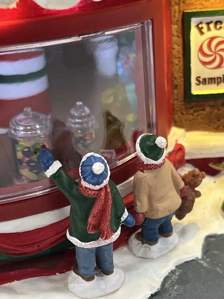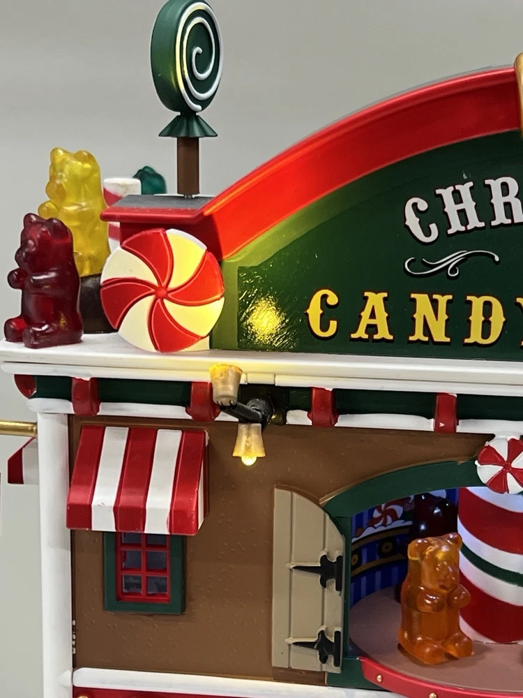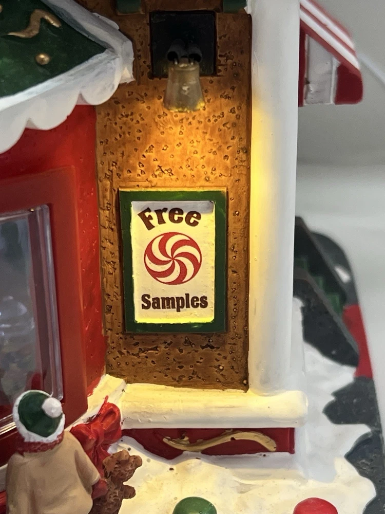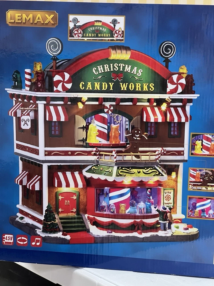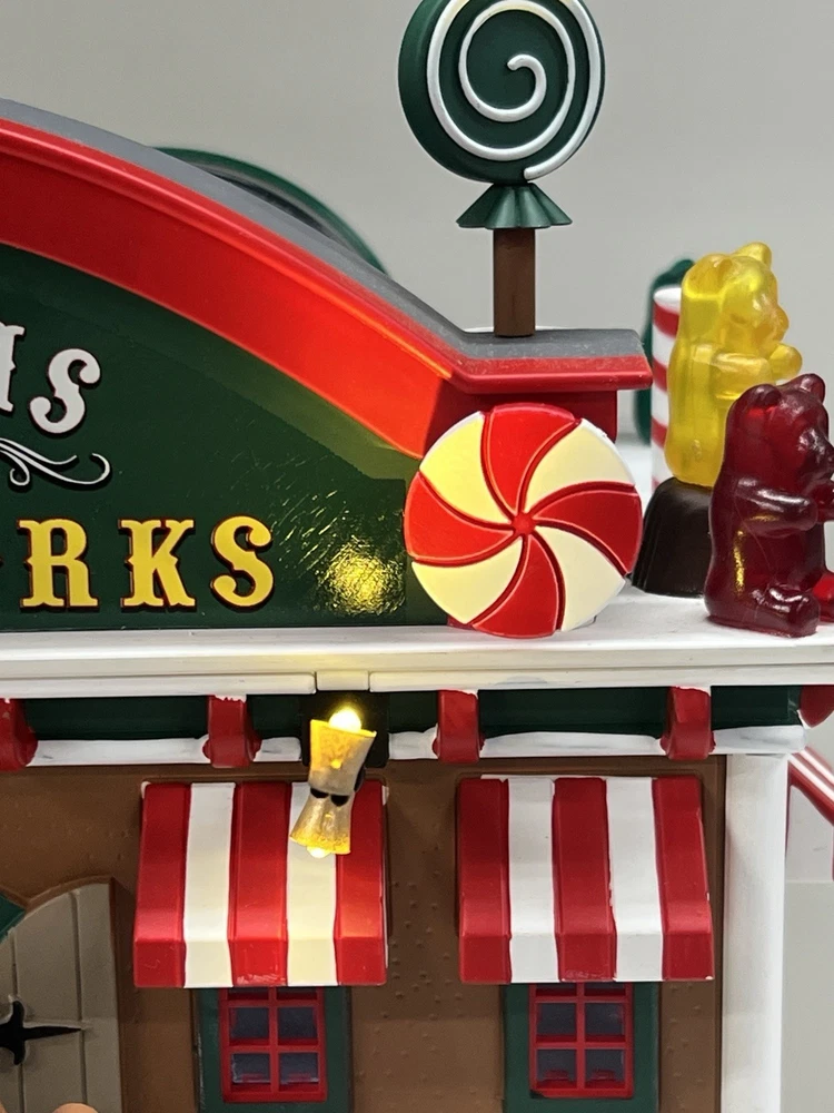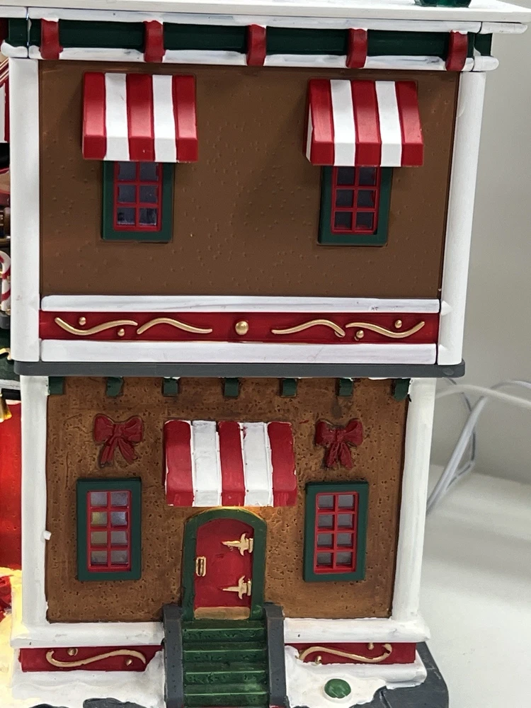 This is a large and asymmetrical Christmas Village Candy Factory made by Lemax in 2016. It features a whimsical candy factory with Santa, candy, and elf characters. The village comes with lights, music, and animation features, making it perfect for creating a festive atmosphere in any room. The village is made of mixed materials with a painted finish and comes in its original box. It is part of the Lemax Christmas Collection and would make a great addition to any holiday display. Absolutely incredible pristine condition. Lights, music , sound, motion ! Comes in original clean packaging including a/c cord . Just a beautiful whimsical piece to add to any village collection! Perfect condition! Comes in a very large box .