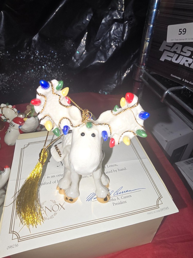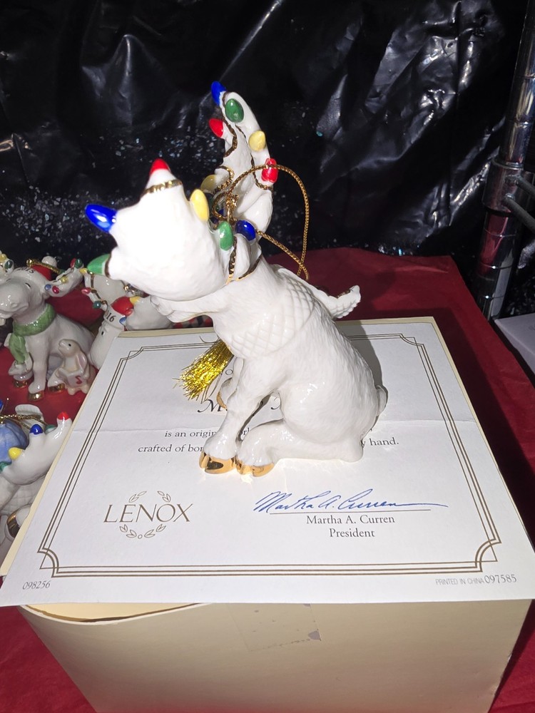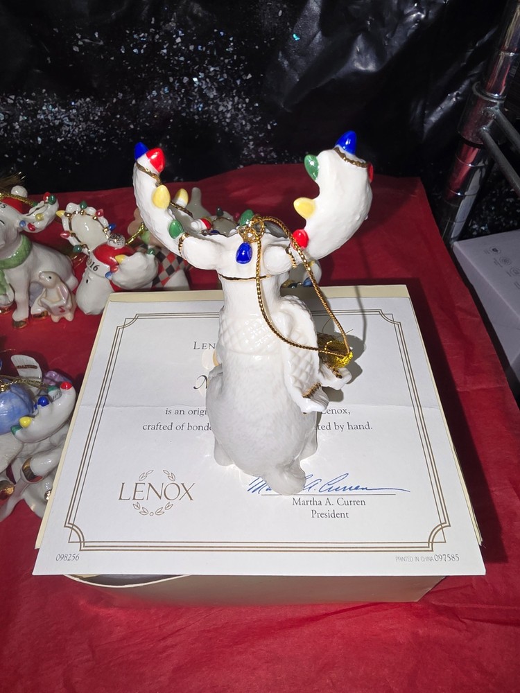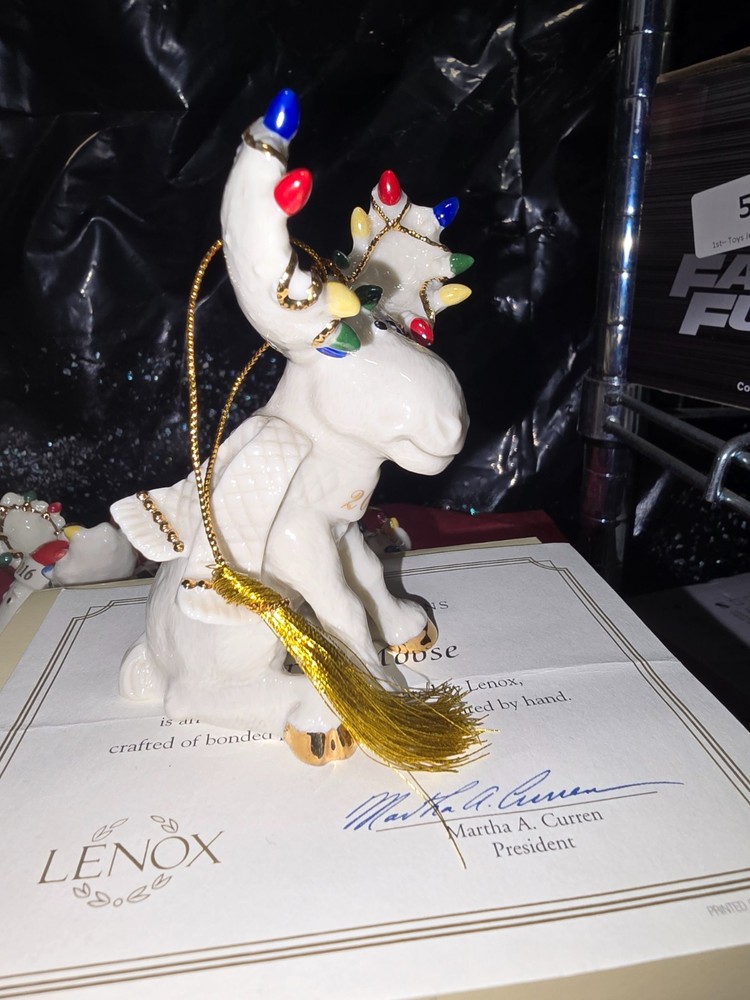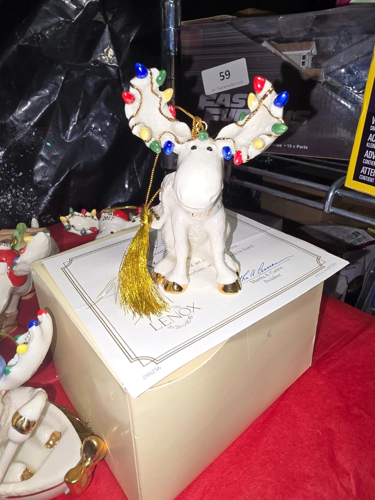 The LENOX Annual Christmas Ornament Marcel Merry Moose 2002 with box is a festive and collectible item perfect for the holiday season. Hand-painted and embellished with 24 kt gold accents.This limited edition ivory porcelain ornament features a charming moose design, specifically a moose named Marcel. Manufactured by Lenox Annual Moose Collection. Comes in its original box and certificate of authenticity making it a cherished addition to any Christmas decor. Flawless condition.