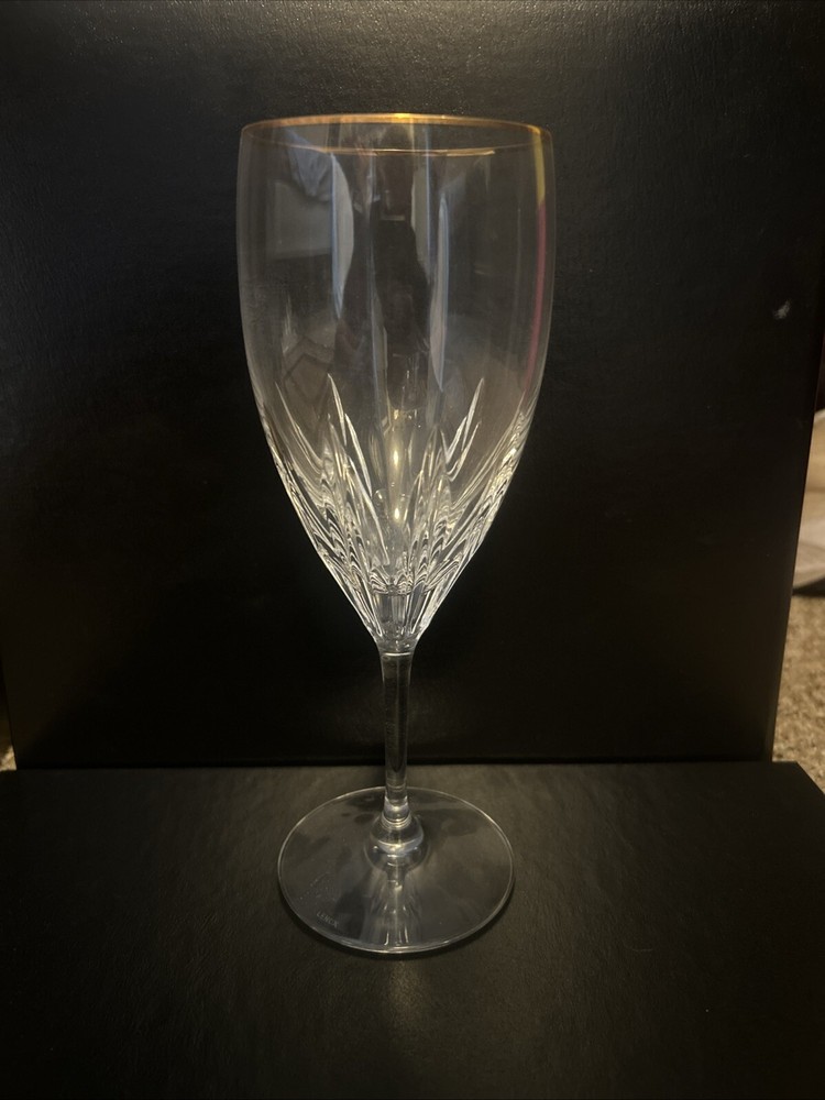 This Lenox Firelight Crystal Water Goblet Wine Glass stands at a height of 8 5/8 inches and features a clear crystal glass with a contemporary style. It is adorned with gold trim, adding a touch of elegance to the design. The glass is part of the Firelight product line from Lenox, produced in the United States during the 1990s. Perfect for serving water or wine, this piece is a timeless addition to any table setting for both casual and formal occasions.