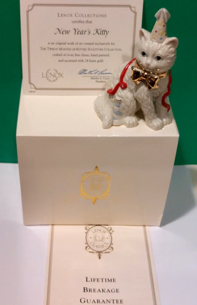 YES, I do combine on shipping even if ebay tells you I do not ! The Lenox "New Years Kitty" sculpture is crafted of hand painted Lenox ivory china accented with 24 karat gold. This from t he 12 Months of Kitties Sculpture Collection. The Kitty bears the Lenox hallmark and comes with the Certificate of Authenticity. The sculpture is about 4 inches tall and about 2 1/4 by 2 3/4 inches at the widest points This is NO LONGER AVAILABLE FROM LENOX it's Brand New, Never Displayed, Mint Condition in Original Lenox Box with COA Click here to see other CATS This item was just opened for the first time for Pictures and was checked for defects, it is Purrfect. If you have any questions feel free to ask Please check my listings for more Lenox collectibles. Yes, I do combine on shipping , multiple purchases can save you money on shipping. Payment must be received within 2 days of the purchase. Winning bidders must pay for the U.S. Mail delivery. With a cleared payment your package usually ships within 48 hours. Thanks for looking. --Yes, I do ship to APO and PO Boxes-- The shipping rate given does include insurance and tracking number.