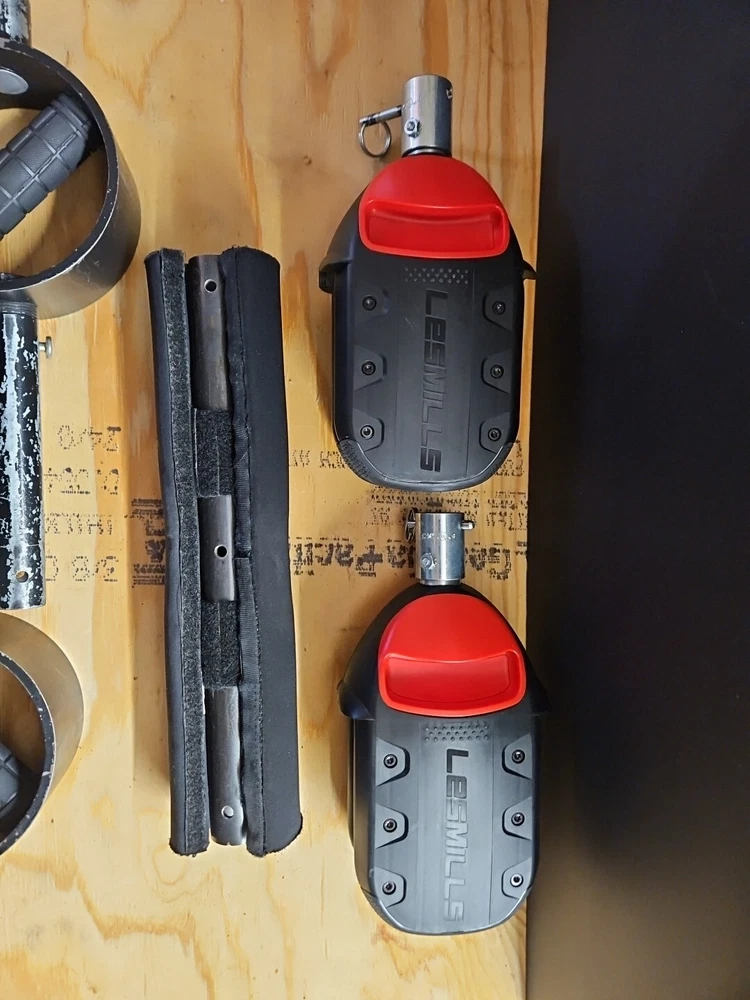 LES MILLS SMARTBAR Custom Set Clamps Breakdown Bar Kit Modular Read Look Unit max length is 61", shorter set point approximately 50". Modular packable workout bar it. See pictures. Includes 5 piece kit. With Zip close bag for storage as seen. Center padded bar. Two in line offset grip handles. Two end piece swivel Les Mills clamping ends. See pictures. Product will be shipped timely and packaged with care. Offers are encouraged. Please feel free to reach out with questions. Please see pictures. Thank you. Good used condition. Heavy paint wear from age and use. Markings from age and use. See pictures. Functional as it should. The LES MILLS SMARTBAR Custom Set includes modular weight plates and clamps for a full-body workout at the gym. The breakdown bar kit allows for easy assembly and adjustment during training sessions. Industrial shelf 1.