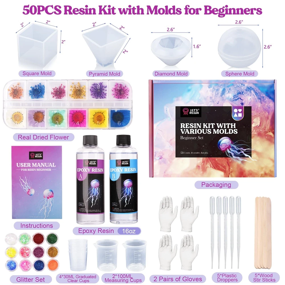 LET'S RESIN 16OZ Resin Molds Silicone Kit Complete Set Bundle with Sphere, Pyramid Molds, Resin Epoxy Starter Kit for Beginner Resin Casting Product Details Brand: LET'S RESIN Age Range (Description): Adult Color: purple Theme: Floral Item dimensions L x W x H: 3.15 x 1.97 x 1.97 inches Brand: LET'S RESIN Age Range (Description): Adult Color: purple Theme: Floral Item dimensions L x W x H: 3.15 x 1.97 x 1.97 inches Material: Resin, Silicone Seasons: All Seasons Included Components: Molds Item Weight: 16 Ounces Size: CA10223 Number of Pieces: 4 Style: Box Model Name: resin Special Feature: Resin starter kit with molds, epoxy resin, glitter set, and dried flowers Art Craft Kit Type: Resin Kit Manufacturer: LET'S RESIN Product Dimensions: 3.15 x 1.97 x 1.97 inches Item model number: 1 Item Weight: 1 pounds Country of Origin: China Date First Available: June 29, 2021 All in One Epoxy Resin Kit: Dive into resin art with our complete kit featuring 4 versatile silicone molds, 16oz of premium epoxy resin, a dazzling 12-color glitter set, 12 real dried flowers, and essential tools like measuring cups, wooden sticks, gloves, and droppers. Perfectly tailored for beginners, ensuring a seamless start to your resin art journey. High-Quality Epoxy Resin: The eposy resin kit includes 16oz of specially formulated epoxy resin, comprising 8 oz resin part and 8 oz hardener part. With a simple 1:1 volume ratio mix, achieve flawless results without the worry of fisheye or unevenness. It usually takes 8-24 hours to cure in summer and longer in winter. When using resin in winter, please warm the resin by water bath first and keep the working surface warm as well Superior Silicone Molds: LET'S RESIN silicone molds boast exceptional quality, crafted from safe and durable silicone material with superior tear strength. Designed for longevity, these molds maintain precise shape, ensuring your art remains flawless. Compatible with various casting materials including epoxy resin, soap, wax, and more. Dried Flowers and Vibrant Glitters: Elevate your resin creations with our collection of 12 dried real flowers and an array of colorful glitters and sequins. Perfect for crafting stunning resin jewelry such as pendants, rings, bracelets, or adding flair to any project. Unleash your creativity and design unique pieces that reflect your style. Perfect Gift for Creativity: Our resin starter kit comes packaged in a beautifully designed box, making it an ideal gift for birthdays, anniversaries, or Christmas. Comes with a comprehensive tutorial, it's perfect for beginners looking to master resin art. Have questions? We're here to helpreach out to us anytime for assistance.