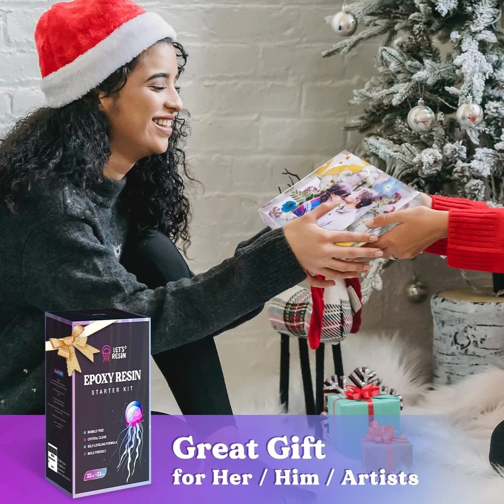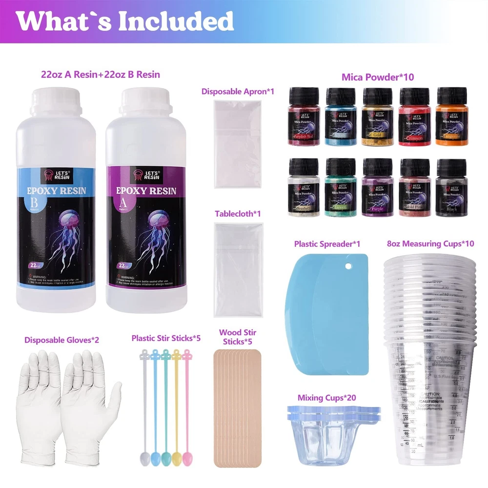 LET'S RESIN Epoxy Resin Starter Kit for Beginners, 44OZ Resin Art Kit for Craft,Fast Cure Resin for Coating,Jewelry,Tumbler,Paintings, Crystal Clear Casting Resin with Cups, Pigment Powder Product Details Brand: LET'S RESIN Color: 44oz resin kit Material: Epoxy Resin Seasons: All Seasons Included Components: Measuring cups, stir sticks, pigment powder, and more resin kits tools Brand: LET'S RESIN Color: 44oz resin kit Material: Epoxy Resin Seasons: All Seasons Included Components: Measuring cups, stir sticks, pigment powder, and more resin kits tools Item Weight: 1 Pounds Number of Pieces: 1 Paint Type: Acrylic Style: Modern Special Feature: Starter Kit, User-friendly, Durable, Crystal Clear, Self-Leveling Art Craft Kit Type: Resin Art Kit Manufacturer: LET'S RESIN Package Dimensions: 15.27 x 10.08 x 4.57 inches Item Weight: 1 pounds Country of Origin: China Date First Available: January 17, 2022 LETS RESIN Epoxy Resin: This epoxy resin kit had the 44 oz(22oz+22oz) bottles and it comes with some supplies like measuring cups, stir sticks ,10 colors pigment powder and more resin kits tools, provide everything that you need to get your project going. Premium Clear Epoxy Resin: Self-leveling, crystal clear and high gloss, cures crystal clear and hard as a rock, anti-scratch and anti-yellowing function can make your artwork and DIY projects better protected. Super Easy to Mix and Apply: With a 1:1 mixing ratio, our casting resin kit is simple to use, even for beginners and hobbyists. The resin is bubble free and easy to work with and the results are perfect. Safe and easy applications for long-lasting. Wide Application: Our clear epoxy resin kit is ideal for all of your coating and casting applications like coating artwork,table top,bar top,river tables,jewelry making, countertops,resin art,tumblers,acrylic pour paintings, Molds. Warm Tips: Our resin has a 1-year shelf life. If you receive cloudy epoxy resin, simply warm the bottles in warm water to restore clarity. The curing time is 8 to 24 hours in summer and longer in winter. When using resin in winter, please warm the resin by water bath first and keep the working surface warm as well. To avoid the problem of not-curing, please carefully read the manual before operation and conduct a small amount of testing first. In case of any problem, you can contact us at any time, and we will handle it immediately