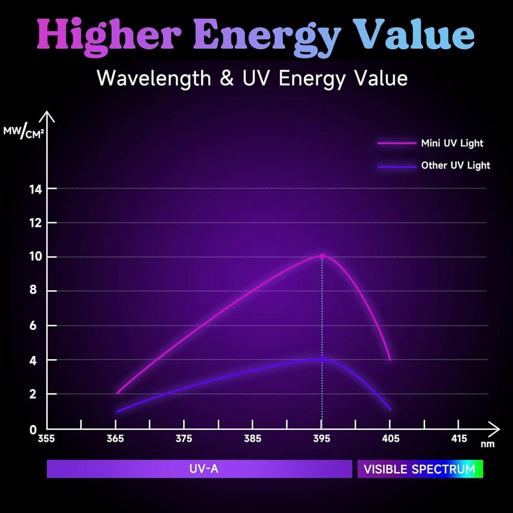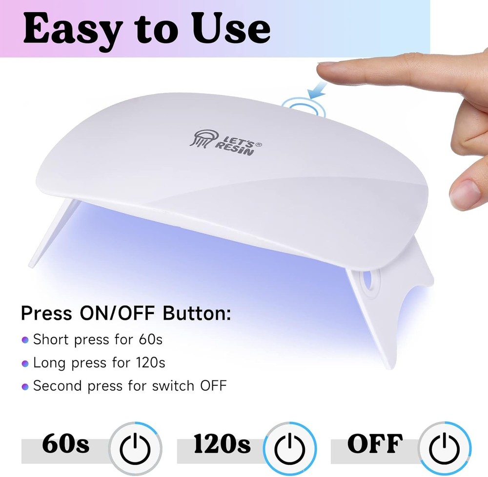 LET'S RESIN Mini UV Light for Resin, 2.5Times Higher Energy Mini, White Product Details Item Weight: 0.09 Kilograms Brand: LET'S RESIN Color: White Material: Resin Shape: Rectangular Number of Light Sources: 6 Wattage: 36 watts Number of Items: 5 Number of Pieces: 1 Size: Mini Manufacturer: LET'S RESIN Product Dimensions: 5.35 x 3.54 x 0.94 inches Item Weight: 3.2 ounces Item model number: ELR08003 2.5 Times Higher UV Energy Value: Exclusive custom chip and lamp bead, LET'S RESIN mini UV light with 2.5 times higher UV energy value than other UV lamps, with a better curing effect and faster-curing speed. It can quickly cure UV resin, non-stick. Long Service Life & Strong Stability: LET'S RESIN UV light customized professional mini UV lamp with 6 double light source beads, uniform distribution, 36W power, durable. It's not easy to lose energy, with longer life and stability. Easy to Use & Carry: The UV light adopts a one-button irradiation switch of the 60S/120S, which is easy to use. To meet the needs of UV resin enthusiasts, we specially customize a 103cm USB flat cable, which is convenient for you to move the UV lamp during crafts. Net weight is 84g, folding support frame, you can carry UV lamp anytime. Perfect Gift for You: Use with LET 'S RESIN UV resin gives you a different experience, whether DIY craft, studio orders, or as a gift to friends and family, the UV resin light is a good choice. Start your creative journey with this custom-made UV light! Why Choose Us: LET'S RESIN is committed to providing craft enthusiasts with better materials and more efficient tools, helping you realize more possibilities. We attach great importance to your experience and will keep updating and improving our products. If you encounter any problems with LET'S RESIN mini UV light during use, please contact us and we will solve them immediately. LET'S RESIN