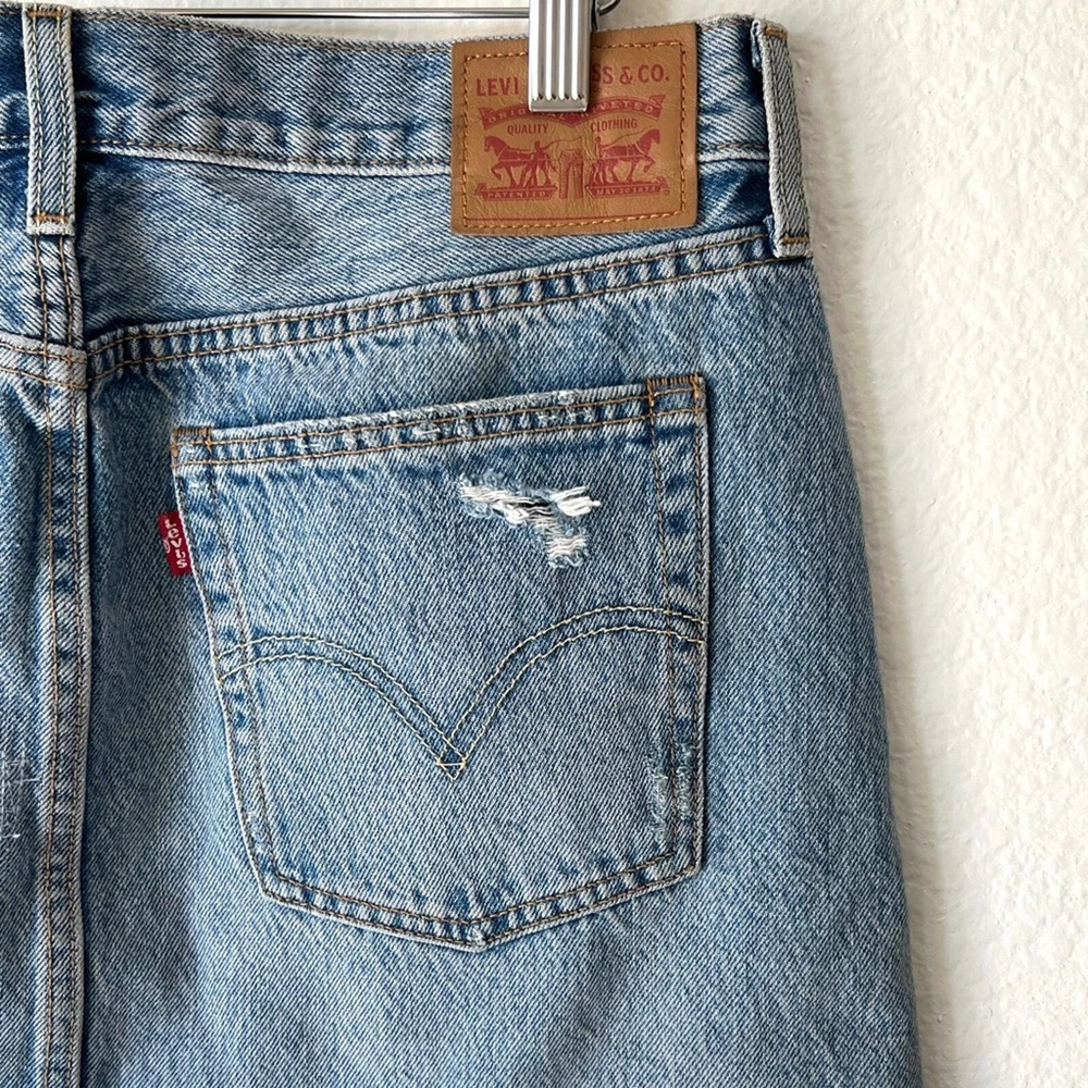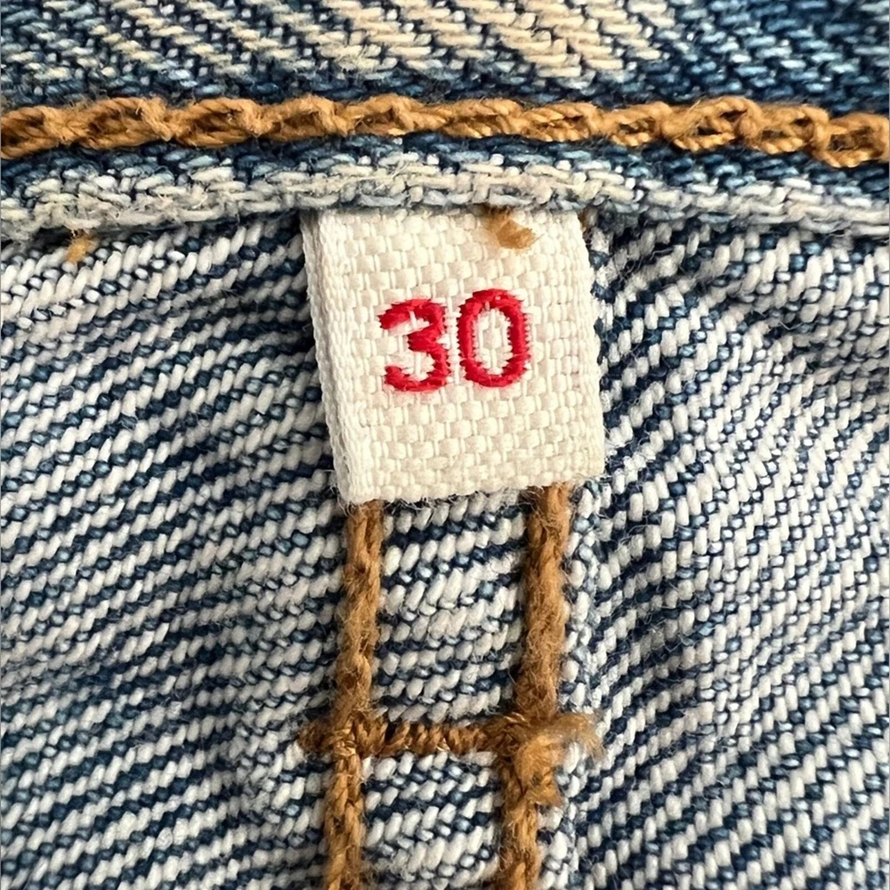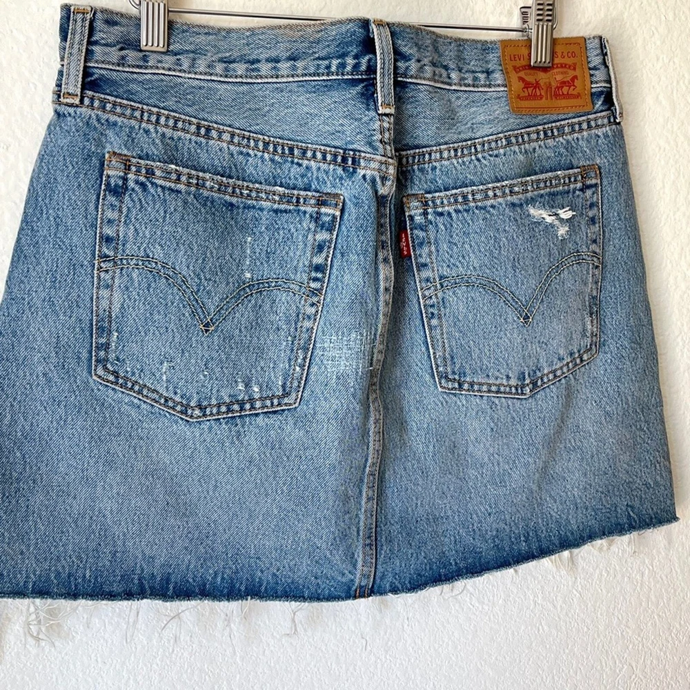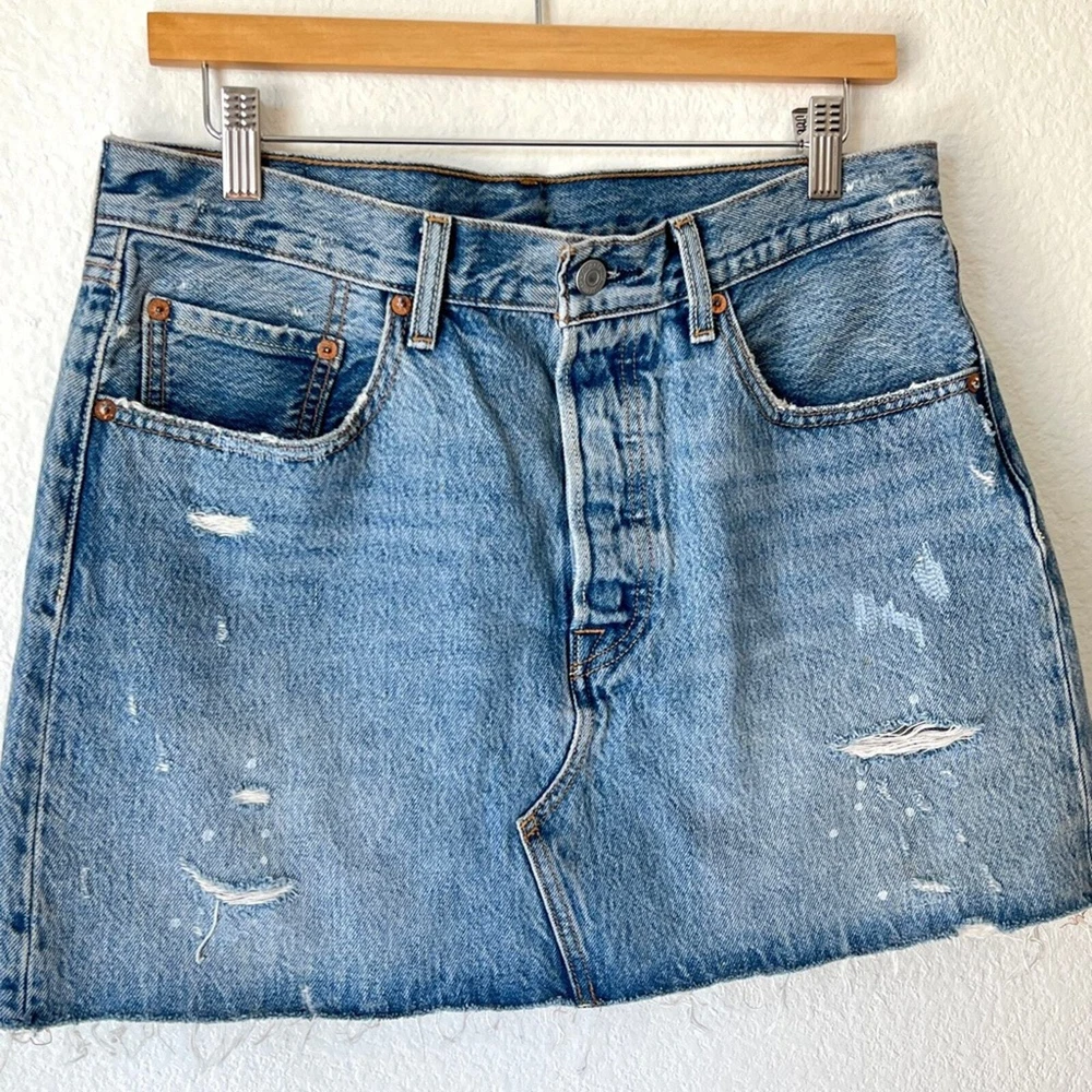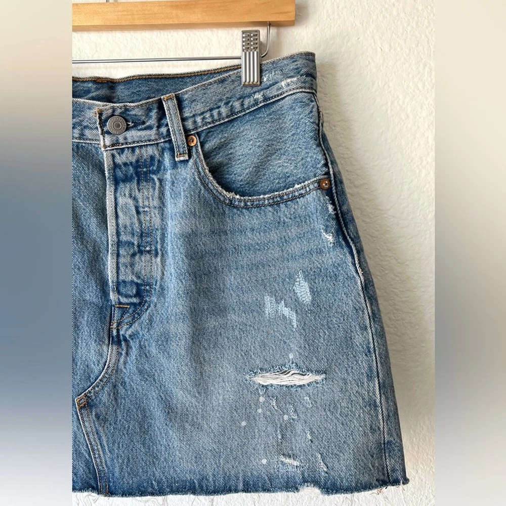 Distressed denim skirt. Great medium blue. Button fly. 100% cotton. Labeled Size 30" Waist 16.5 inches Length 15 inches