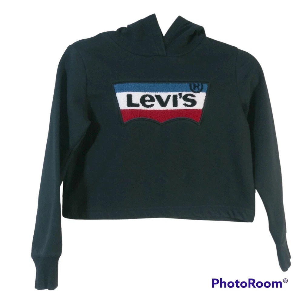 LEVIS BIG GIRLS BLACK FLEECE CROPPED HOODIE SIZE M Girls 10-12 years Made with super soft fleece Fleece print chenille logo patch at the front for a textural finish Hooded Cropped gently worn approximate measurements pit to pit 17" length 15"