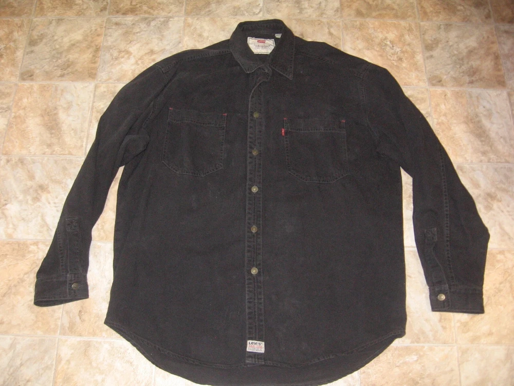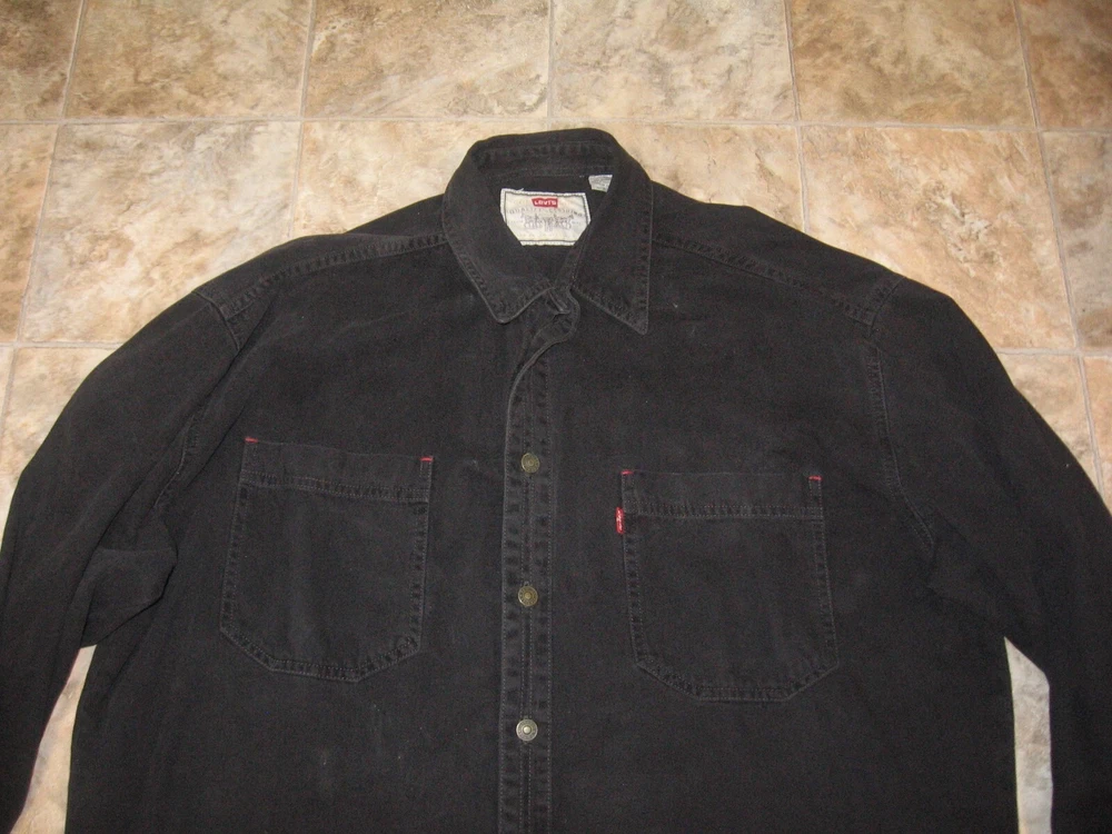 UP FOR AUCTION IS A LEVI'S SHIRT, SIZE MEN'S LARGE, ARM PIT TO ARM PIT: 27", TOP TO BOTTOM: 32", 100% COTTON. EACH METAL BUTTON HAS THE LEVI'S LOGO ON THEM.