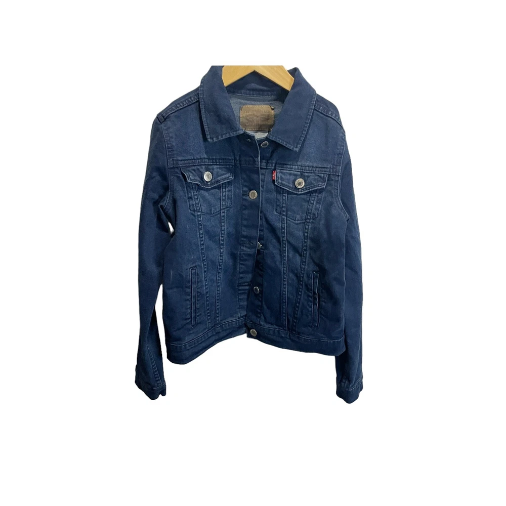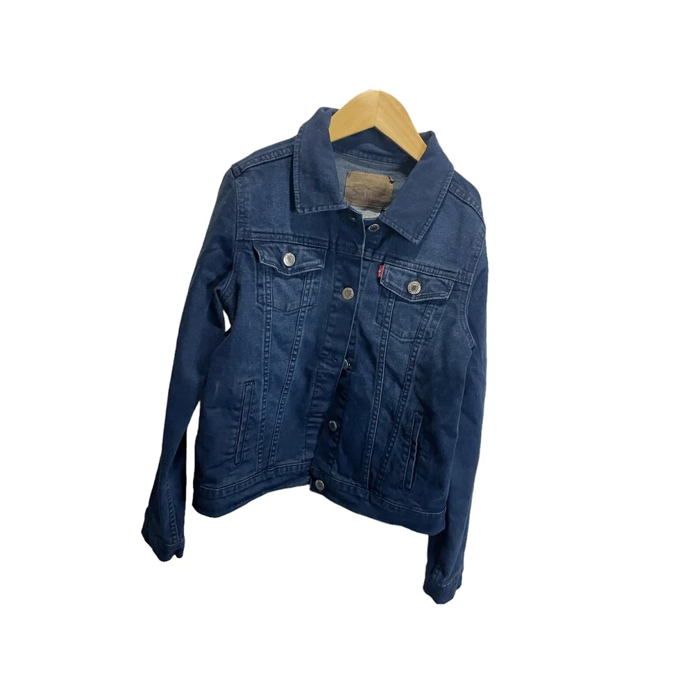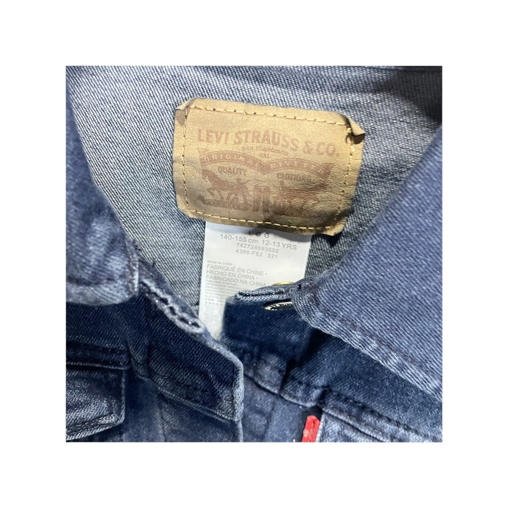 This Levi's Levi Strauss girl's denim basic trucker jacket in size L is a must-have for any young fashionista. The jacket features a solid dark blue color and is made of 100% cotton denim fabric, making it perfect for any season. The long sleeves and button closure provide extra warmth on chilly days, while the pockets add a touch of convenience and style. Whether you're heading to a party, casual outing, or business meeting, this Levi's trucker jacket is versatile enough to go with any outfit. The jacket is designed with girls in mind and is perfect for those who love the basic style with a touch of flair. Add this Levi's Levi Strauss girl's denim basic trucker jacket to your wardrobe today! new with tags All Measurements Are Approximate Please email us with any questions! ** LIKE THE ITEM BUT NOT THE PRICE, REASONABLE OFFERS ACCEPTED