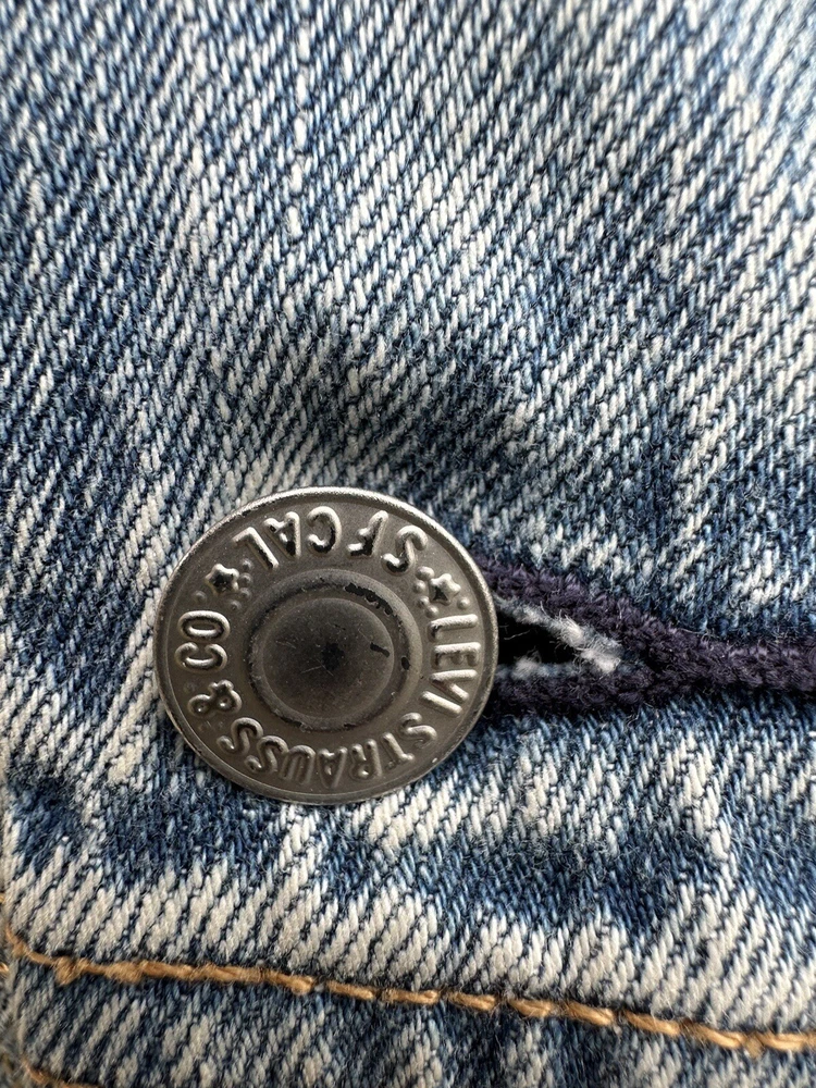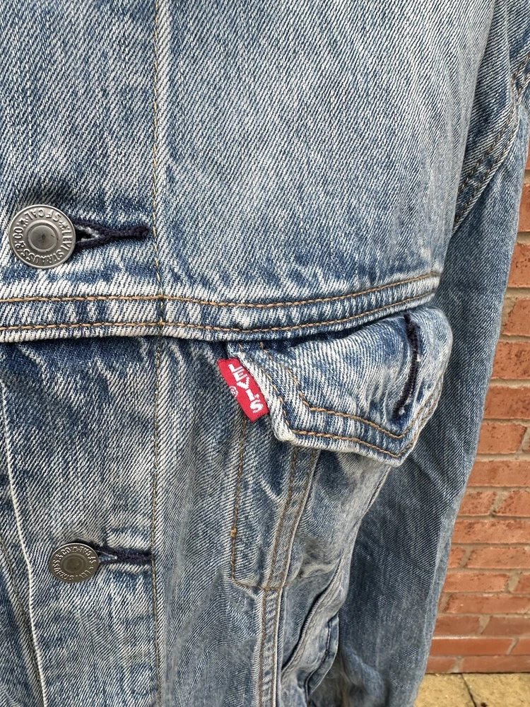 Accents: Button Outer Shell Material: Cotton Size Type: Regular Personalise: No Collar Style: Point Size: L Colour: Blue Style: Denim Pattern: No Pattern Closure: Button Occasion: Casual Theme: USA, Japanese Handmade: No Fit: Regular Vintage: Yes Lining Material: Cotton Fabric Type: Denim Performance/Activity: Casual Type: Jacket Model: Levi's Trucker Country/Region of Manufacture: India Brand: Levi's Features: Buttons, logo Season: Autumn, Spring, Summer, Winter Product Line: Levi Trucker Department: Men Garment Care: Machine Washable