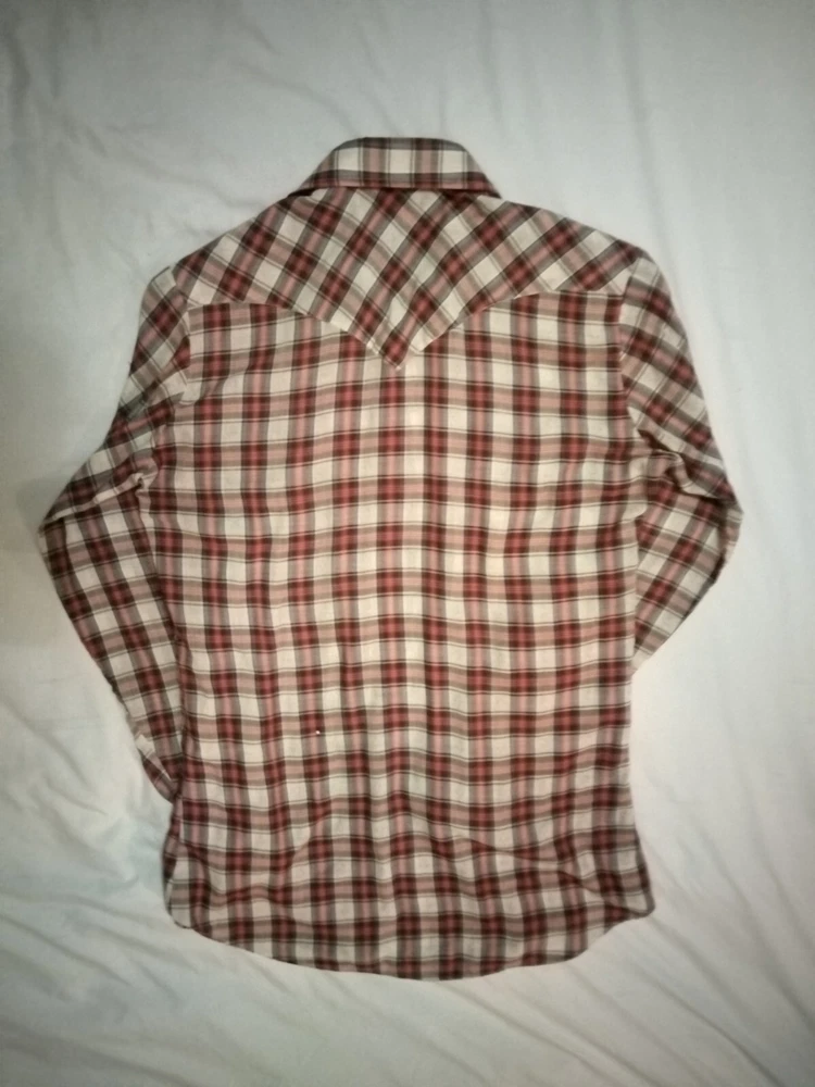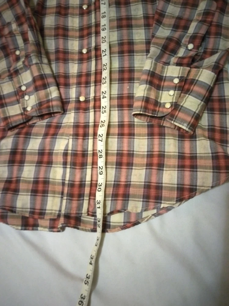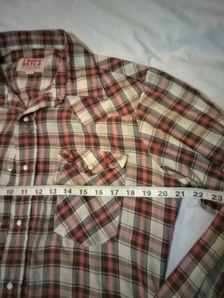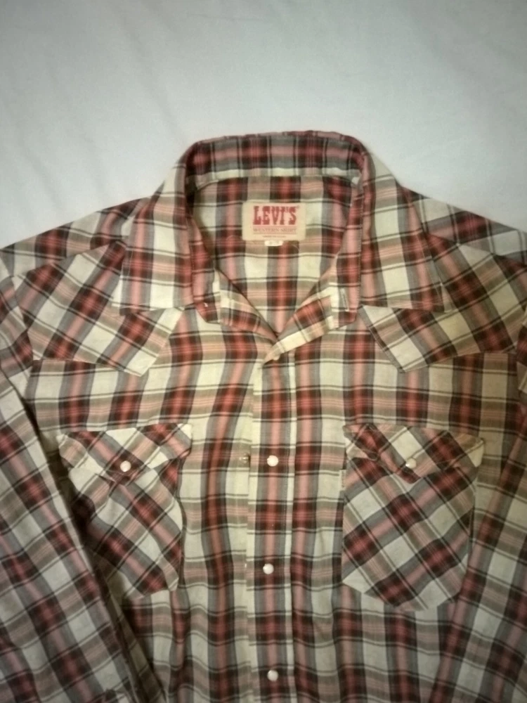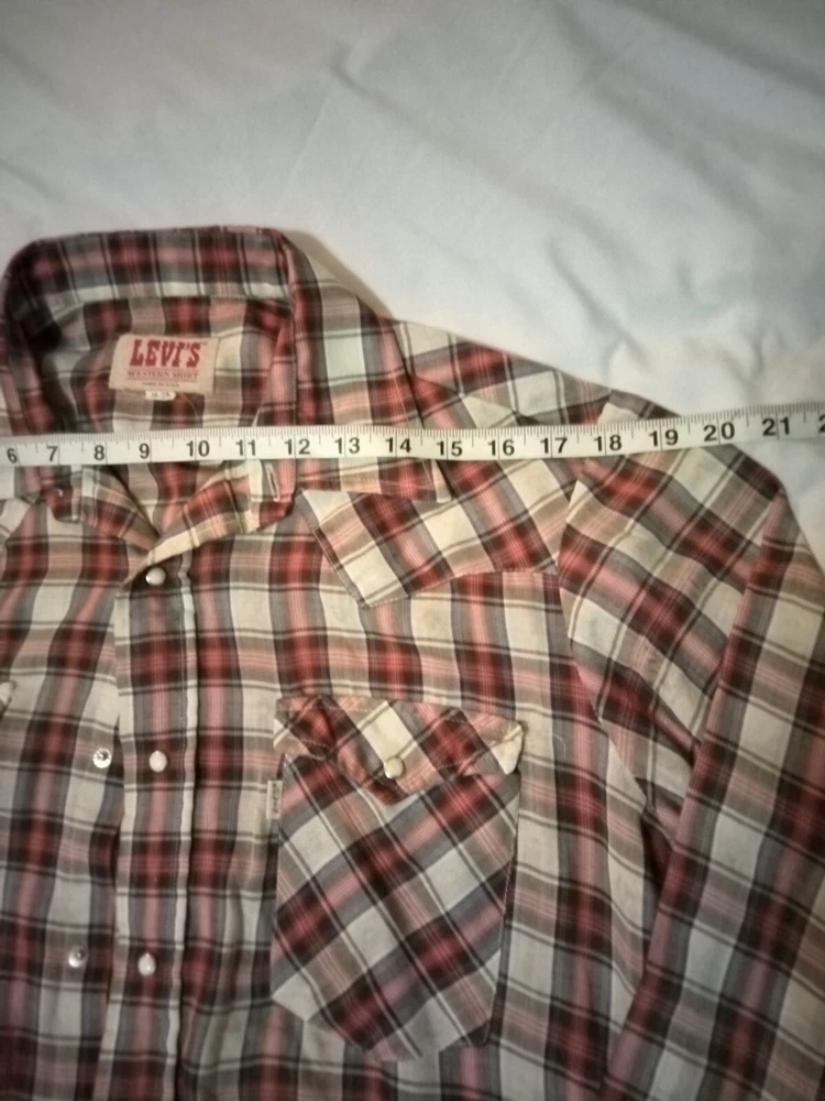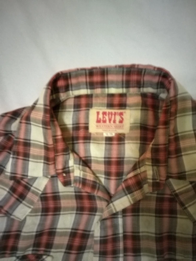 This Levi's Vintage Western Shirt features a classic collar with pearl snaps, a plaid pattern in multicolor, and a lightweight cotton blend fabric. It has a size of 16-35 and a chest size of 42 inches. The shirt is designed in a Western style with a classic fit, suitable for casual occasions. Made in the USA, this long sleeve button-up shirt embodies a Western and Rockabilly theme.