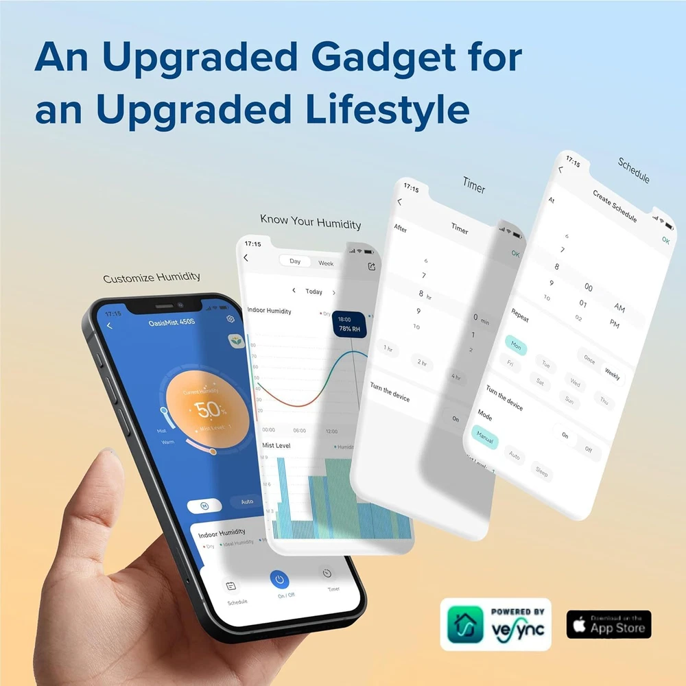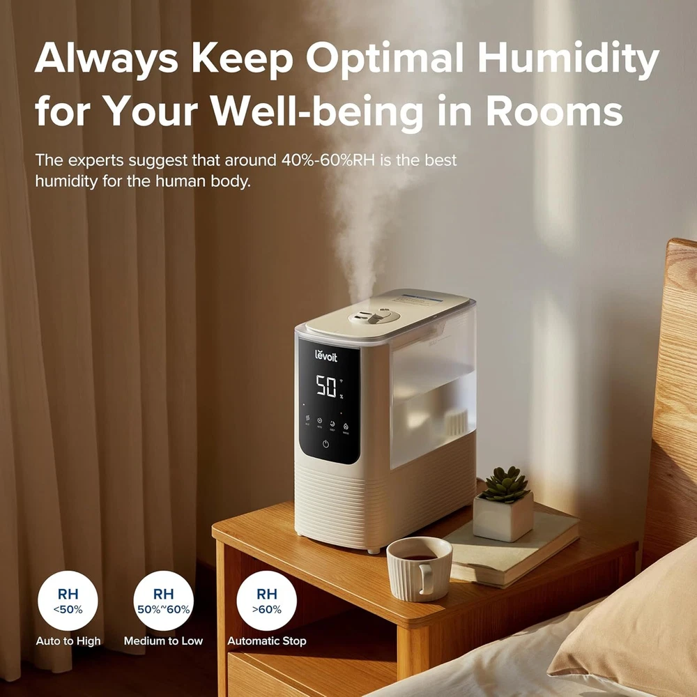 LEVOIT Humidifiers for Bedroom Home, Smart Warm and Cool Mist Air 4.5L, White Product Details Brand: LEVOIT Special Feature: Warm and Cool Mist for Faster and Healthier Relief, Timer, Remote Control, Schedule, Smart Vesync APP, Aroma Diffuser, Humidistat Warm and Cool Mist for Faster and Healthier Relief, Timer, Remote Control, Schedule, Smart Vesync APP, Aroma Diffuser, HumidistatWarm and Cool Mist for Faster and Healthier Relief, Timer, Remote Control, Schedule, Smart Vesync APP, Aroma Diffuser, Humidistat See more Color: White Floor Area: 430 Square Feet Operation Mode: Ultrasonic CapacityRuntime: 4.5 Liters45 hours MaterialPower Source: BPA-Free Meterial, suitable for babies and adultsETL Certified AC Power Adapter , : Dealing with sinuses, congestions, and restless sleep. Our humidifier with warm and cool mist, combined with a double duct design, offers quicker and more even humidification. Get instant relief and embrace life's comforts and : Enjoy your ideal humidifier choice. Its warm and cool mist features not only ensure a healthier humidifying process by reducing white dust from water but also offer safety with the warm mist temperature set between 40℃ and 60℃ : Tailor your preferred humidity effortlessly using the Vesync app or simply activate Auto Mode on the display to maintain humidity levels between 40 percent and 60 percent RH. Set it up and relish in the soothing ambiance today : Manage humidifiers for your bedroom and home remotely at anytime and anywhere. Plus, create schedules that sync with your daily routine, enabling the humidifier to seamlessly turn on and off according to your lifestyle : Our top-fill design simplifies the process, with just one step to fill the 4.5L tank. No more spills or struggles. Cleaning is a breeze too, as the wide opening ensures easy access for a healthier environment : Feeling tired after a long day. Add 2-3 drops of your favorite essential oil to the tray and indulge in a unique, fragrant, and soothing home atmosphere : Enjoy dual mist nozzles for easy mist direction adjustment and a user-friendly handle design for quick water tank maintenance, enhancing your experience - : Upgraded triple noise reduction technology helps operate at minimum levels for warm mist, making it a great bedroom humidifier. Turn off display lights and enjoy this peaceful bedtime : For the well-being of you and your family, as well as prolong the life of your humidifier, it's advisable to clean and throughly dry the humidifier after use. Refer to the user manual for detailed instructions on cleaning and storage of humidifier Introduce our OasisMist Smart Hotspring Mist Humidifier. With Double Wind-Blow Design and Hytrate Mist Technology, it gives you a faster, healthier, smarter, and easier humidification experience. Also, distilled/ purified water is preferred for your health.Features:√ Warm & Cool Mist Humidifier -- Faster & Healthier Humidification√ Smart Home, Smart Life -- Remote Control, Schedule, Timer, Plant Care, Voice Control√ A Large Water Tank of 4.5L, Covers up to 430 ft²√ Lasts Up to 45 Hours, More Than 5 Nights of Sleep√ Easy Top-Fill Design√ Essential Oil Tray√ Dual 360 Rotating Nozzle√ Easy Handle Design√ Convenient LED DisplaySpecifications:Product Dimensions: 10.8 x 6.0 x 11.97 in / 27.4 x 15.2 x 30.4 cmProduct Weight: 5.3 lb / 2.4 kgWhisper-Quiet Operation: As low as 26dBEffective Range: 215–430 ft² / 20–40 m²Toubleshooting1.LEVOIT Water Filter to use: Capture and filter fine impurities and particles, to improve humidifying efficiency in a healthier to change: Generally lasts 1 month depending on hardness of water.Where to buy: Please search ### on Seller.2. LEVOIT 10 Pack Humidifier Mineral Absorption to use: Prevent Stubborn Mineral Buildup and Increase Humidification to change: Generally last 2-4 weeks (Depending on the hardness of the water).Where to buy: Please search ### or Levoit humidifier replacement filter.3.LEVOIT Aroma PadsWhy you need it: To help emit a stronger fragrance and protect the fragrance to change: We suggest the aroma pads be changed every 4 weeks for better performance.Where to buy: Please search B0B8MD45FB or Levoit aroma pads for more information.