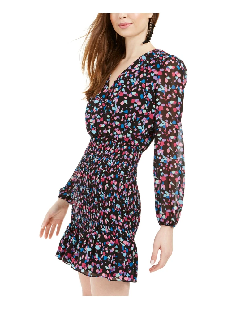 LEYDEN Womens Black Printed Long Sleeve V Neck Short Sheath Dress L
